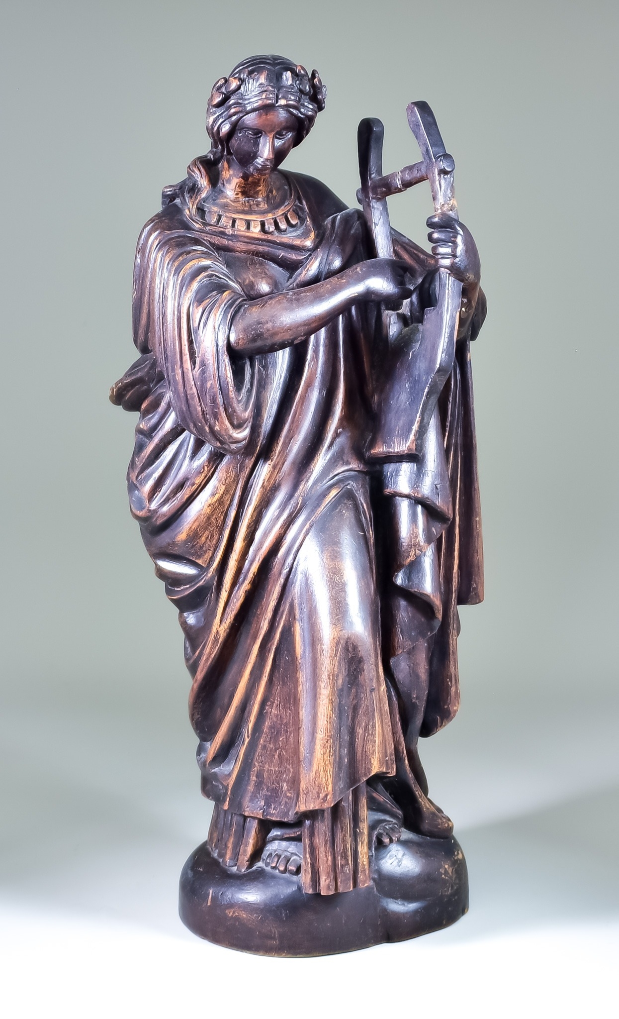 A Carved Wood Figure of Erato, 19th Century, modelled standing wearing flowing robes and holding a lyre type instrument, 19.5ins high