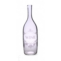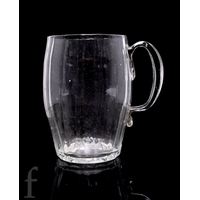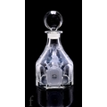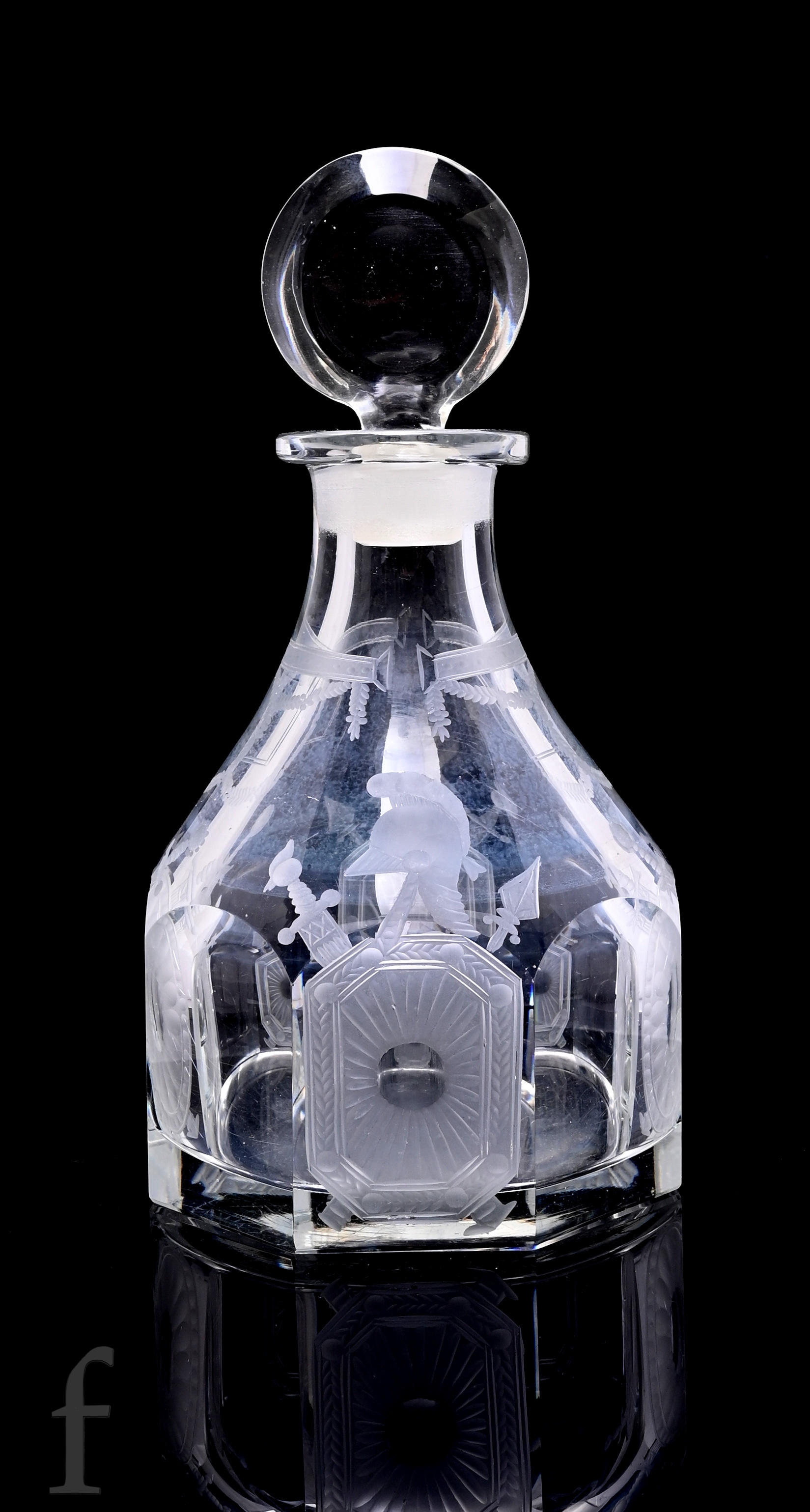 A 19th Century clear crystal decanter of low shouldered form with a slice cut body, narrow collar neck and large disc form stopper, the body cut with alternating panels of shields, swords and helmets below a laurel garland border, height 22cm.