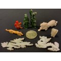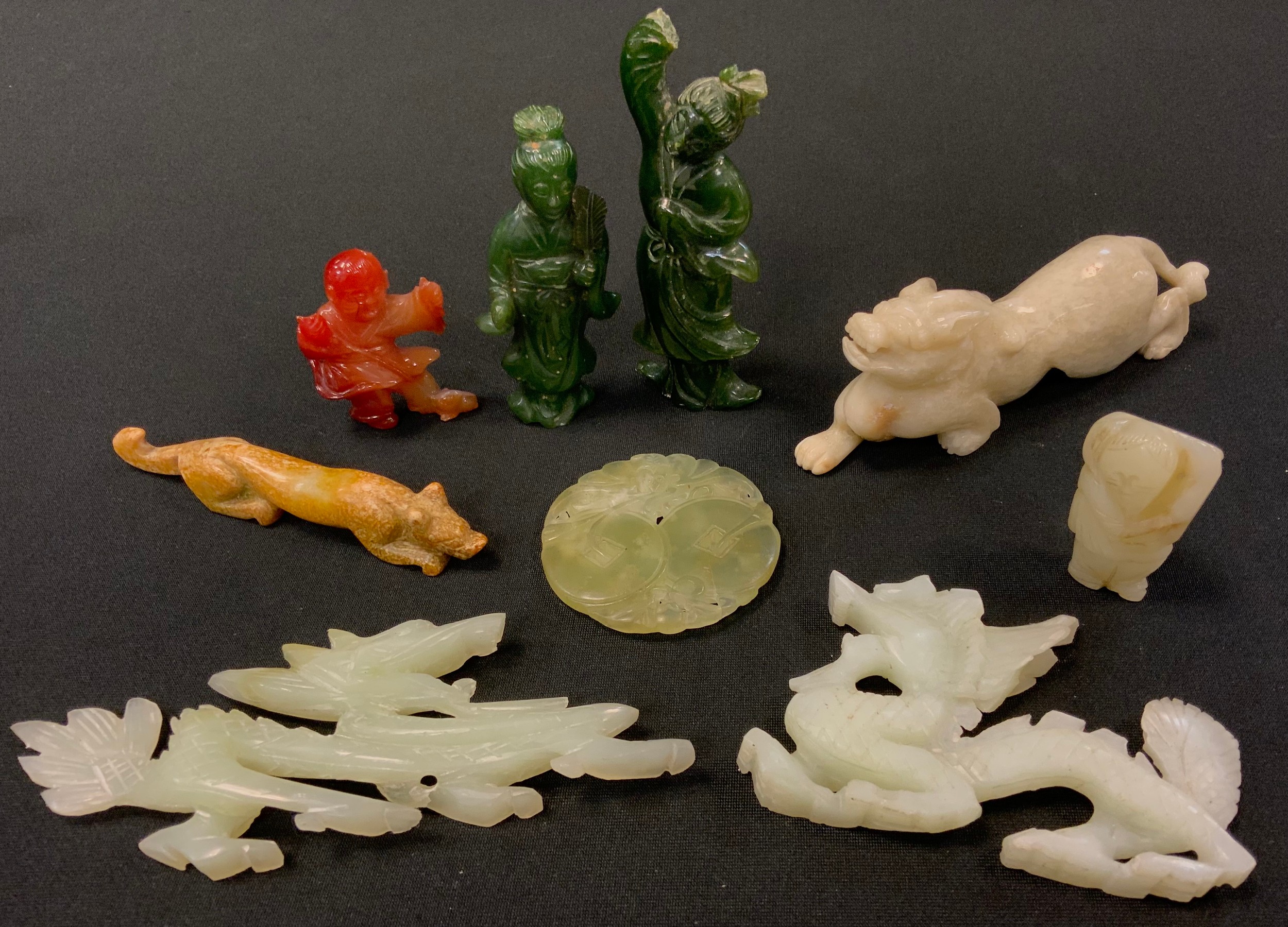 A carved soapstone figure stalking Foo dog; others, dragons, elders, stylised fox etc (9)