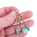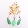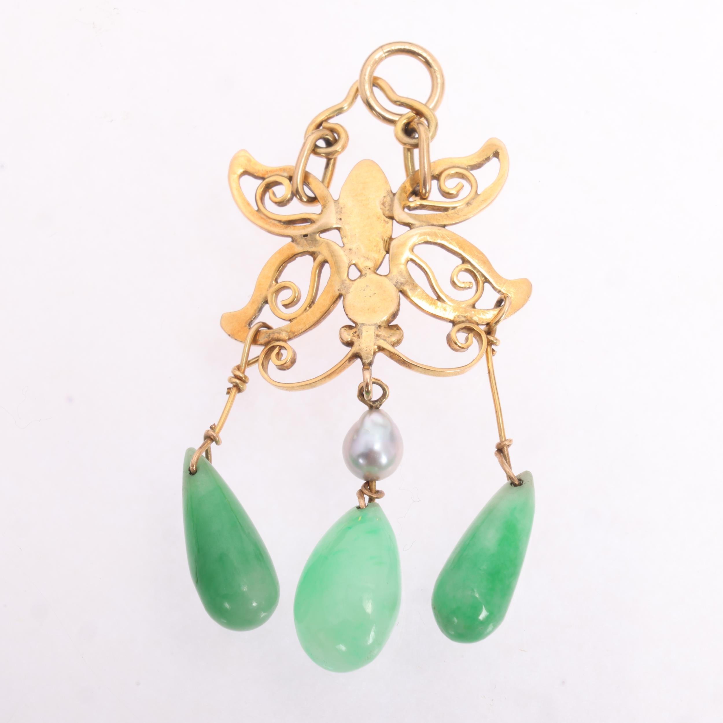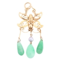 A Chinese 9ct gold jade and pearl butterfly pendant, set with polished teardrop jade, suspended from openwork butterfly mount, unmarked mount tests as 9ct, 48.5mm, 4.4g