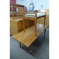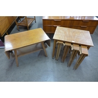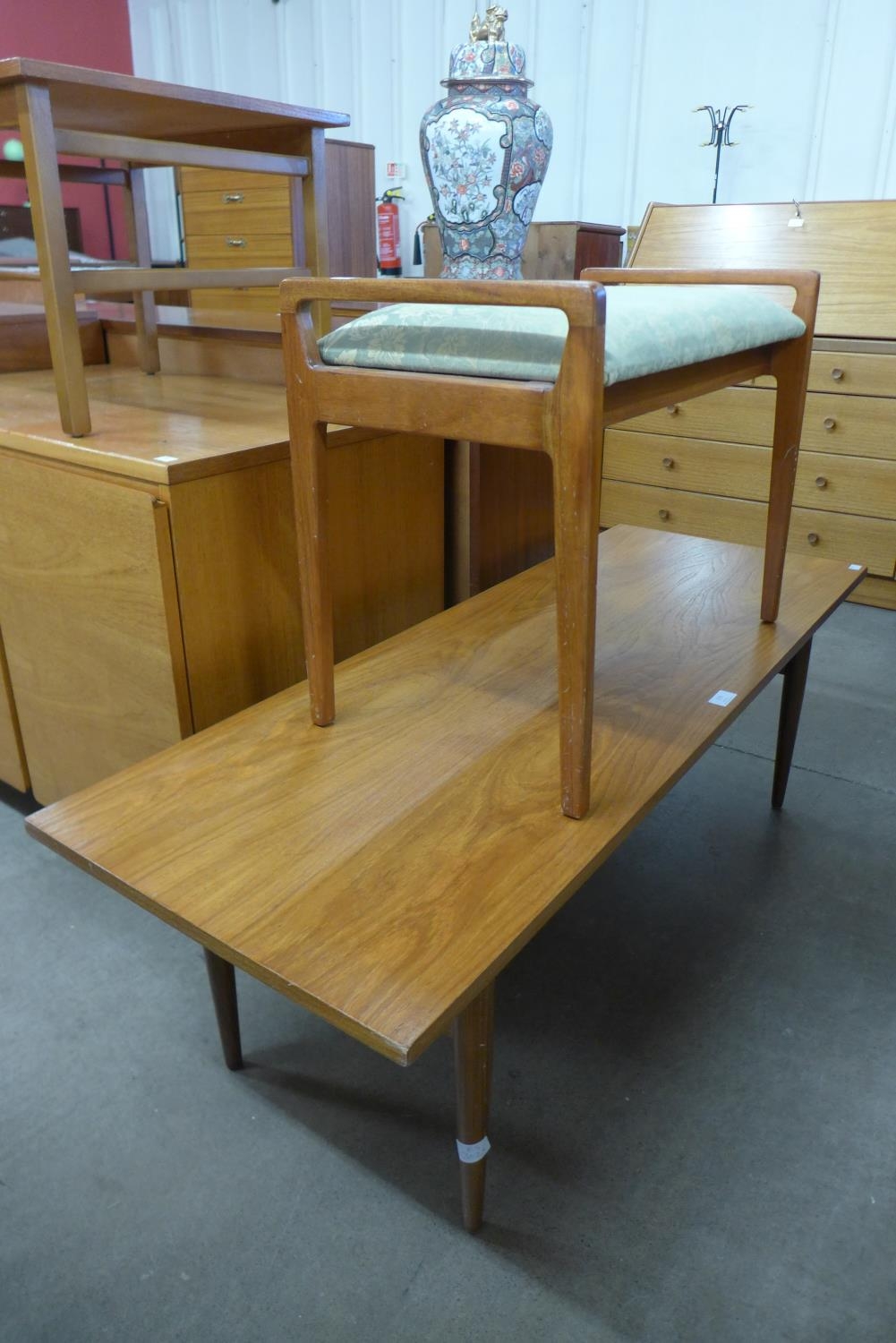 A teak coffee table and a teak stool