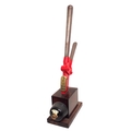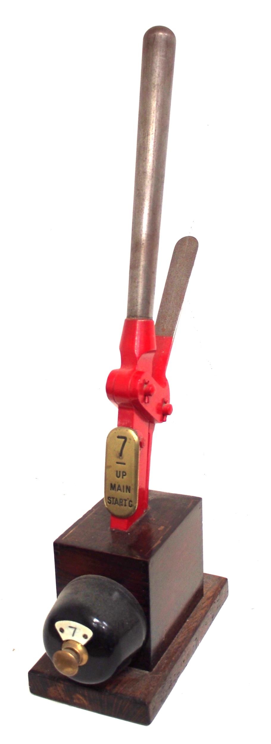 GWR signal box lever top with clasp & brass lever plate "7 UP MAIN STAT'G" & plunger plated "7" mounted on wooden stand. (B1) (Dispatch by Mailboxes/Collect from Banbury Depot)