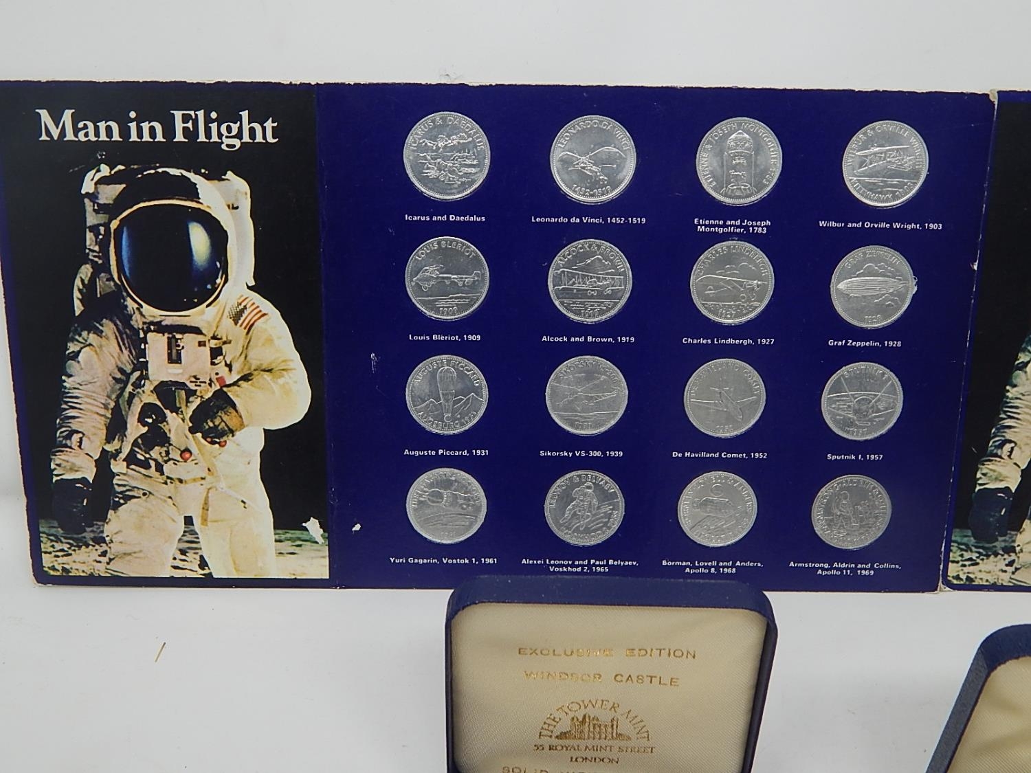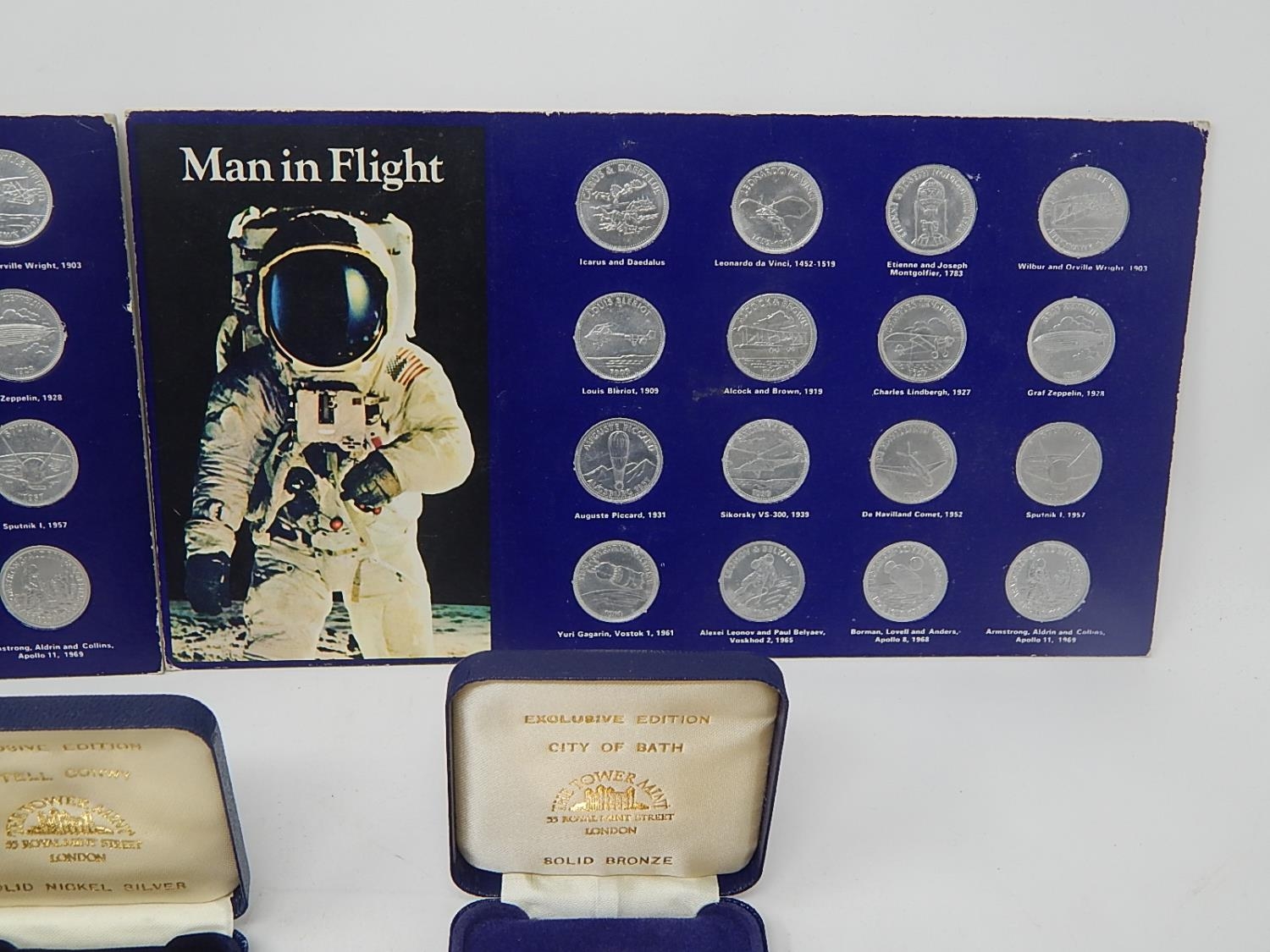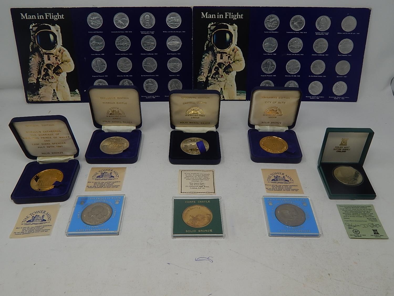Man in Flight set of 32 Coins; Castle Conwy Medallion in fitted case; St Pauls Cathedral Marriage of Prince of Wales & Lady Diana Spencer Medallon in case; City of Bath Medallion in case; Isle of Man 1981 Crowns (2) in case; Isle of Man 1980 Diamonf Finish Crown in case; Corfe Castle Bronze Medallion in case