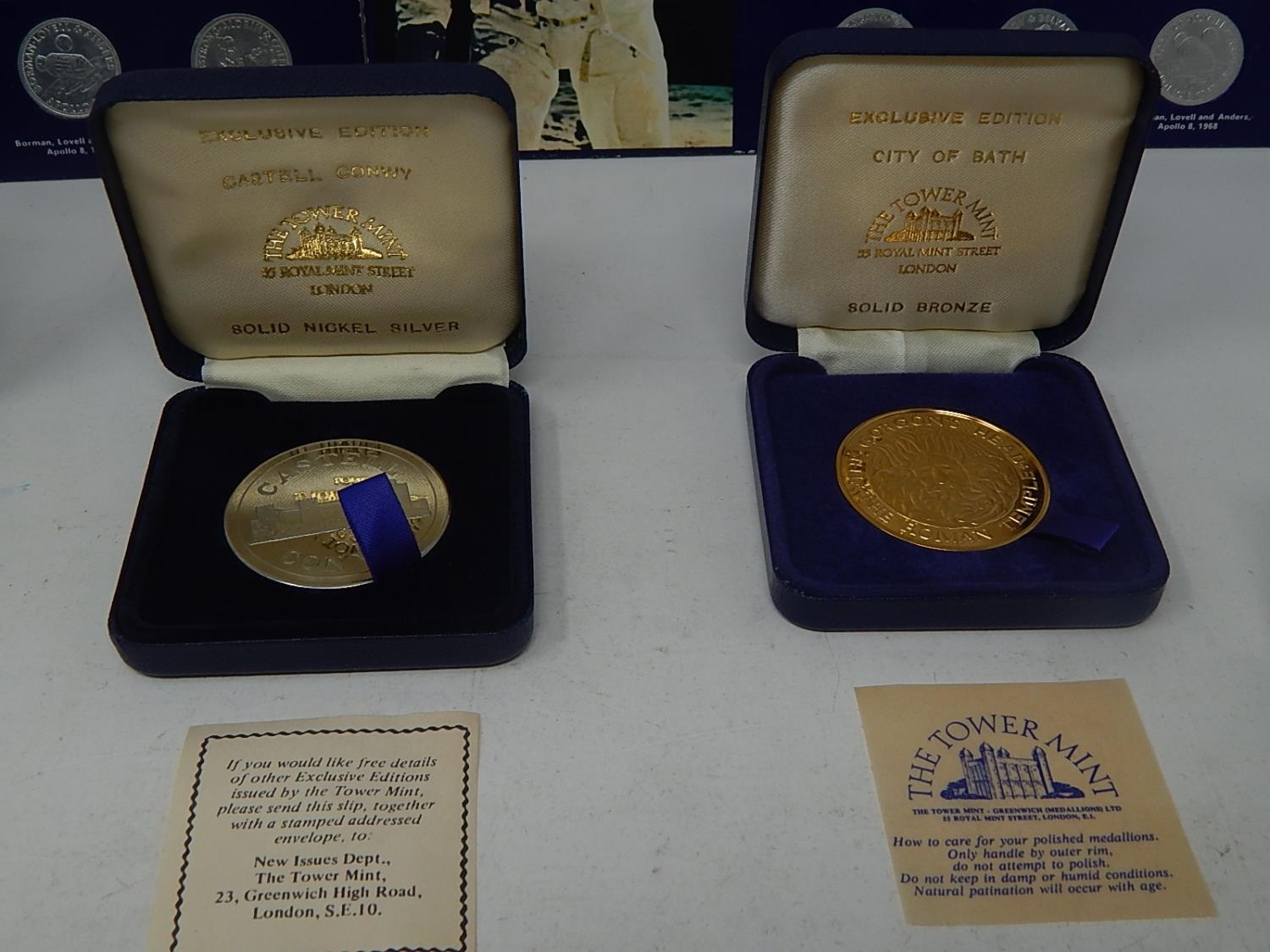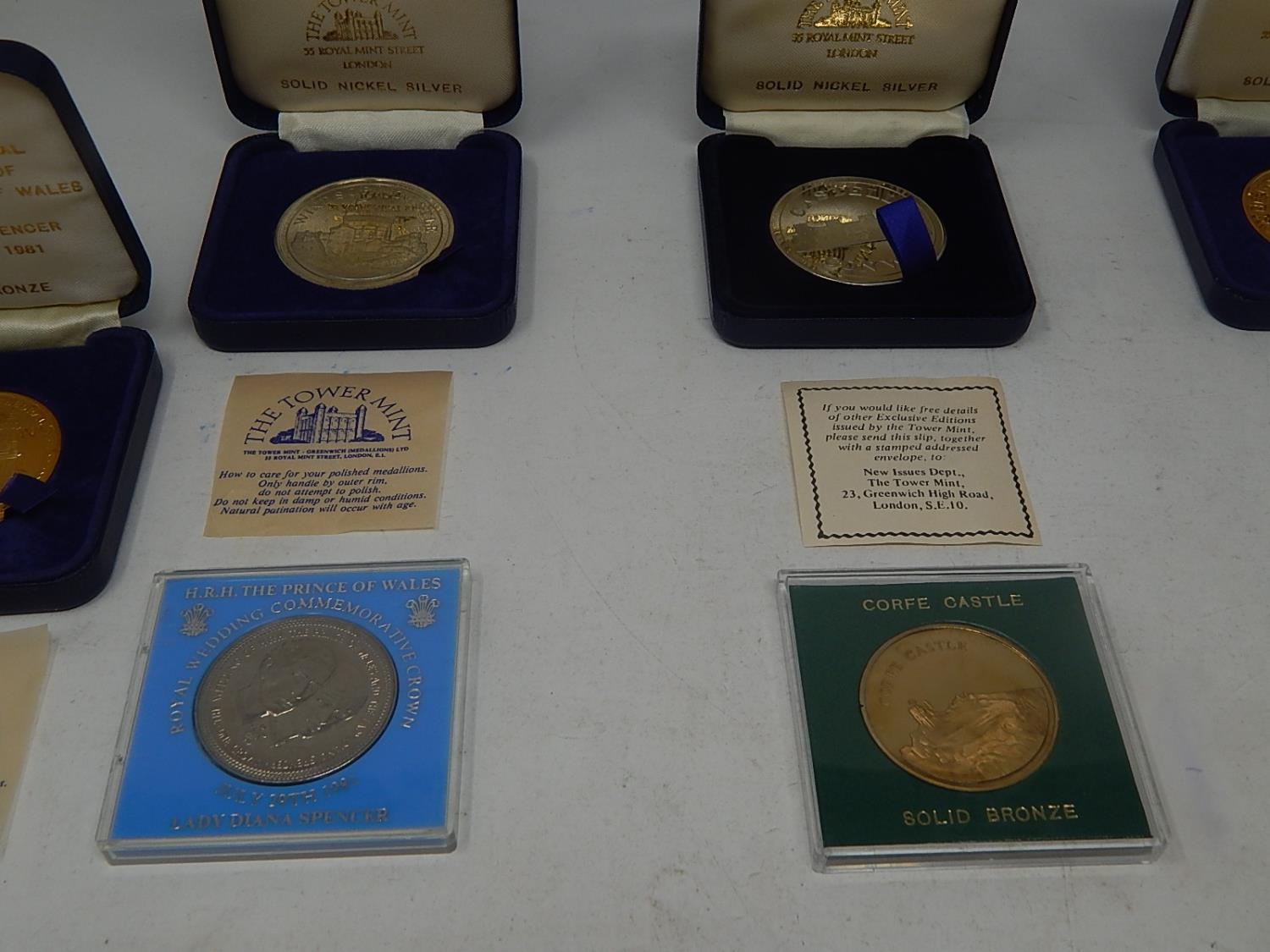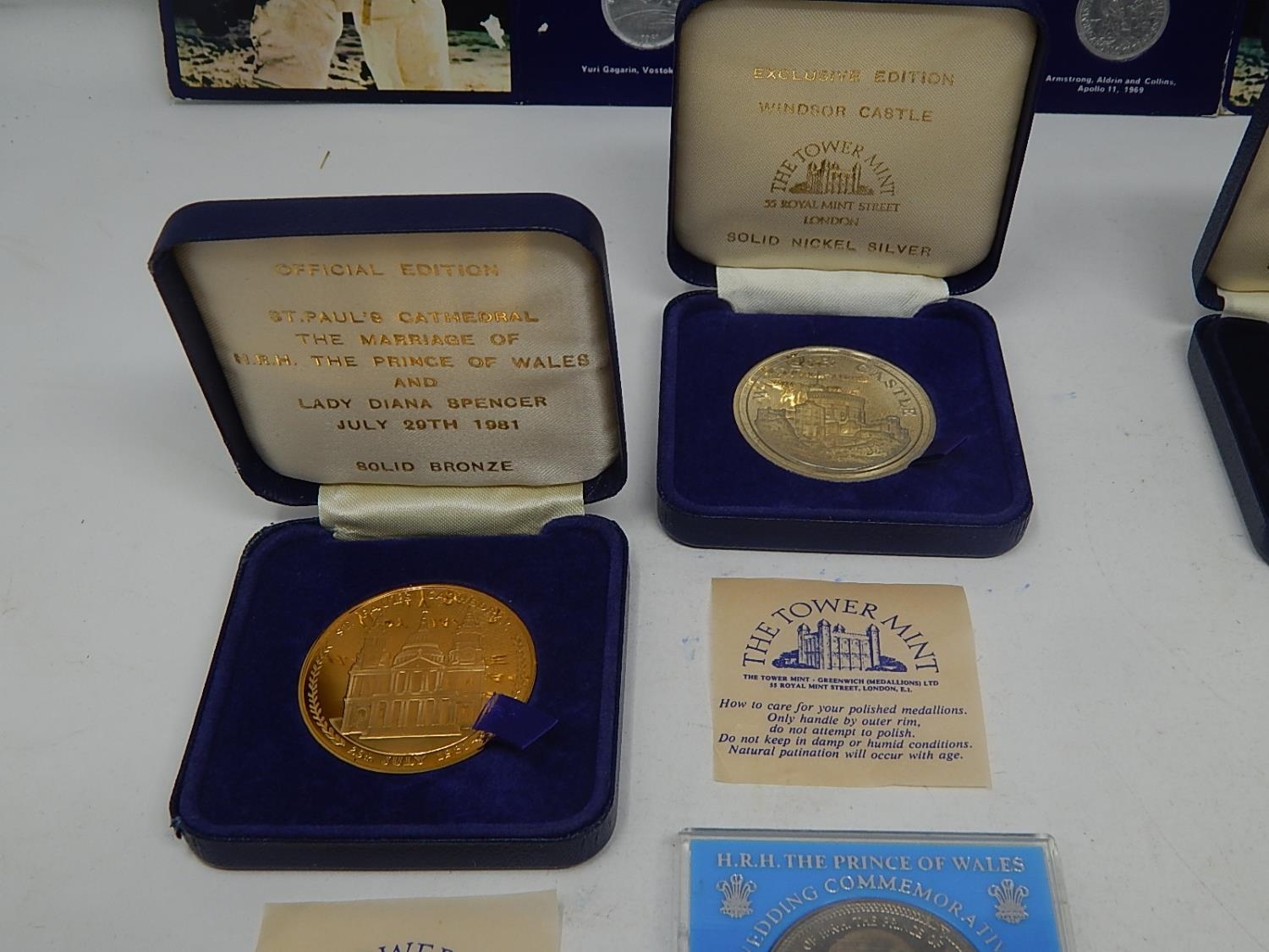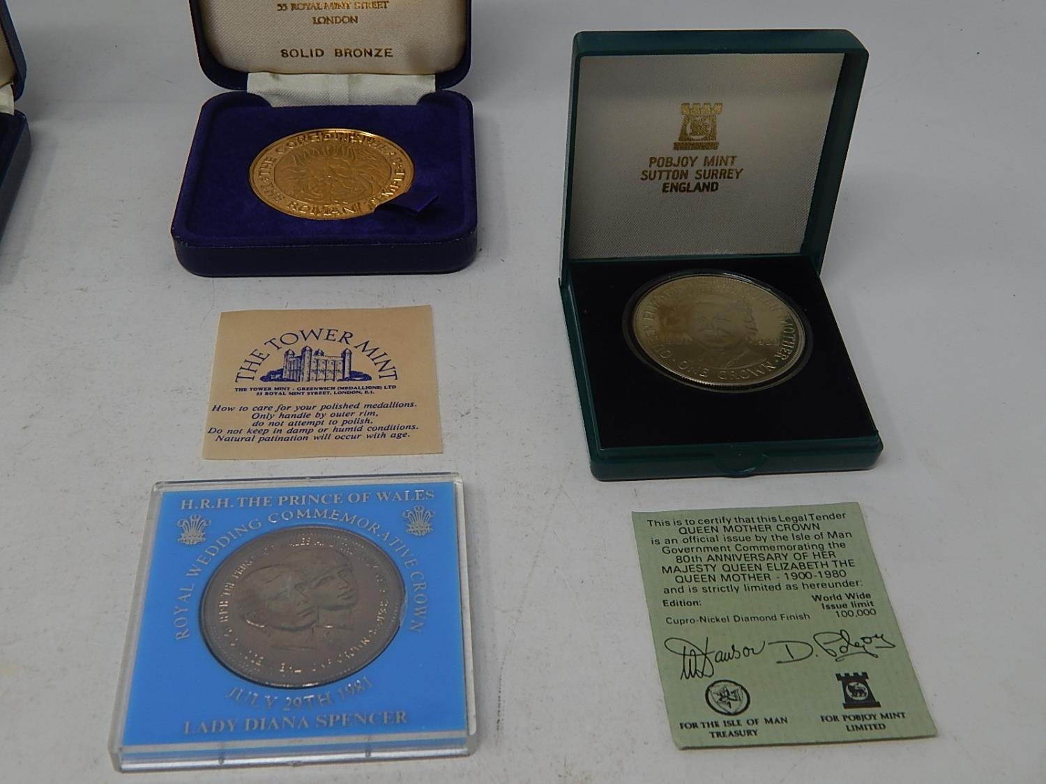 Man in Flight set of 32 Coins; Castle Conwy Medallion in fitted case; St Pauls Cathedral Marriage of Prince of Wales & Lady Diana Spencer Medallon in case; City of Bath Medallion in case; Isle of Man 1981 Crowns (2) in case; Isle of Man 1980 Diamonf Finish Crown in case; Corfe Castle Bronze Medallion in case