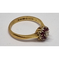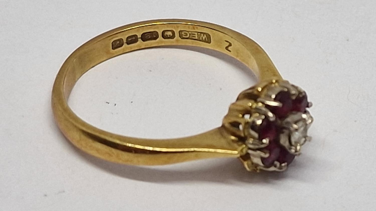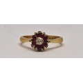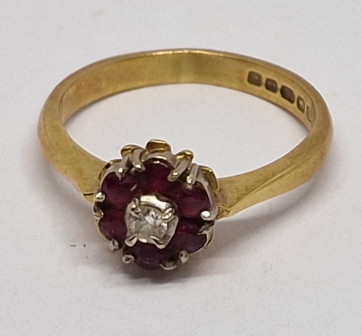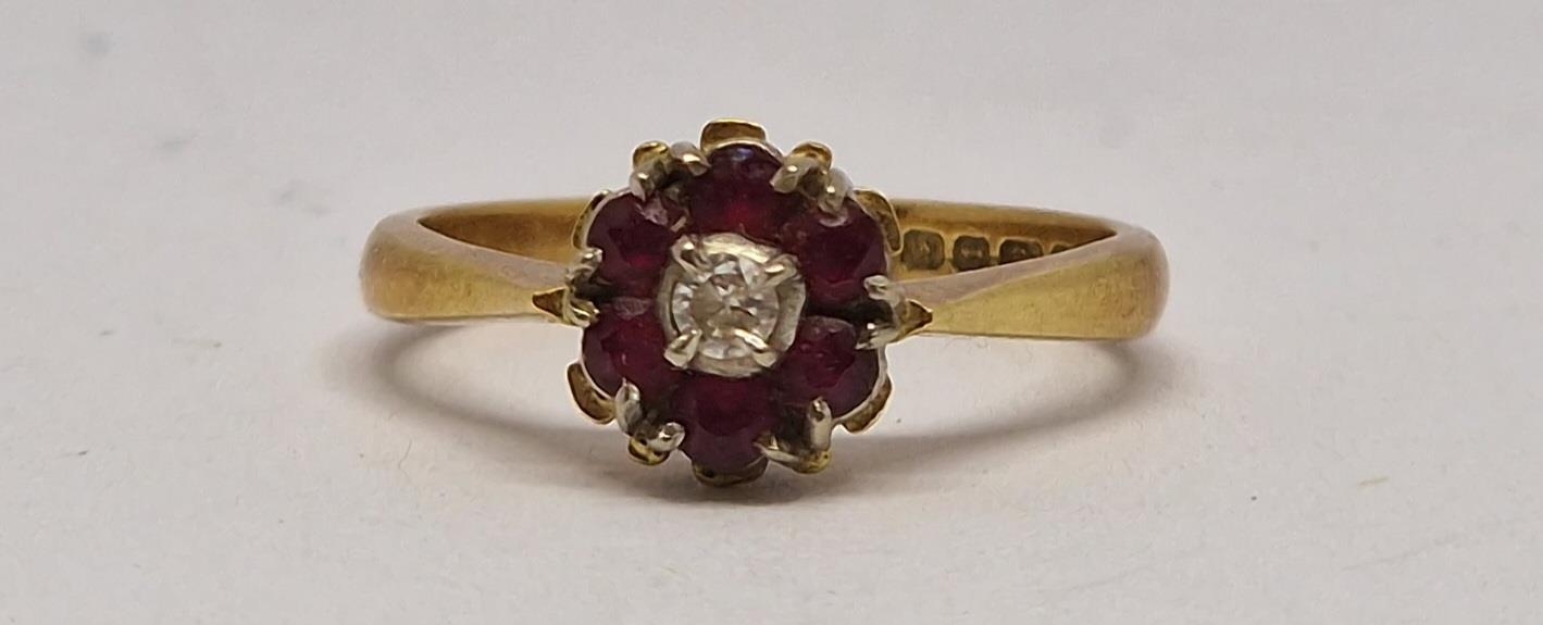 18 CARAT GOLD CLUSTER RING SET SOLITAIRE DIAMOND AND SIX RUBIES - SIZE K (3.1g)