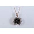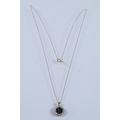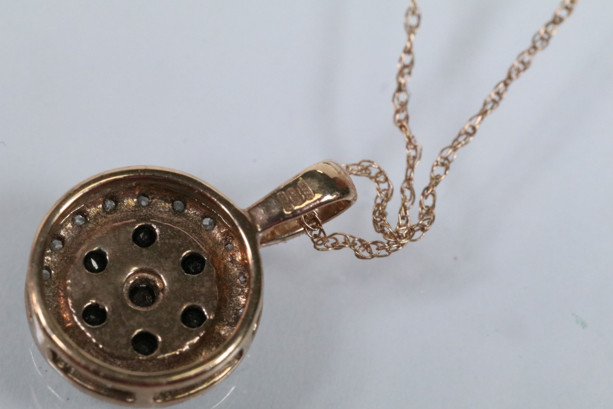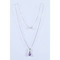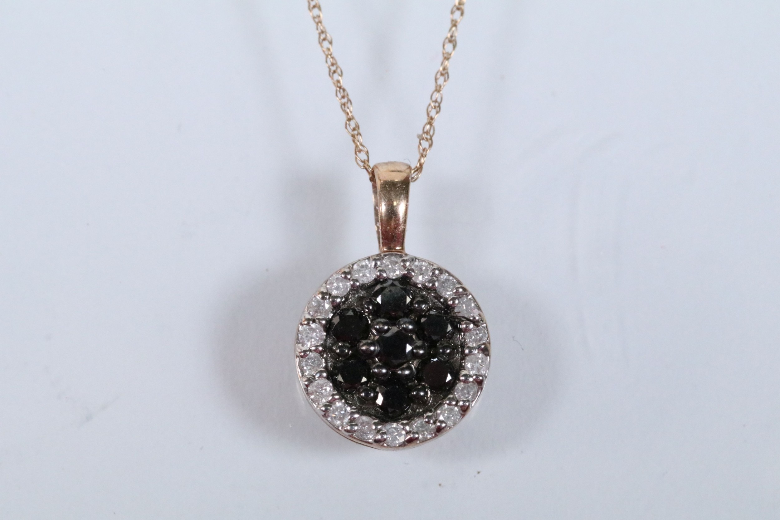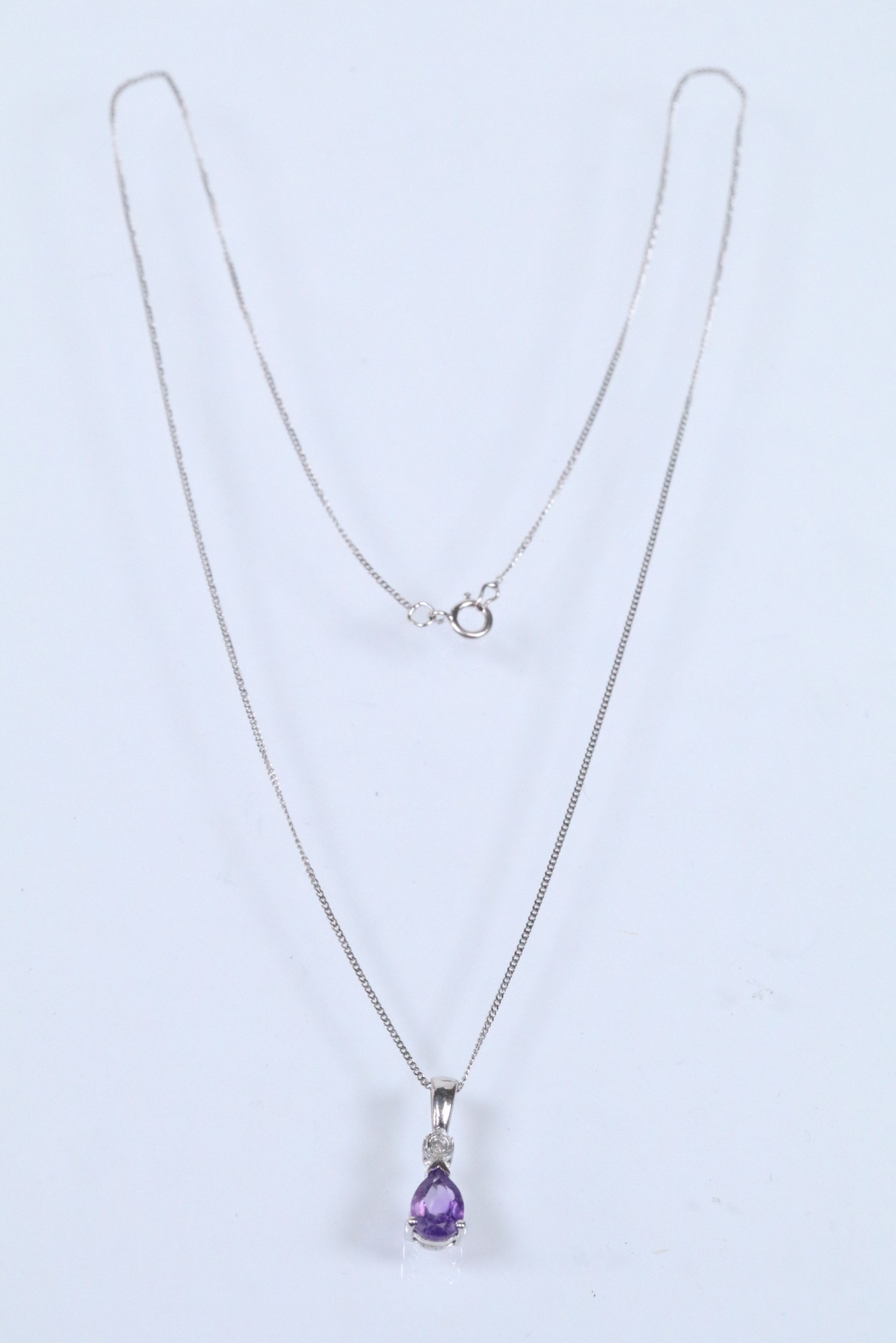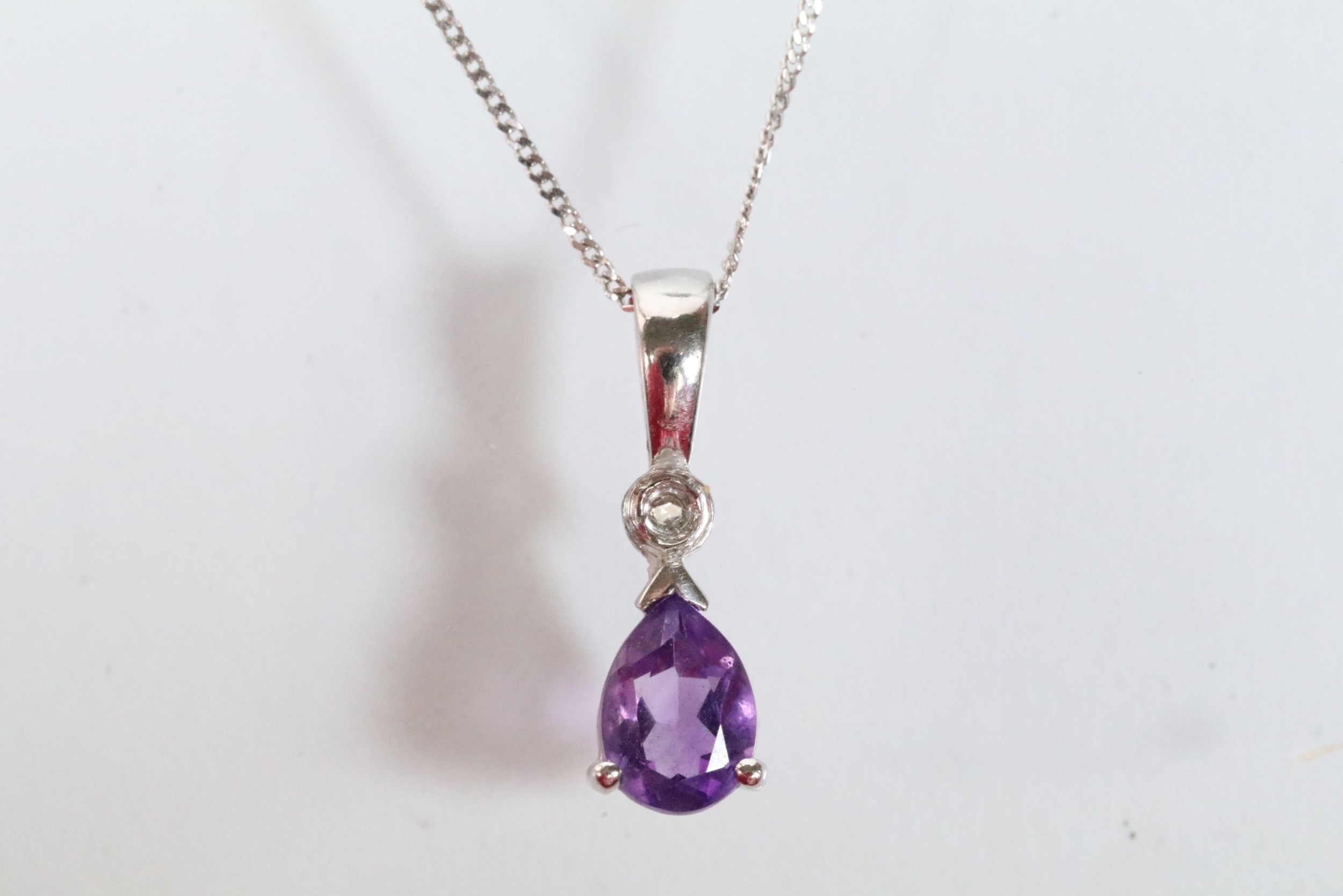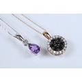Two 9ct gold pendant necklaces to include a black and white diamond pendant on a fine link chain (pendant hallmarked, chain marked 375), white gold chain with amethyst and diamond set pendant (pendant marked dia, chain marked 375). Chains measure 18 and 16 inches.
