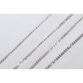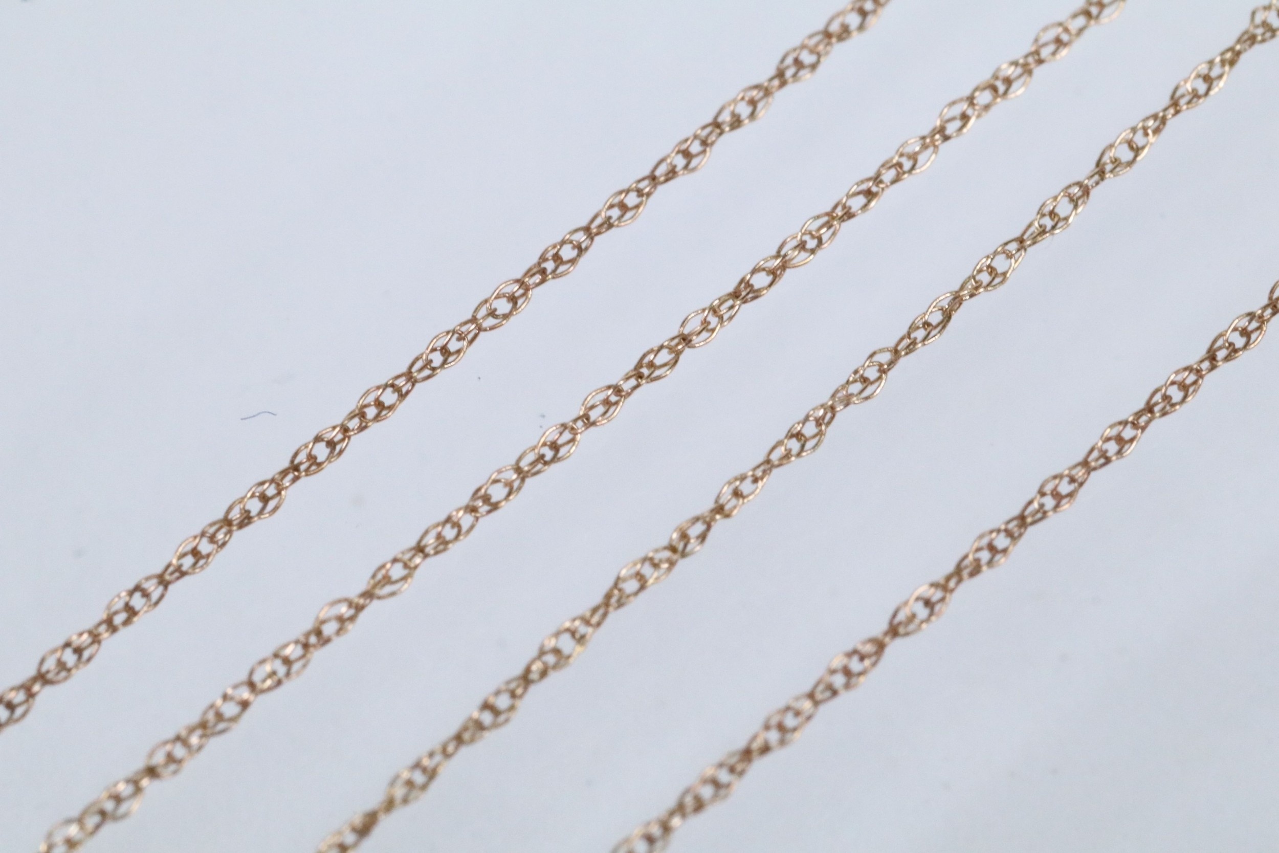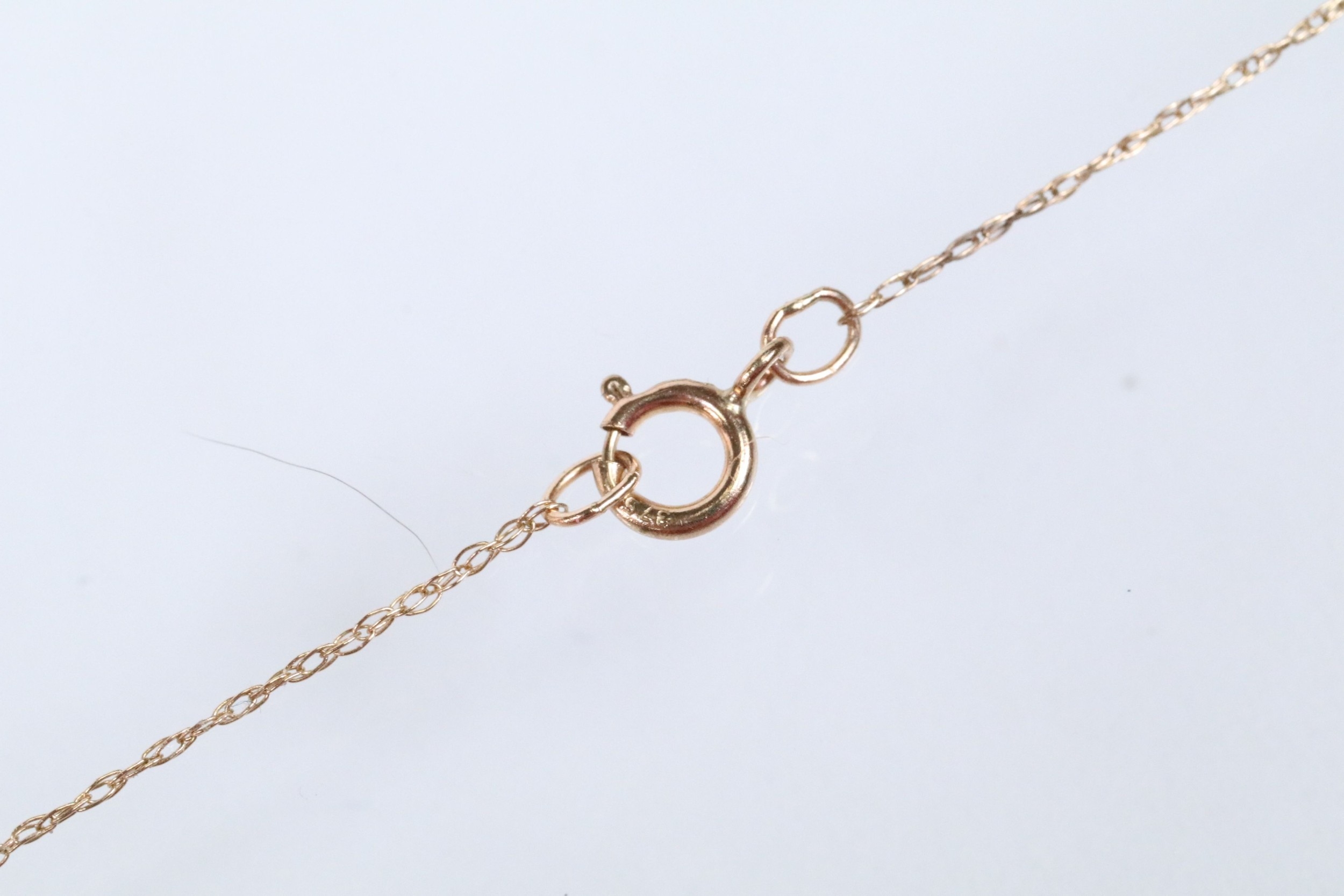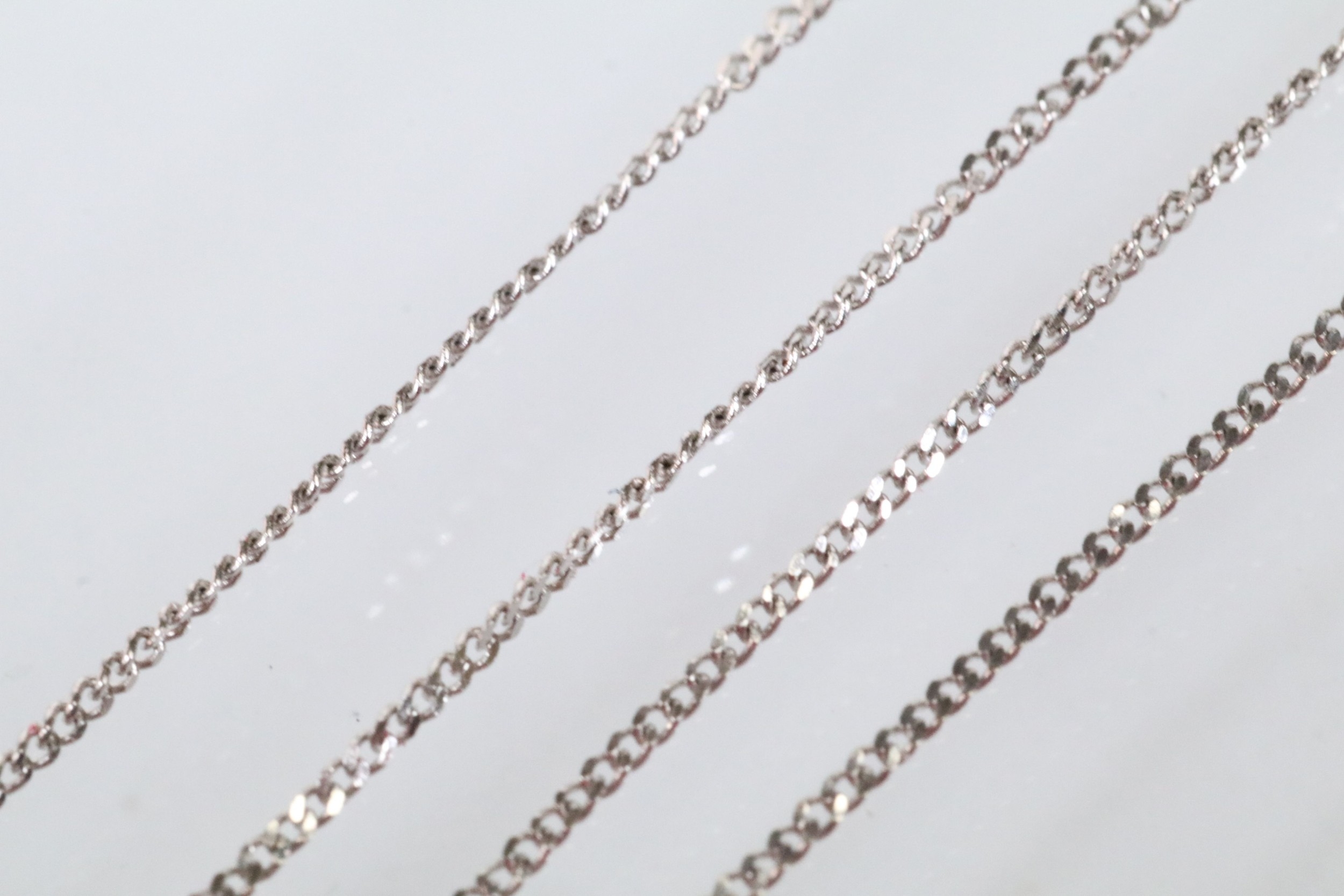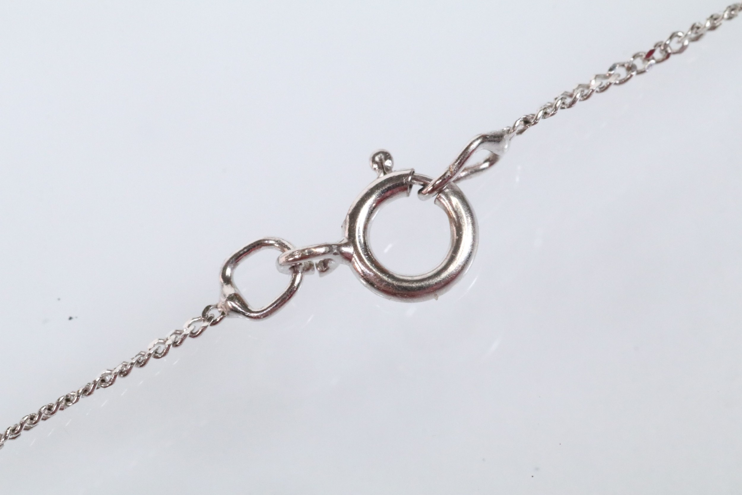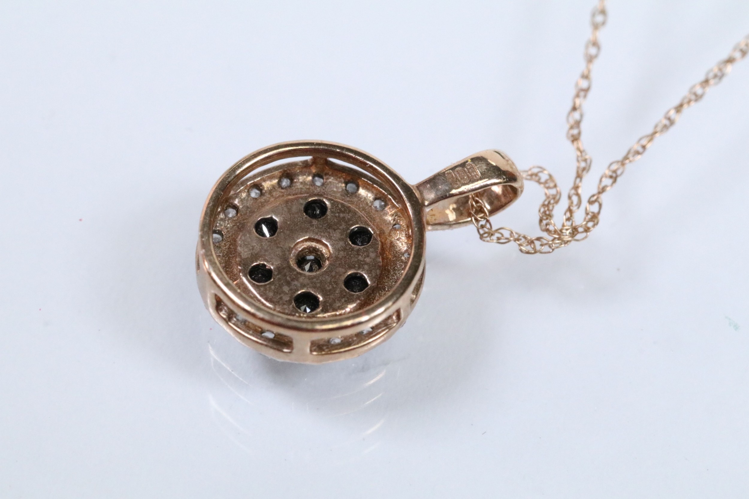 Two 9ct gold pendant necklaces to include a black and white diamond pendant on a fine link chain (pendant hallmarked, chain marked 375), white gold chain with amethyst and diamond set pendant (pendant marked dia, chain marked 375). Chains measure 18 and 16 inches.