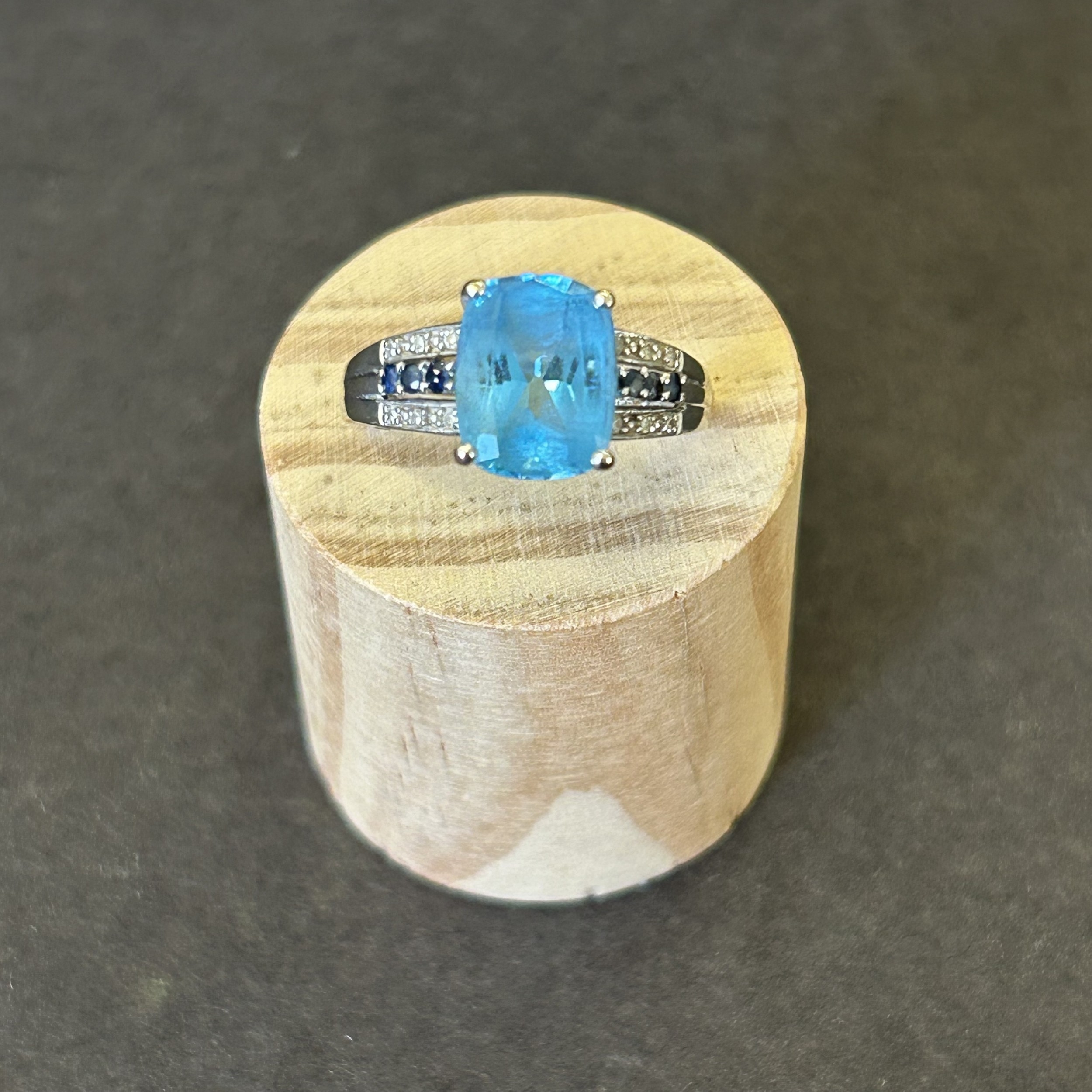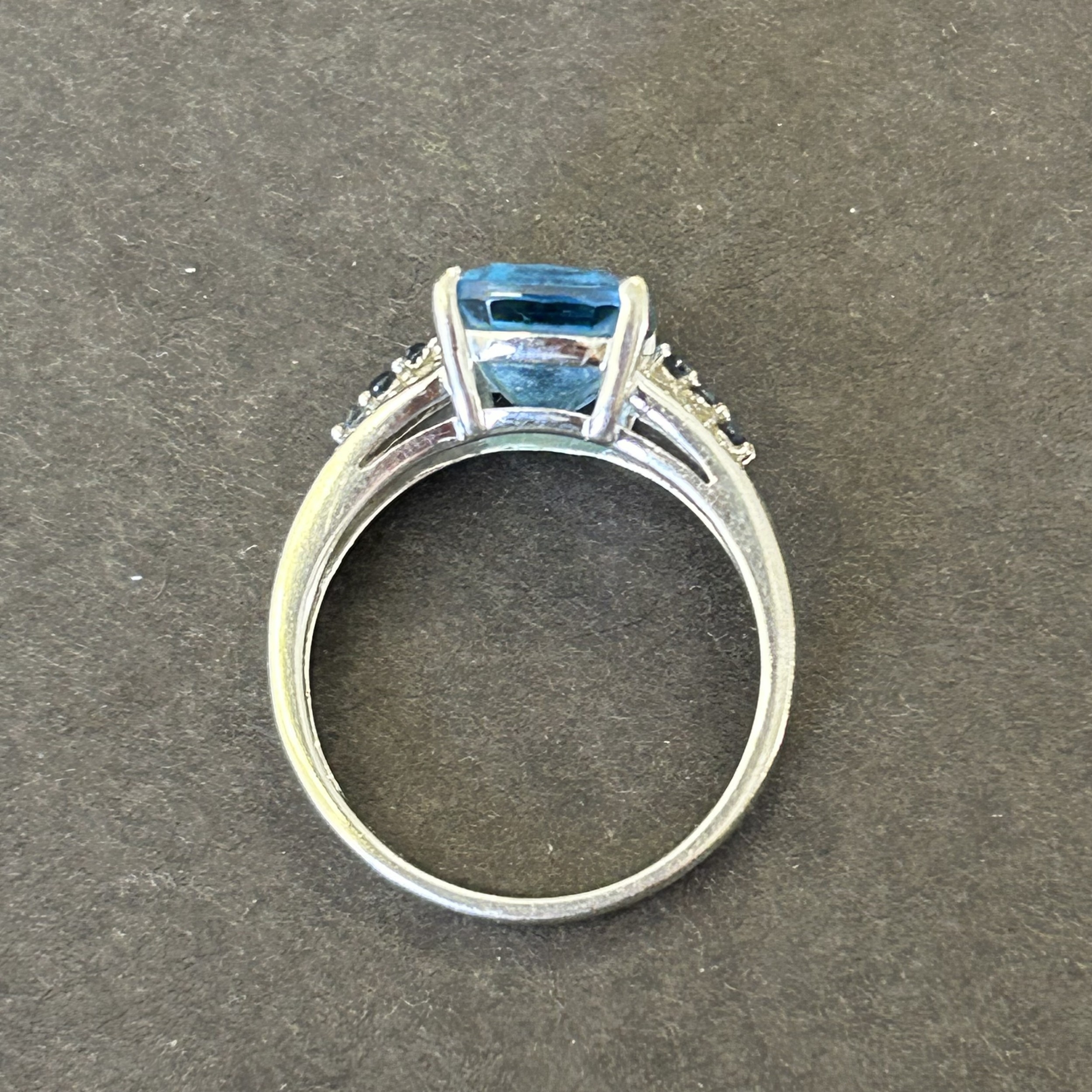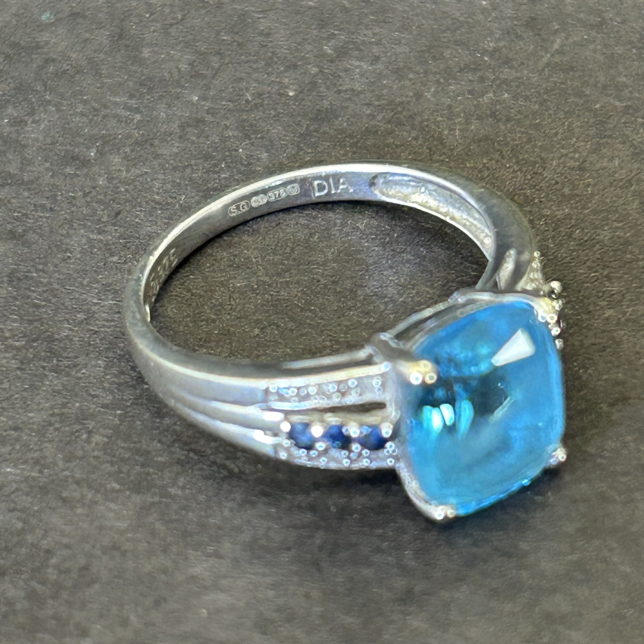 A 9ct white gold ring with blue stone and mini diamond chips in shoulders, approx. size N, weight approx. 2.8g