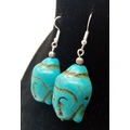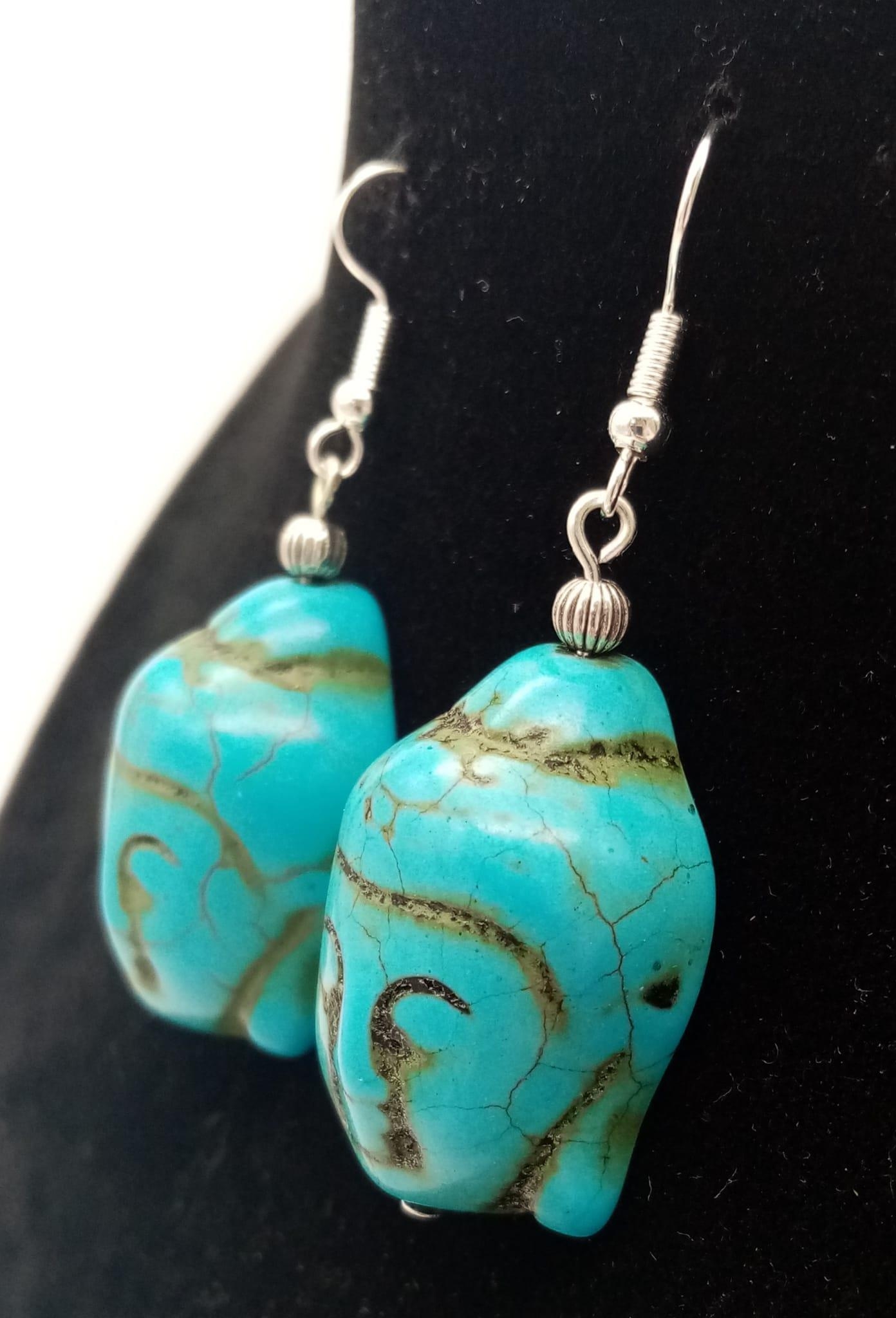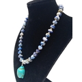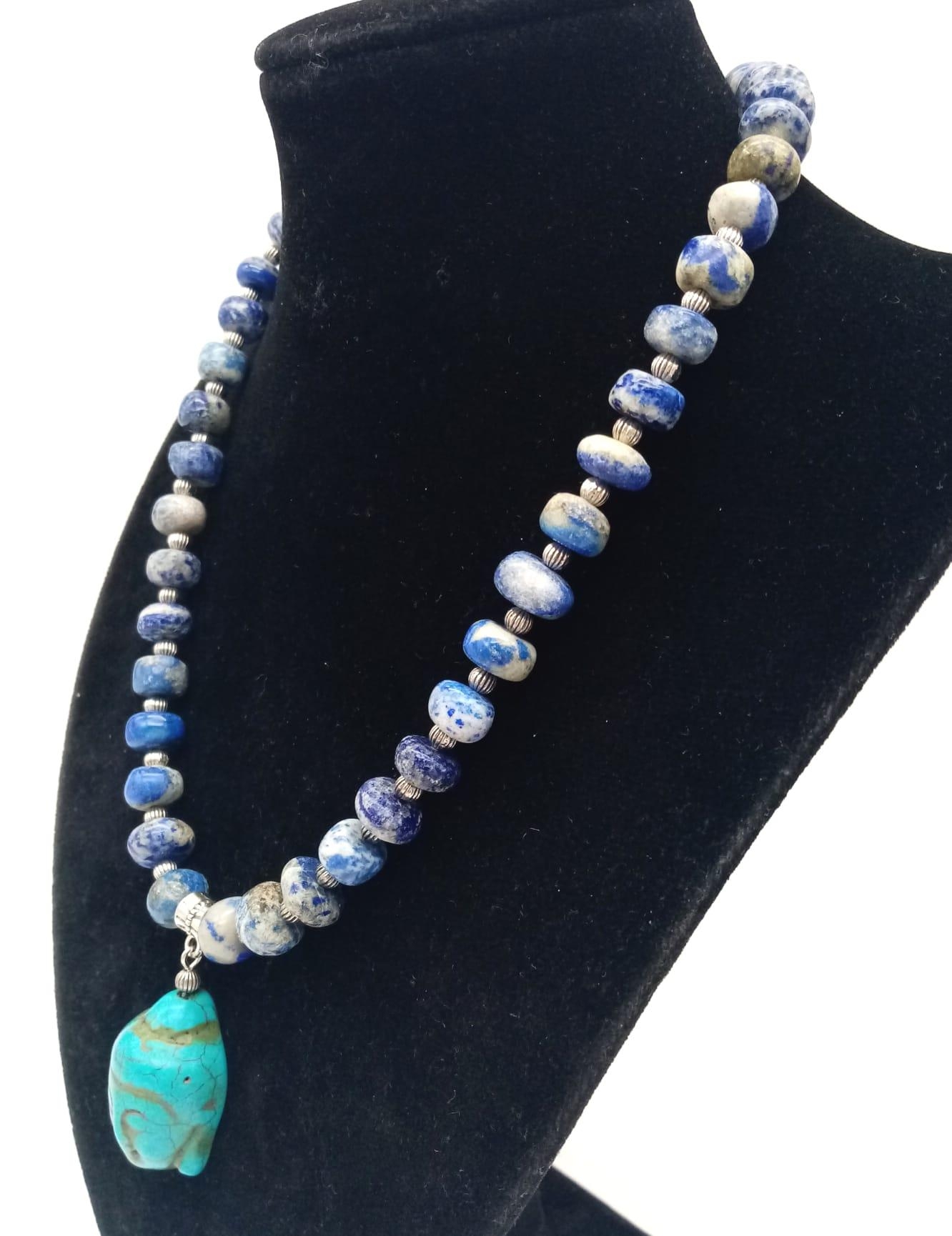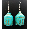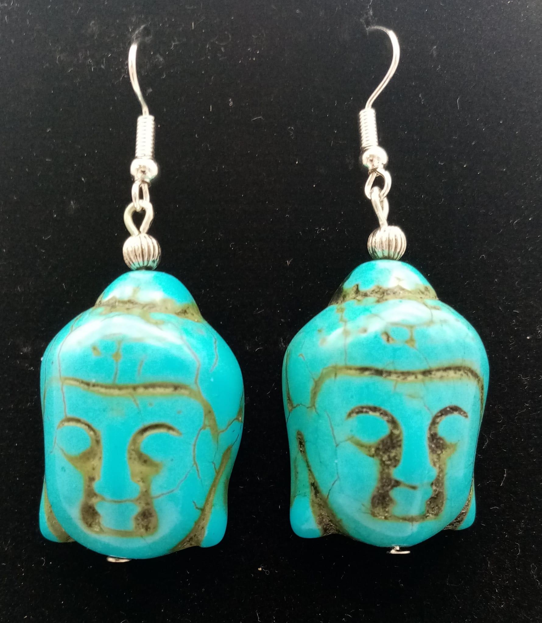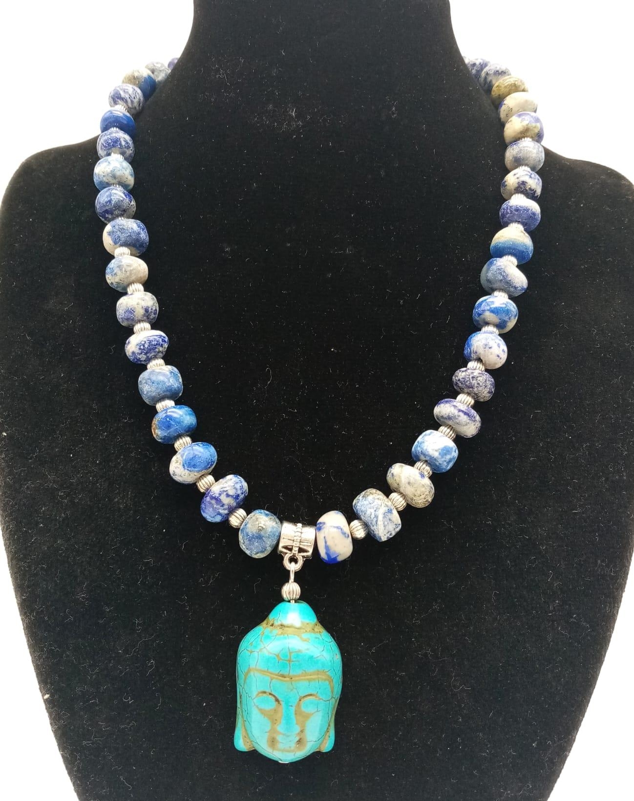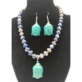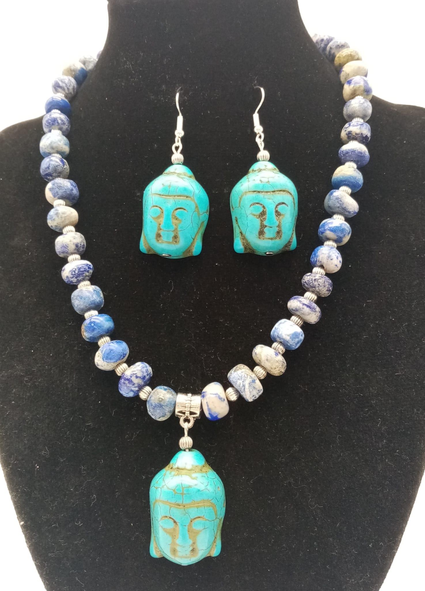 A lapis lazuli necklace with a turquoise Buddha head pendant, accompanied by matching earrings. Necklace