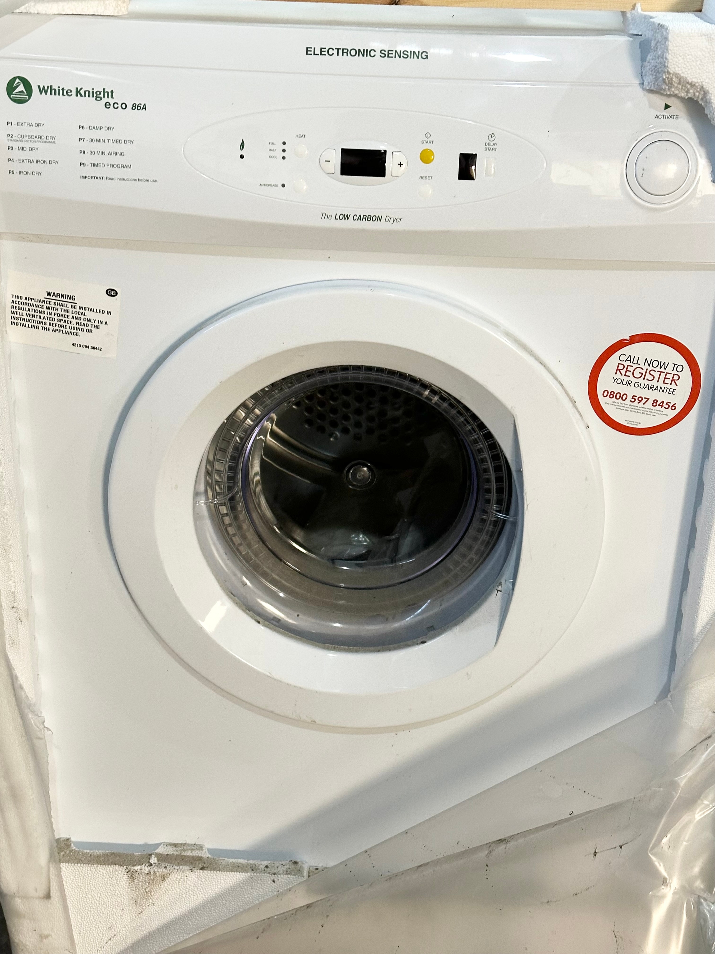 A new White Knight eco 86A tumble dryer.