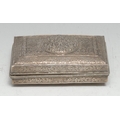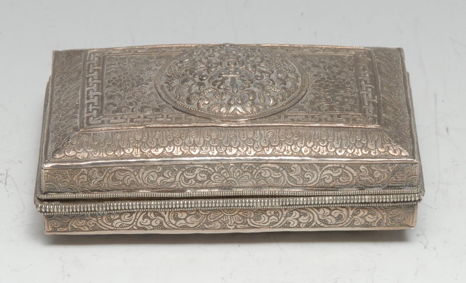 A Tibetan silver rectangular box, profusely chased and engraved with lotus and bands of trellis, hinged cover centred by a roundel, 12cm wide, 19th/early 20th century, 7.25oz