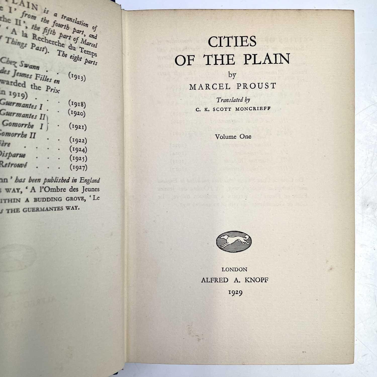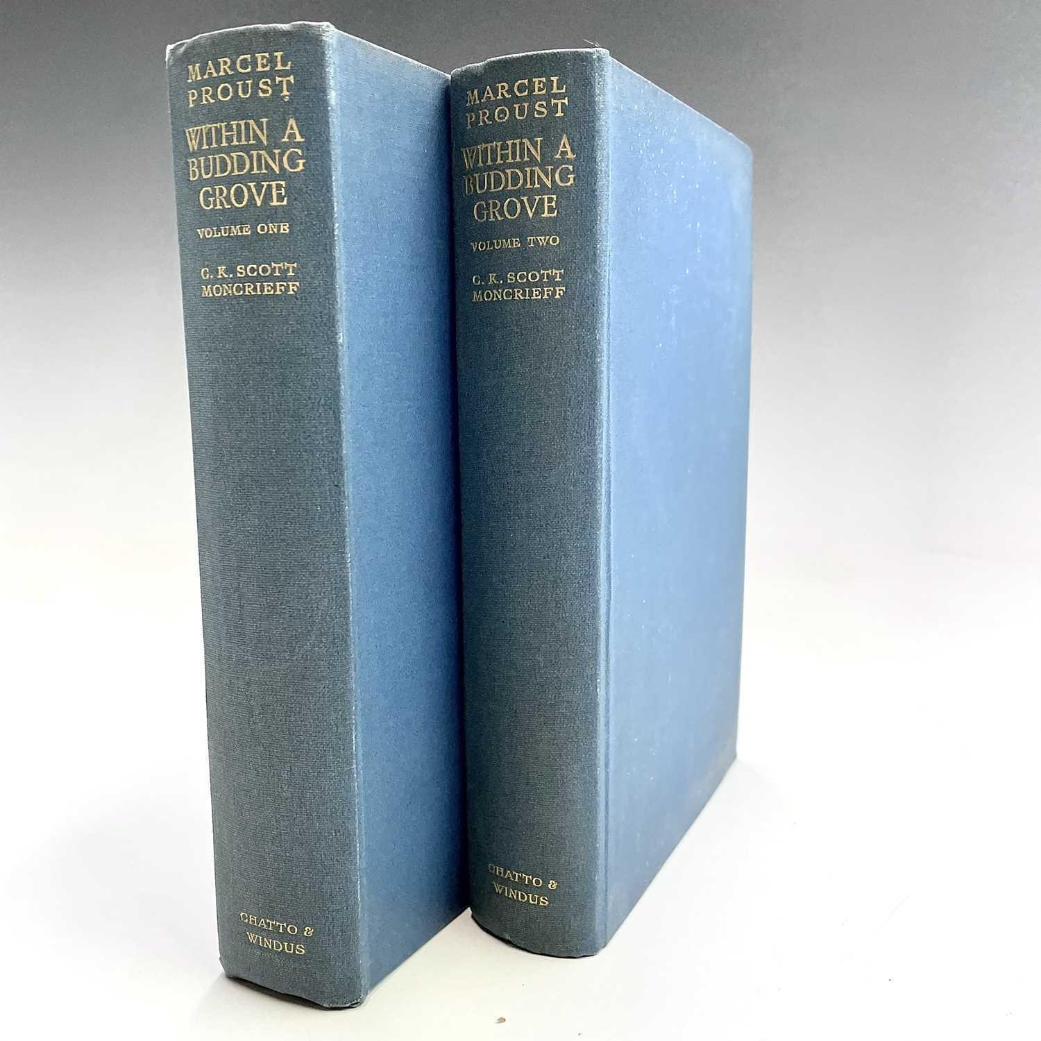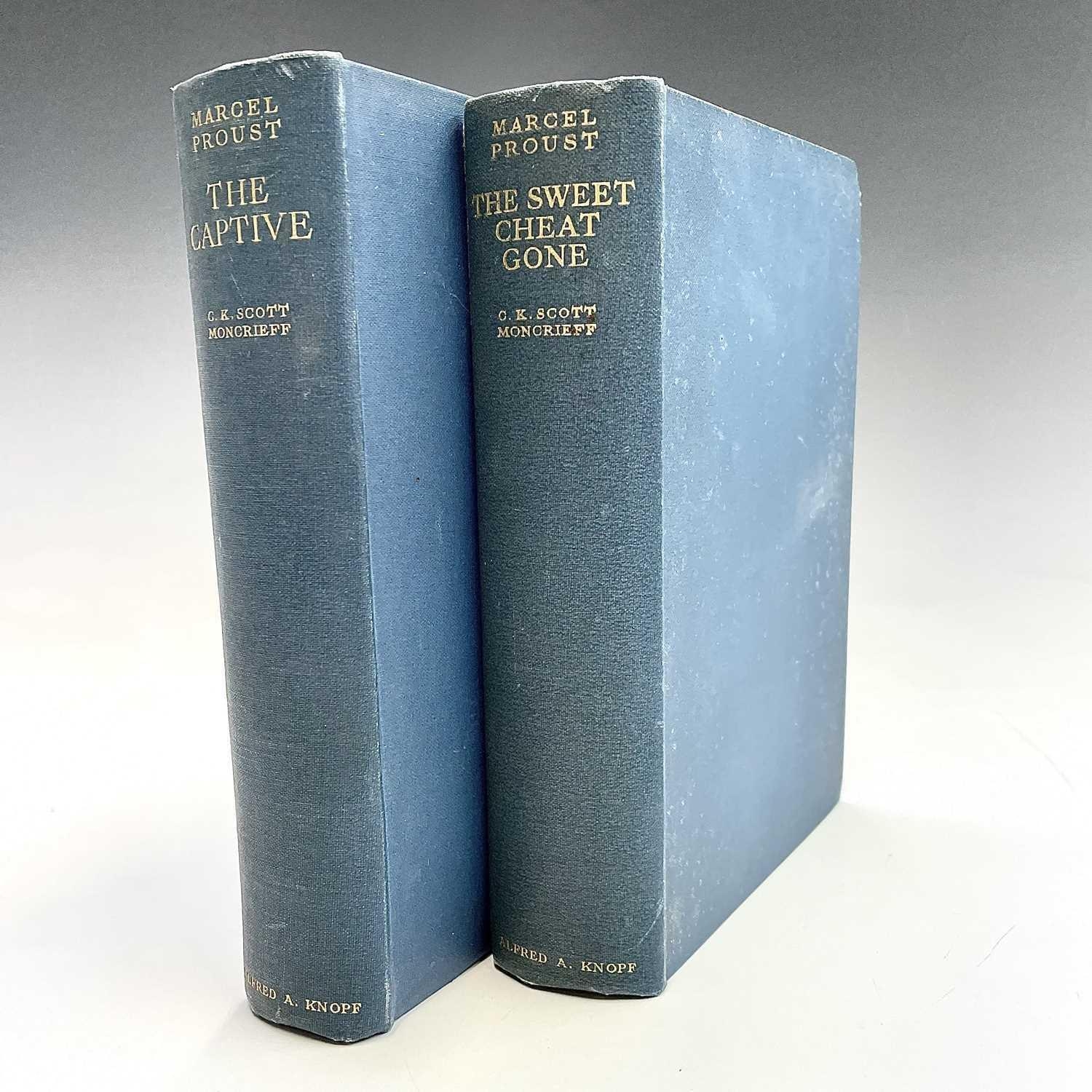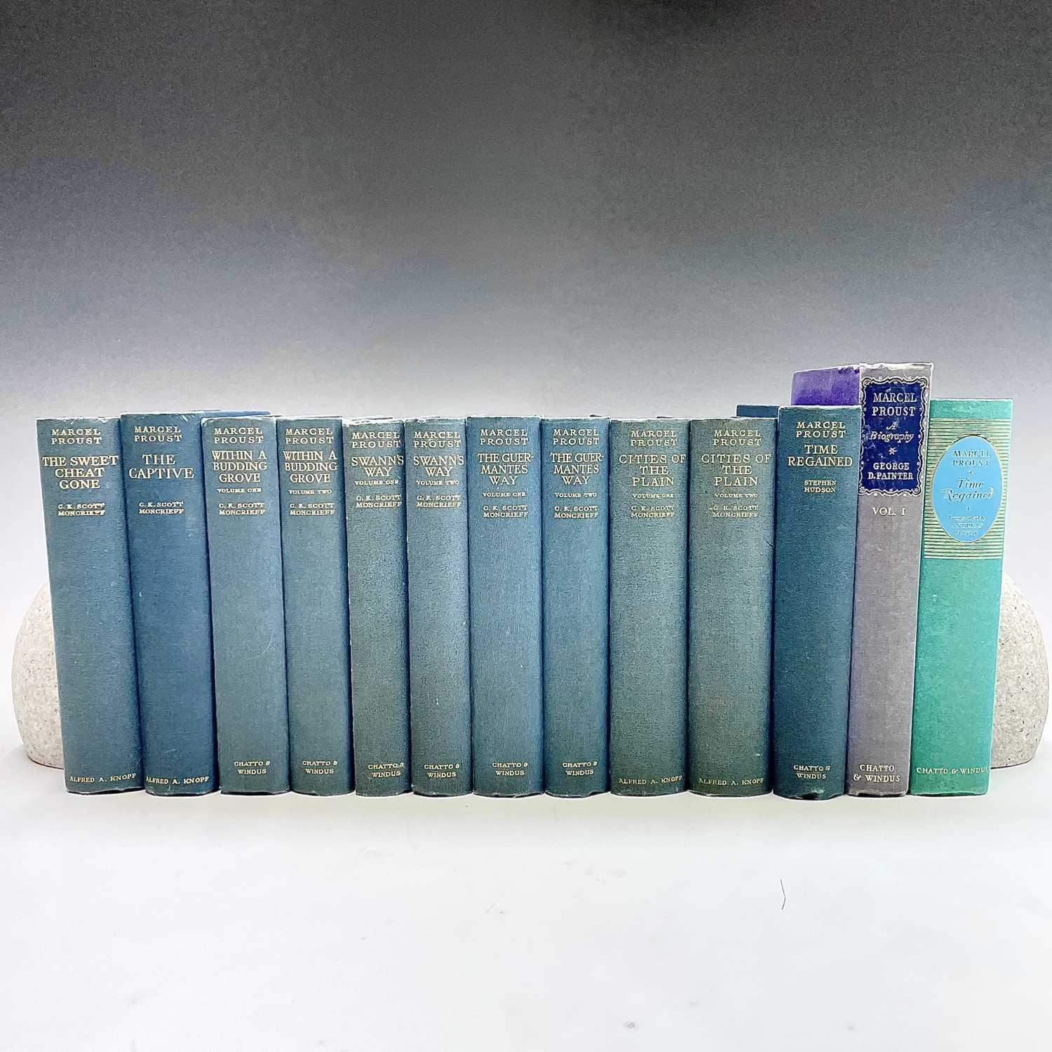 MARCEL PROUST. 'The Guermantes Way,' C.K. Scott Moncrieff, two vols, first English edition, original cloth, slight spotting to fore edge of textblock, Chatto & Windus, 1925; 'Cities of The Plain,' two vols, first English edition, 559/2230, original cloth, Alfred A. Knopf, 1929; 'Time Regained,' translated by Stephen Hudson, 347/1300, original cloth, Chatto & Windus, 1931; 'The Captive,' C.K. Scott Moncrieff, first English edition, original cloth, spotting to first seven leaves, Alfred A. Knopff, 1929; 'The Sweet Cheat Gone,' two vols, first English edition, original cloth, Alfred. A. Knopf, 1930; 'Within a Budding Grove,' second impression, original cloth, Chatto & Windus, 1924; 'Swann's Way,' two vols, fifth impression, original cloth, Chatto & Windus, 1928; plus two others. (13)