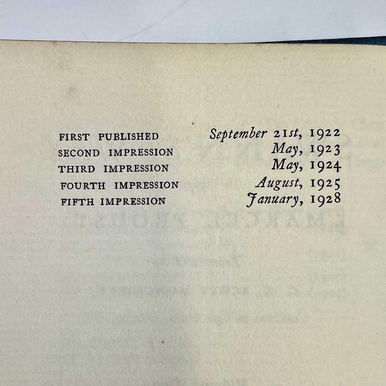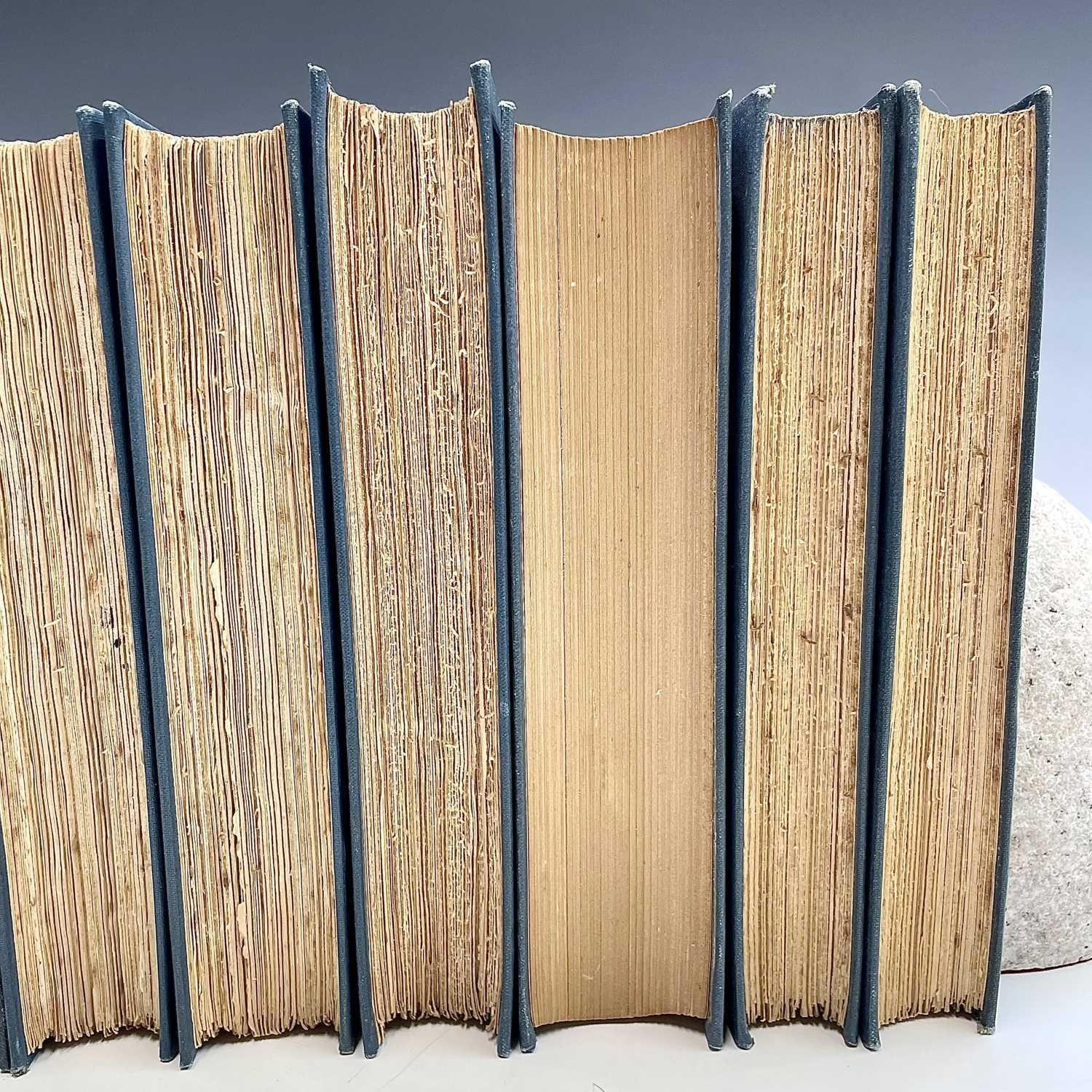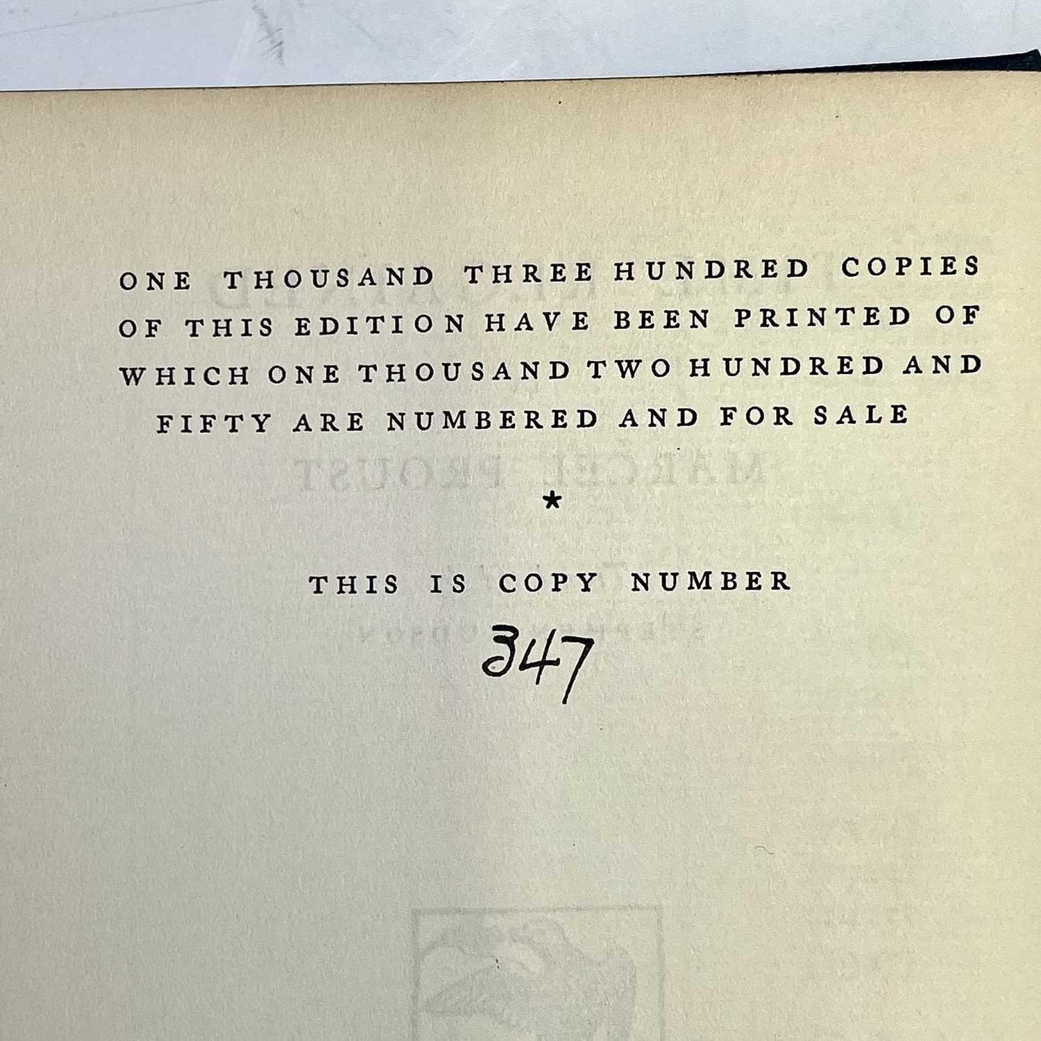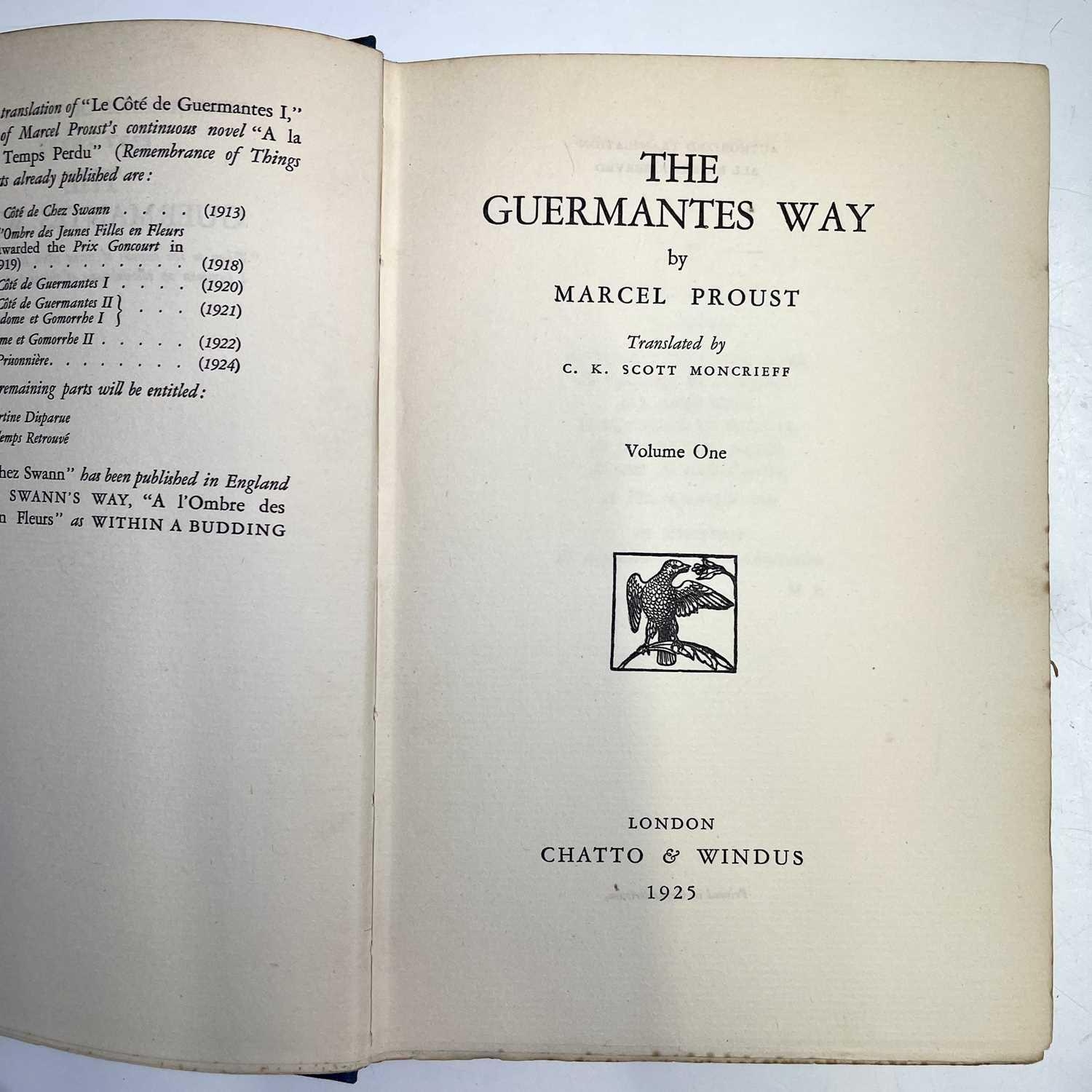 MARCEL PROUST. 'The Guermantes Way,' C.K. Scott Moncrieff, two vols, first English edition, original cloth, slight spotting to fore edge of textblock, Chatto & Windus, 1925; 'Cities of The Plain,' two vols, first English edition, 559/2230, original cloth, Alfred A. Knopf, 1929; 'Time Regained,' translated by Stephen Hudson, 347/1300, original cloth, Chatto & Windus, 1931; 'The Captive,' C.K. Scott Moncrieff, first English edition, original cloth, spotting to first seven leaves, Alfred A. Knopff, 1929; 'The Sweet Cheat Gone,' two vols, first English edition, original cloth, Alfred. A. Knopf, 1930; 'Within a Budding Grove,' second impression, original cloth, Chatto & Windus, 1924; 'Swann's Way,' two vols, fifth impression, original cloth, Chatto & Windus, 1928; plus two others. (13)