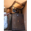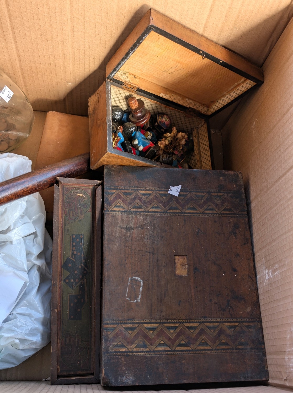 A collection of treen including inlaid wooden boxes, measuring stick other collectables