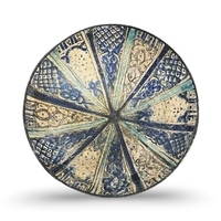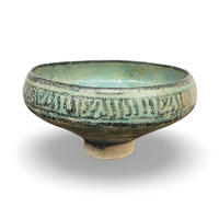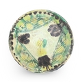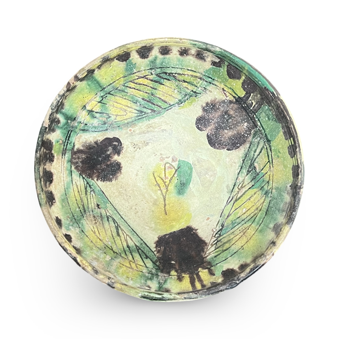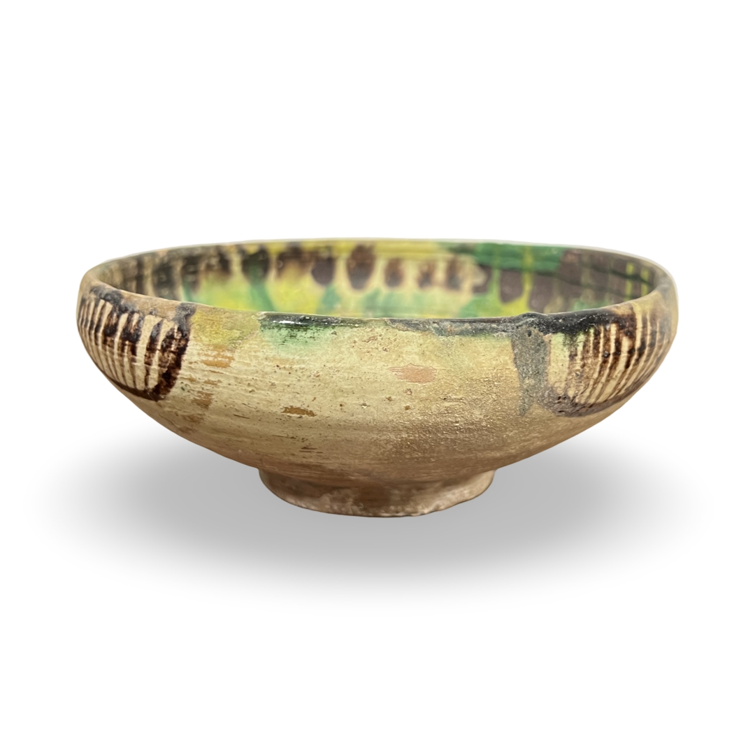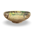This footed ceramic bowl is an example of medieval Islamic splashware sgraffito pottery attributed to 10th century Nishapur. The object is constructed from earthenware with a light colored slip and a lead glaze. It features sgraffito decoration where linear patterns are incised through the slip. The interior well contains three large manganese brown splotches separated by incised radiating lines enclosed in leaf like frames. The rim is decorated with a series of manganese brown dots. The glaze is applied in a splashed technique using green, yellow, and manganese brown pigments. The exterior of the bowl displays wide, vertical bands of manganese brown paint arranged in groups over the slip. There are no visible maker marks, signatures, or calligraphic inscriptions.