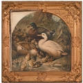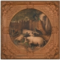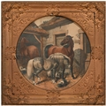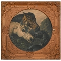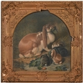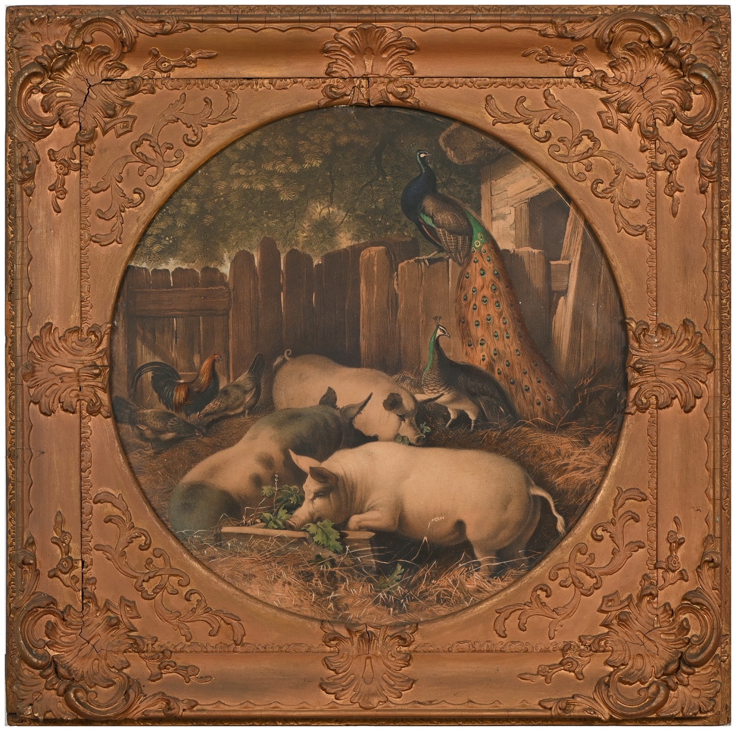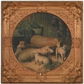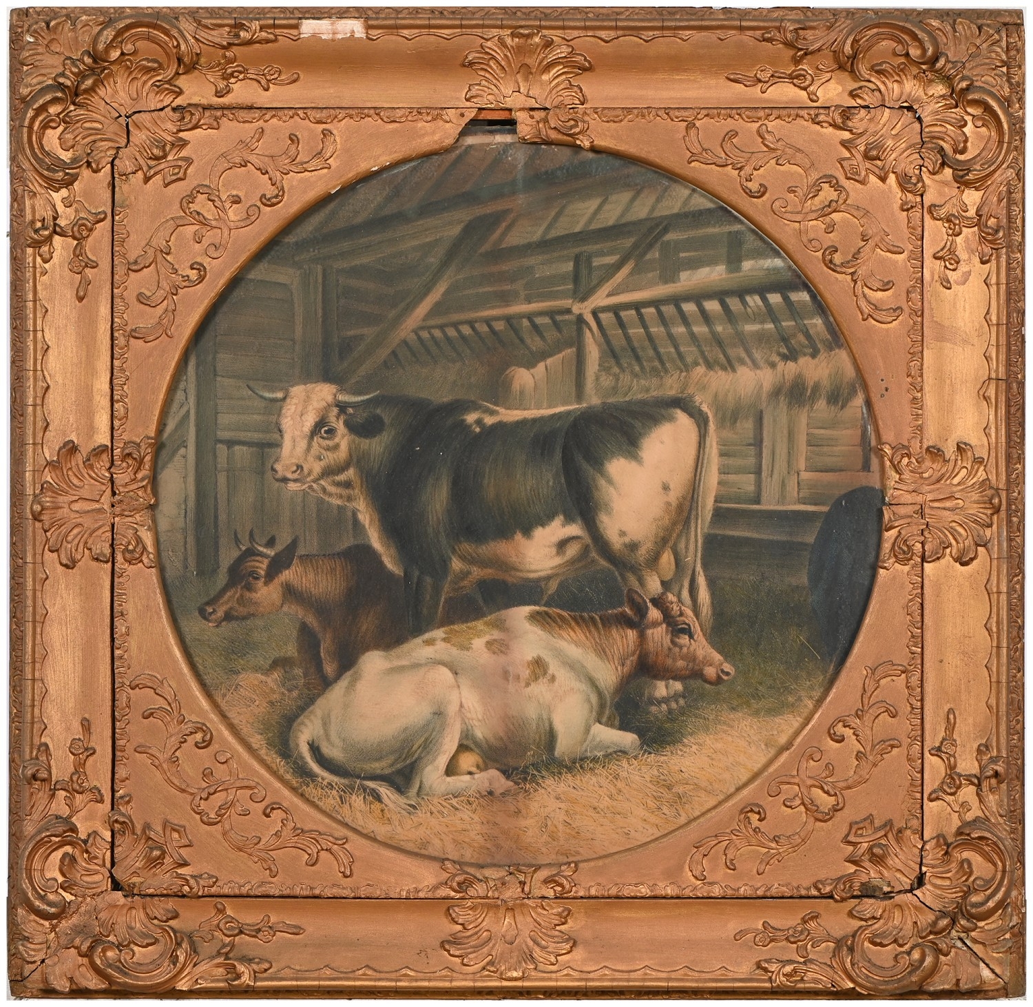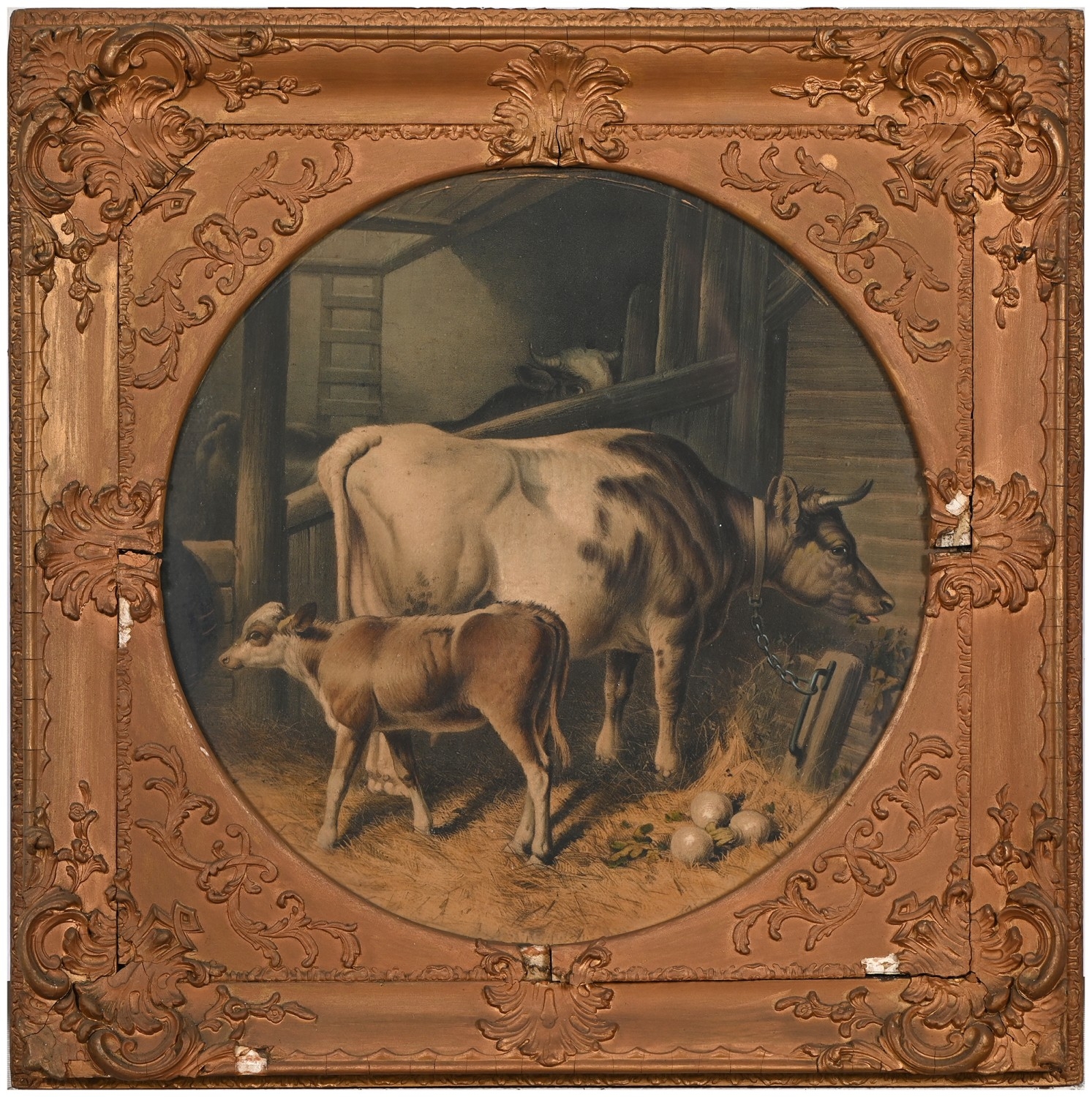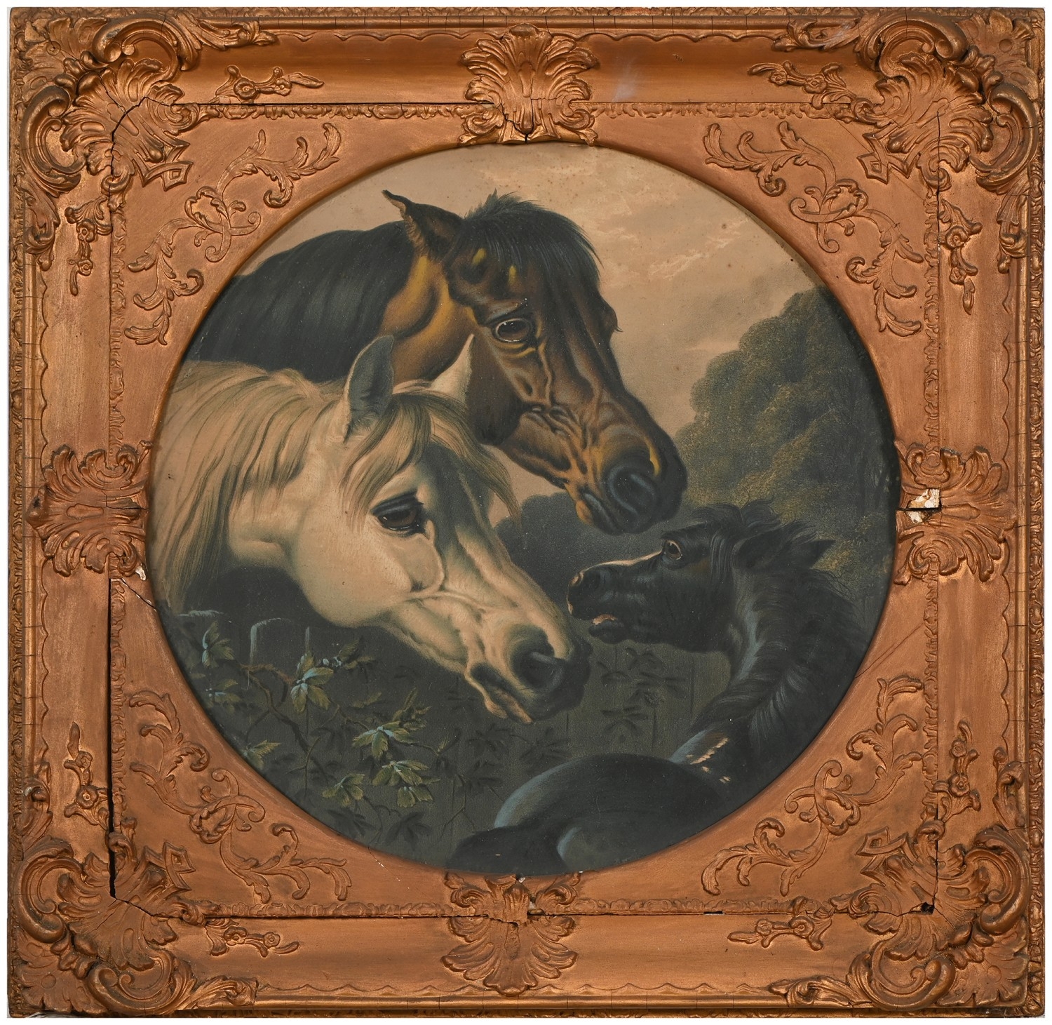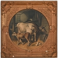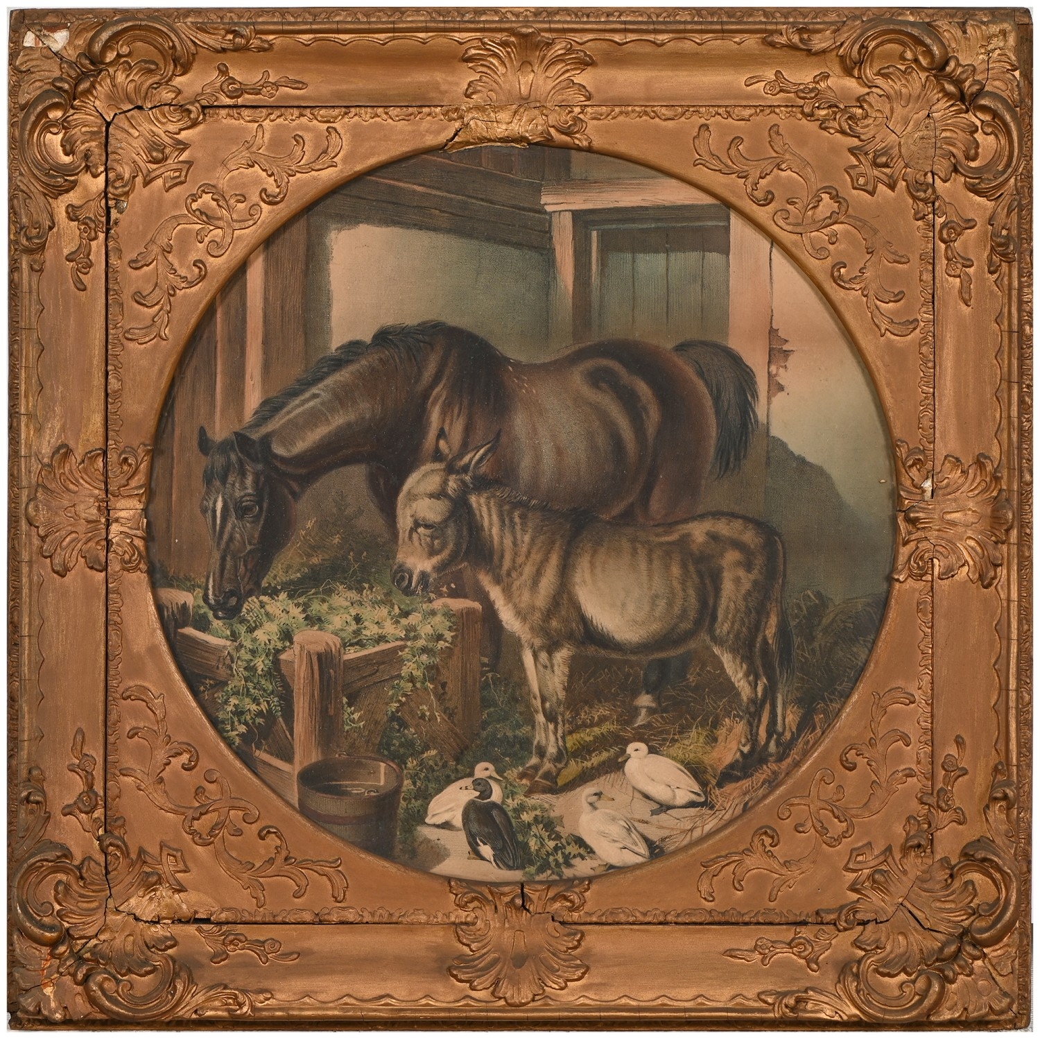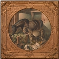 A set of nine gilt and composition shaped square frames, c1870, enclosing Victorian chromolithographs of horses and farmyard animals, 54 x 54cm