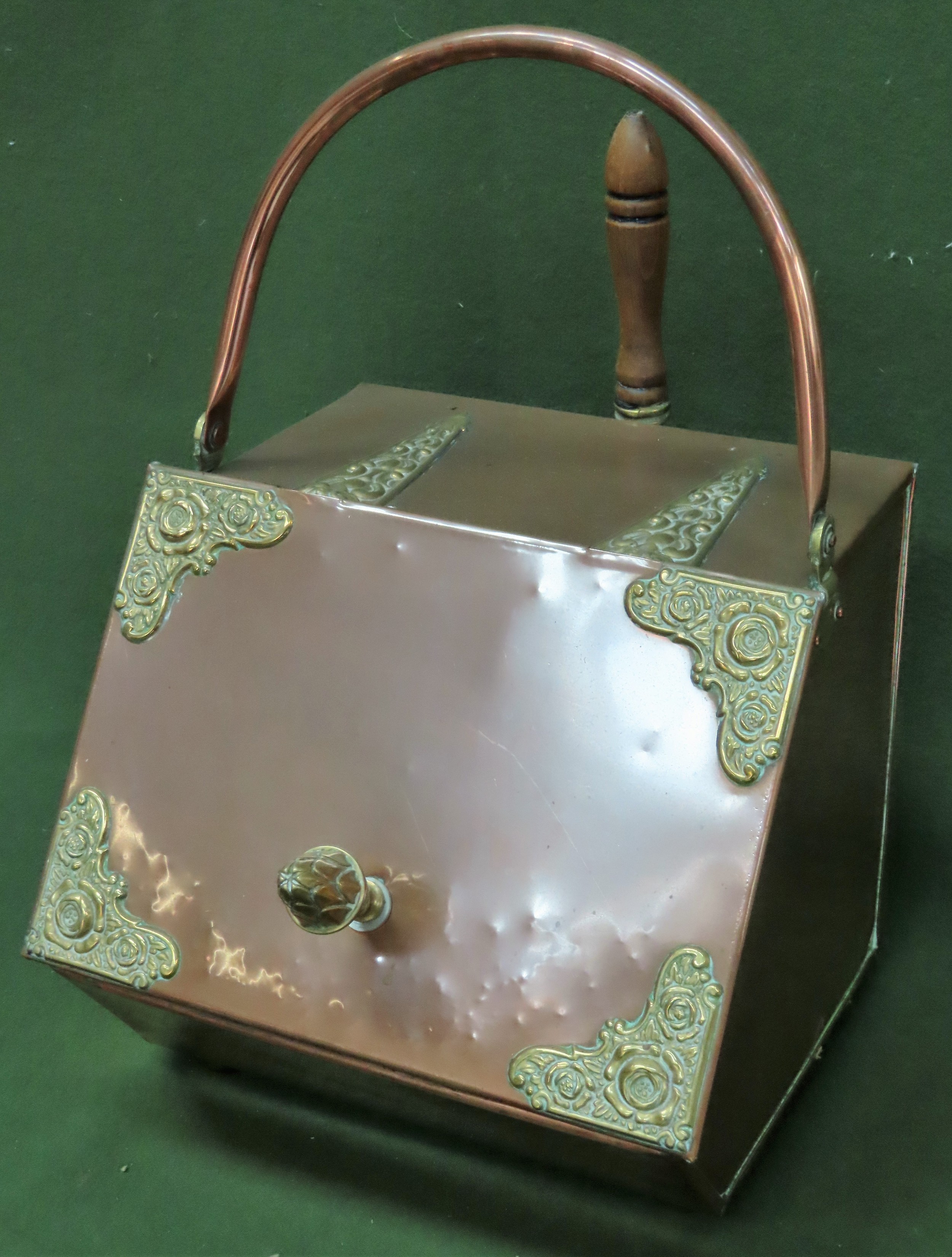 Late 19th/early 20th century brass bound copper coal scuttle, with shovel to accord, and swing over carry handle. Approx. 55cms x 35cms x 34cms
