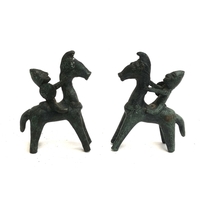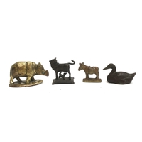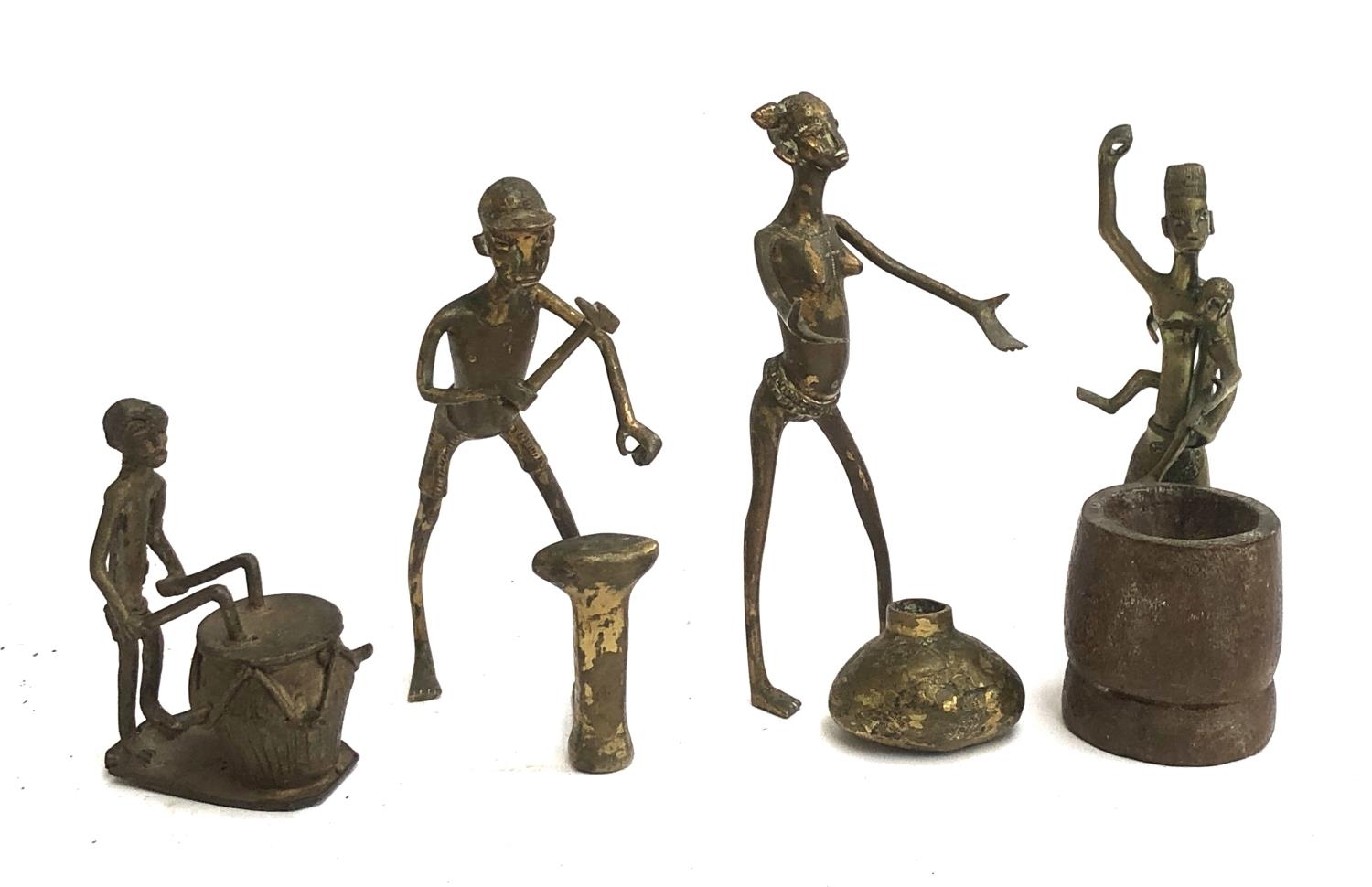 A set of four brass figures, a blacksmith, drummer, lady with pot and a women at well, ranging from 9cmH to 15cmH