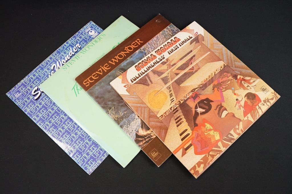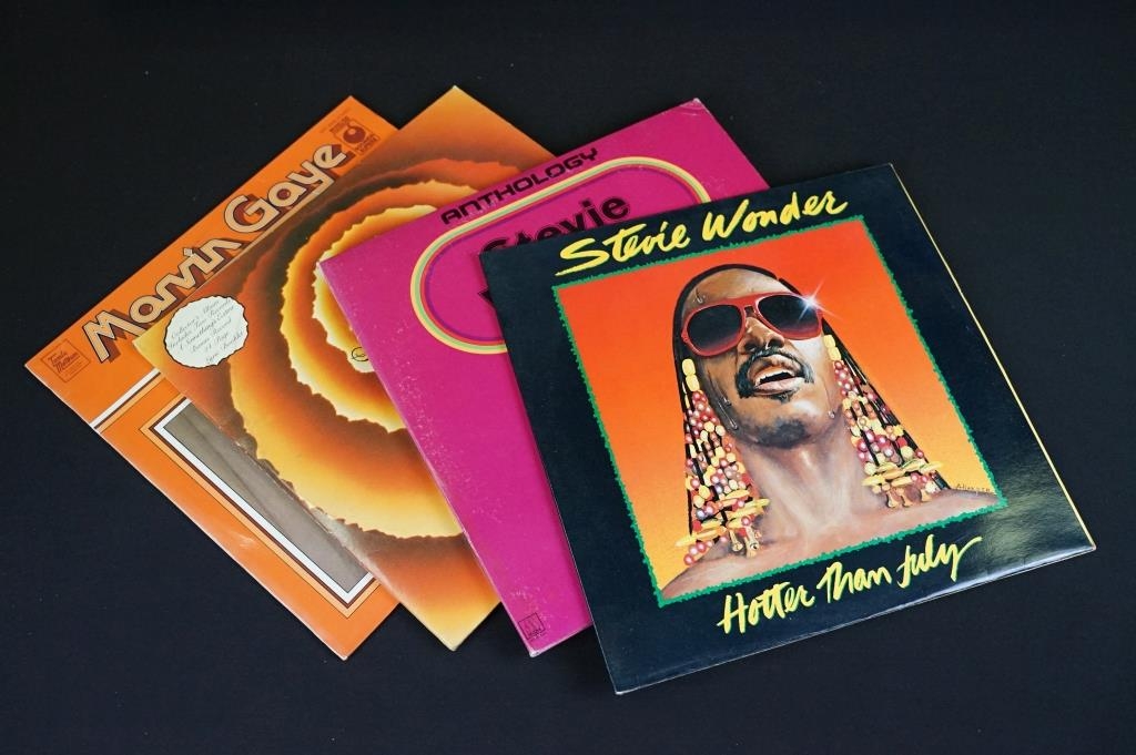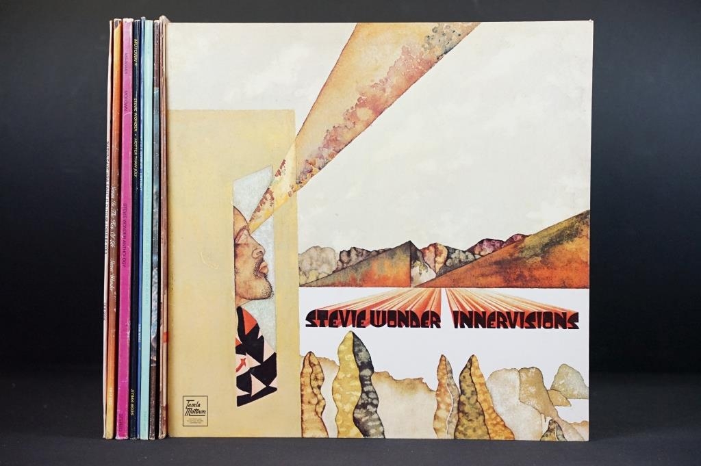 Vinyl - 9 LPs to include 8 from Stevie Wonder - Innervisions, Fulfillingness First Finale, Talking Book, The Secret Of Plants, Uptight, Hotter Than July, Anthology, Songs In The Key Of Life, and from Marvin Gaye How Sweet It Is. Vg overall