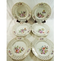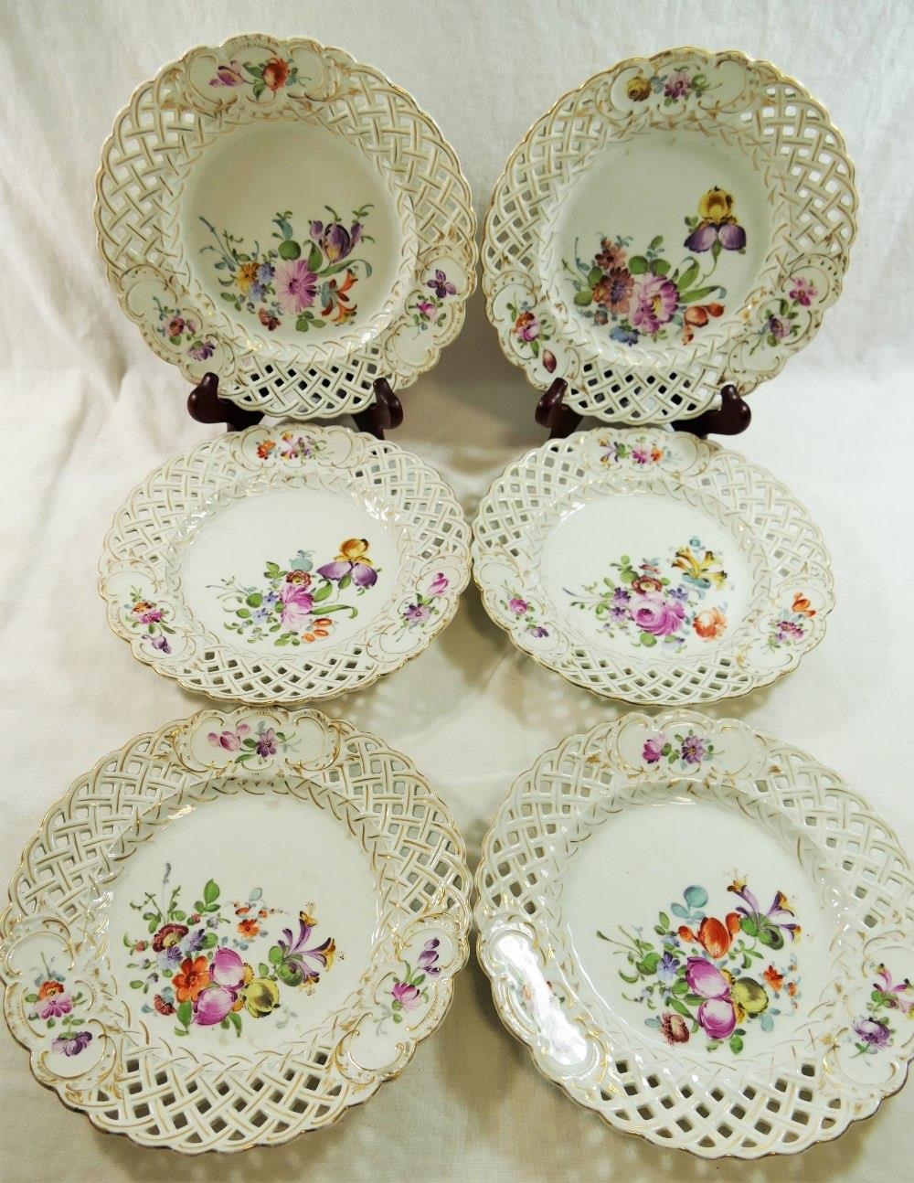 A set of six Meissen porcelain fruit plates with impressed 'MEISSEN' mark, hand painted with flowers with pierced lattice edges, 21.5cm diameter
