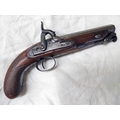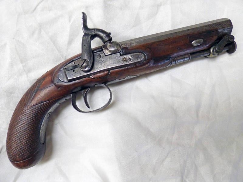 19TH CENTURY PERCUSSION TRAVELLING PISTOL WITH 12.5CM OCTAGONAL BARREL, WALNUT STICK WITH CHEQUERED GRIP & STIRRUP RAMROD