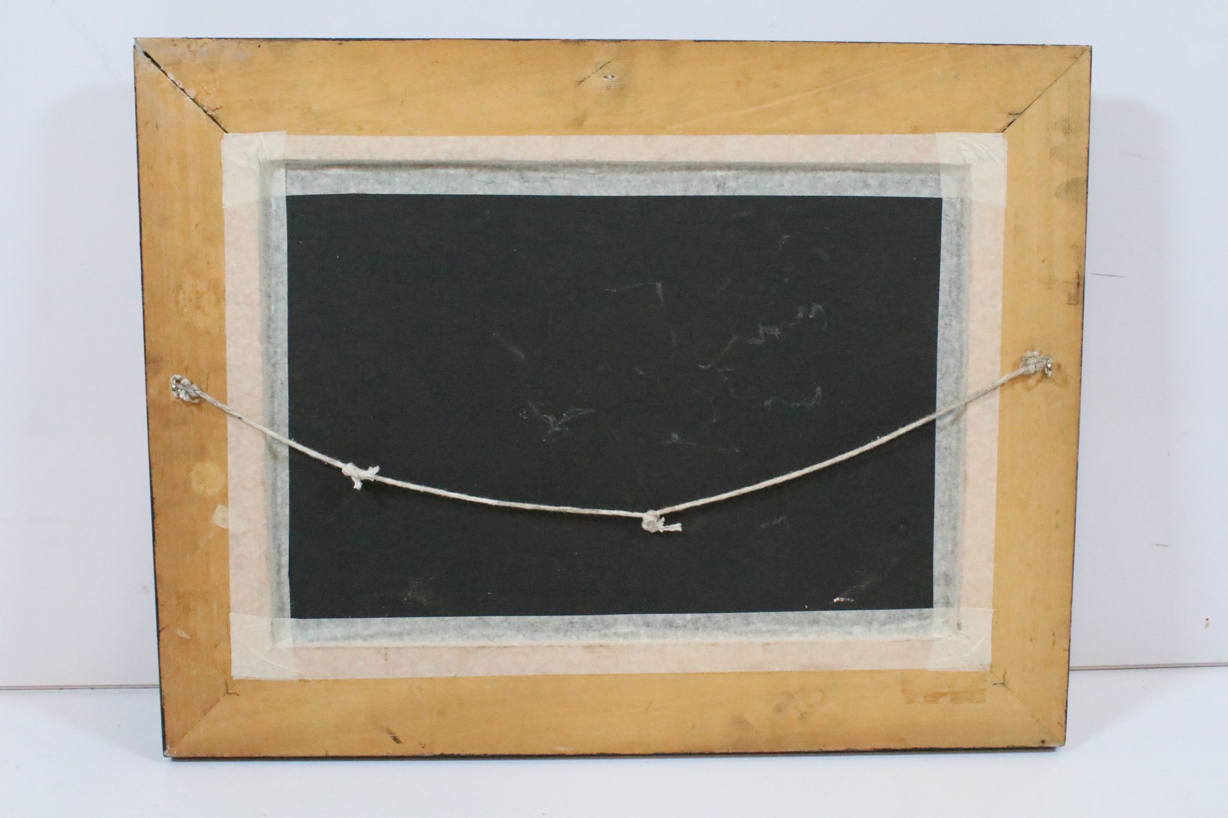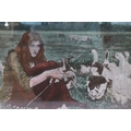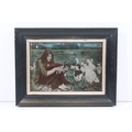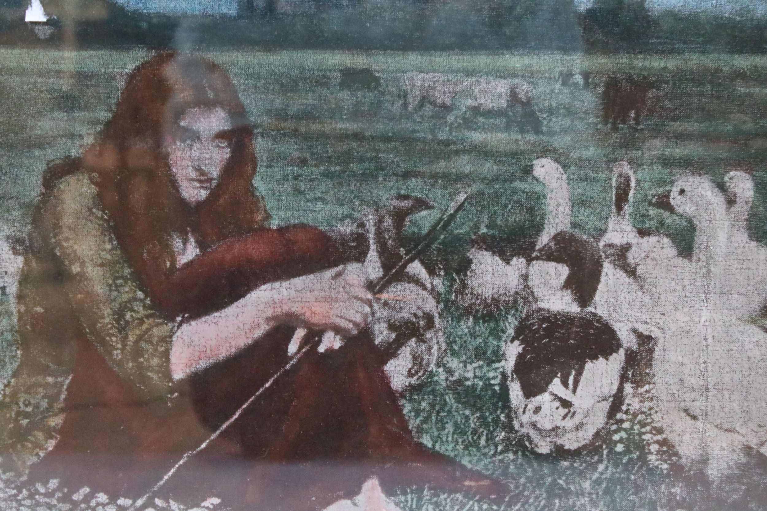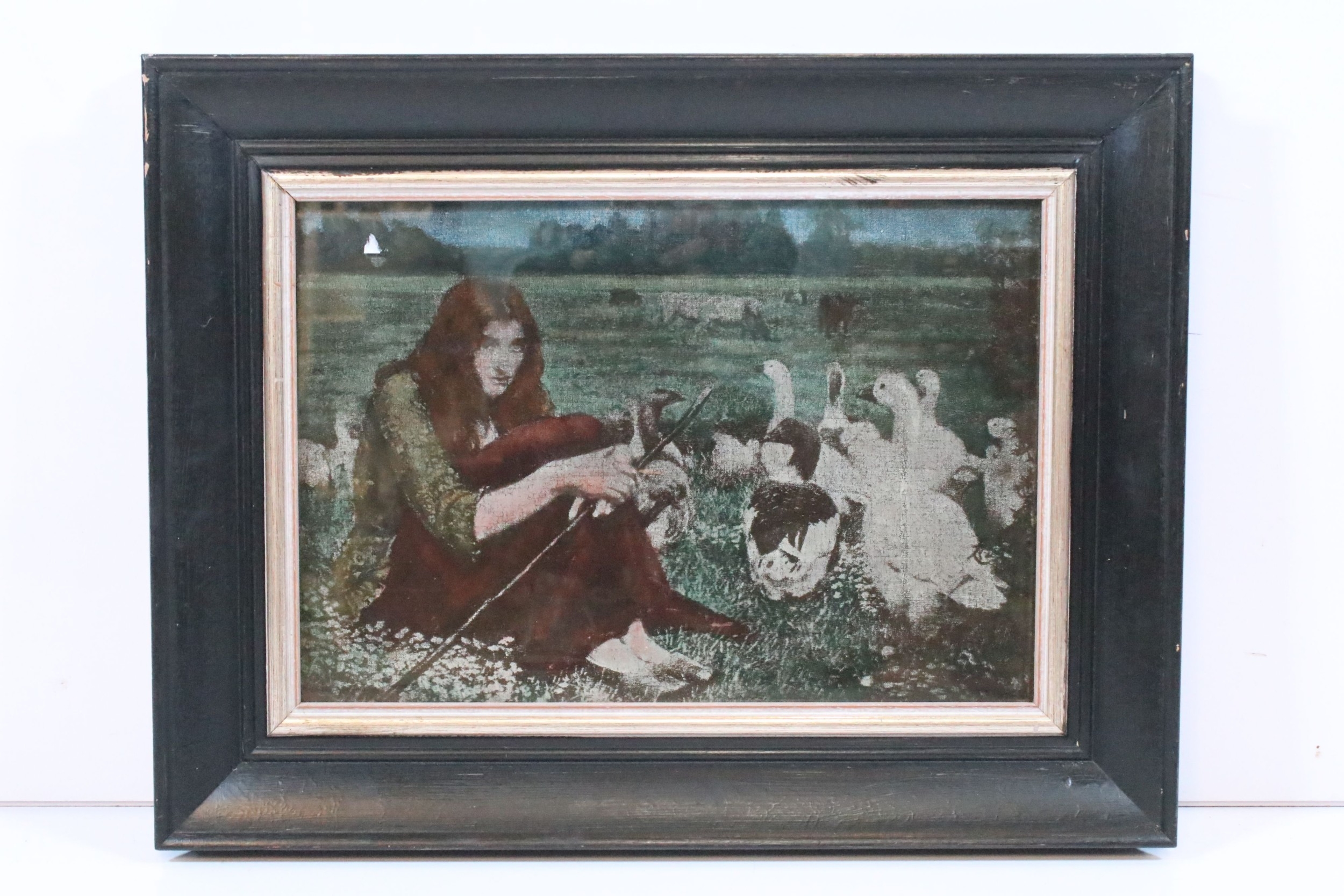 Study of a young woman with geese, paint on velvet, 26.5 x 38.5cm, framed and glazed