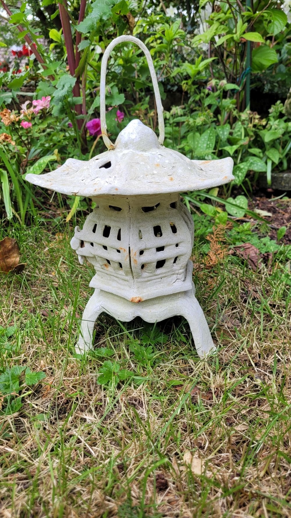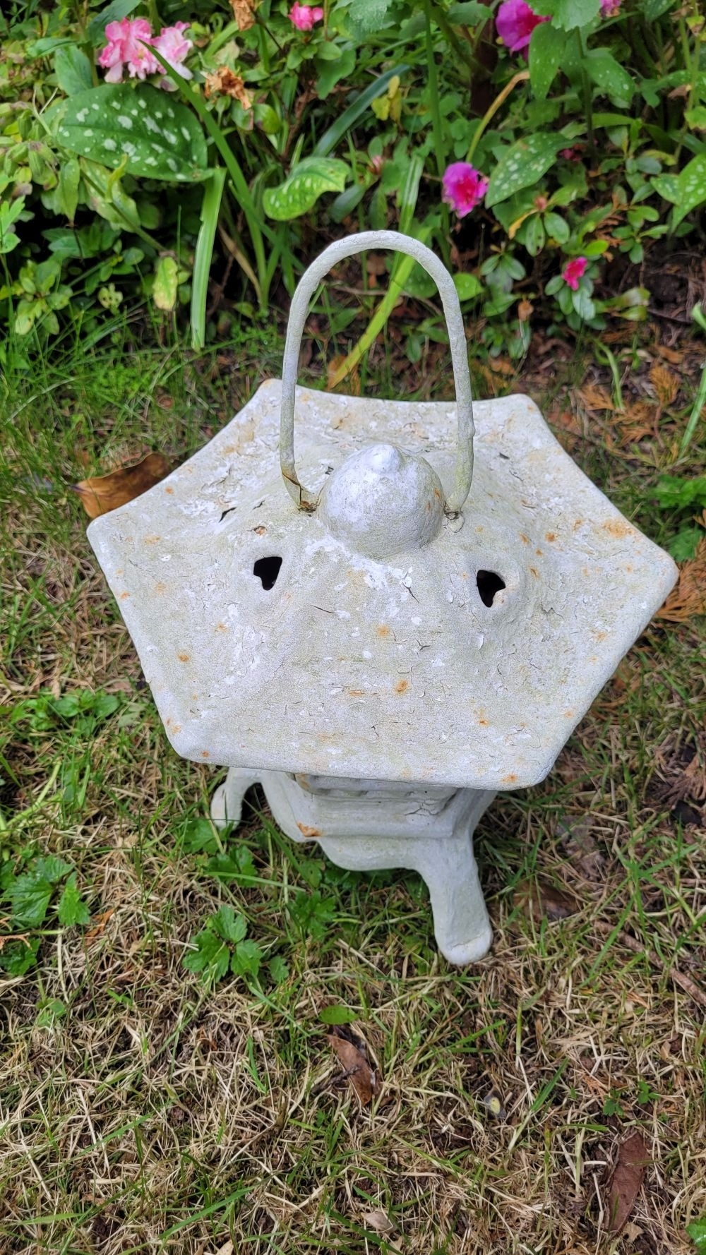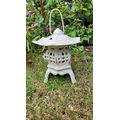 A SWEET LITTLE CAST IRON GARDEN ORNAMENT IN THE FORM OF A LANTERN, currently painted over so cannot be opened – but a lovely decorative piece as it is. Dimensions: 33 x 24 x 22cm (H x W x D)