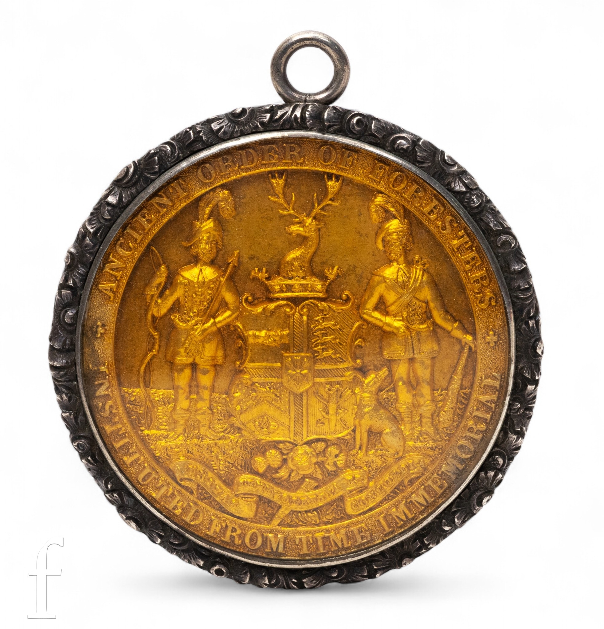 A Victorian gilt medallion for the Ancient Order of the Foresters, in silver frame with suspension loop.