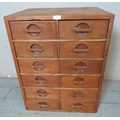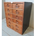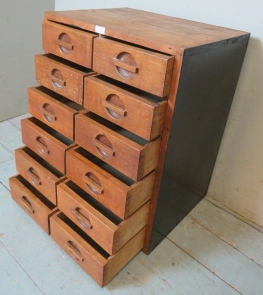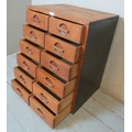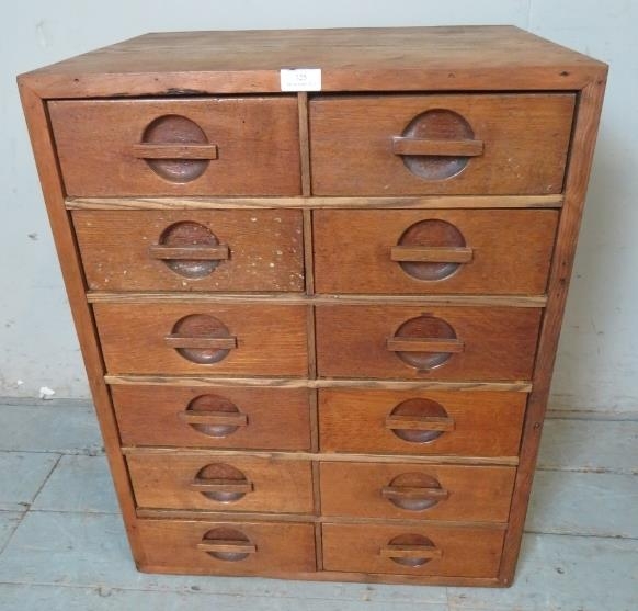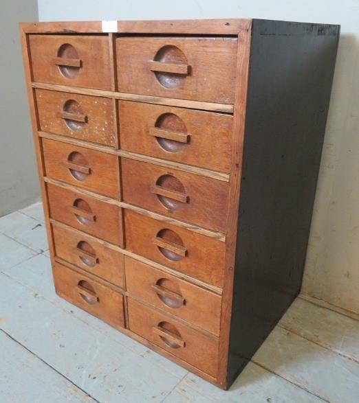 A vintage medium oak bank of twelve drawers each with recessed roundels featuring wooden bar handles.