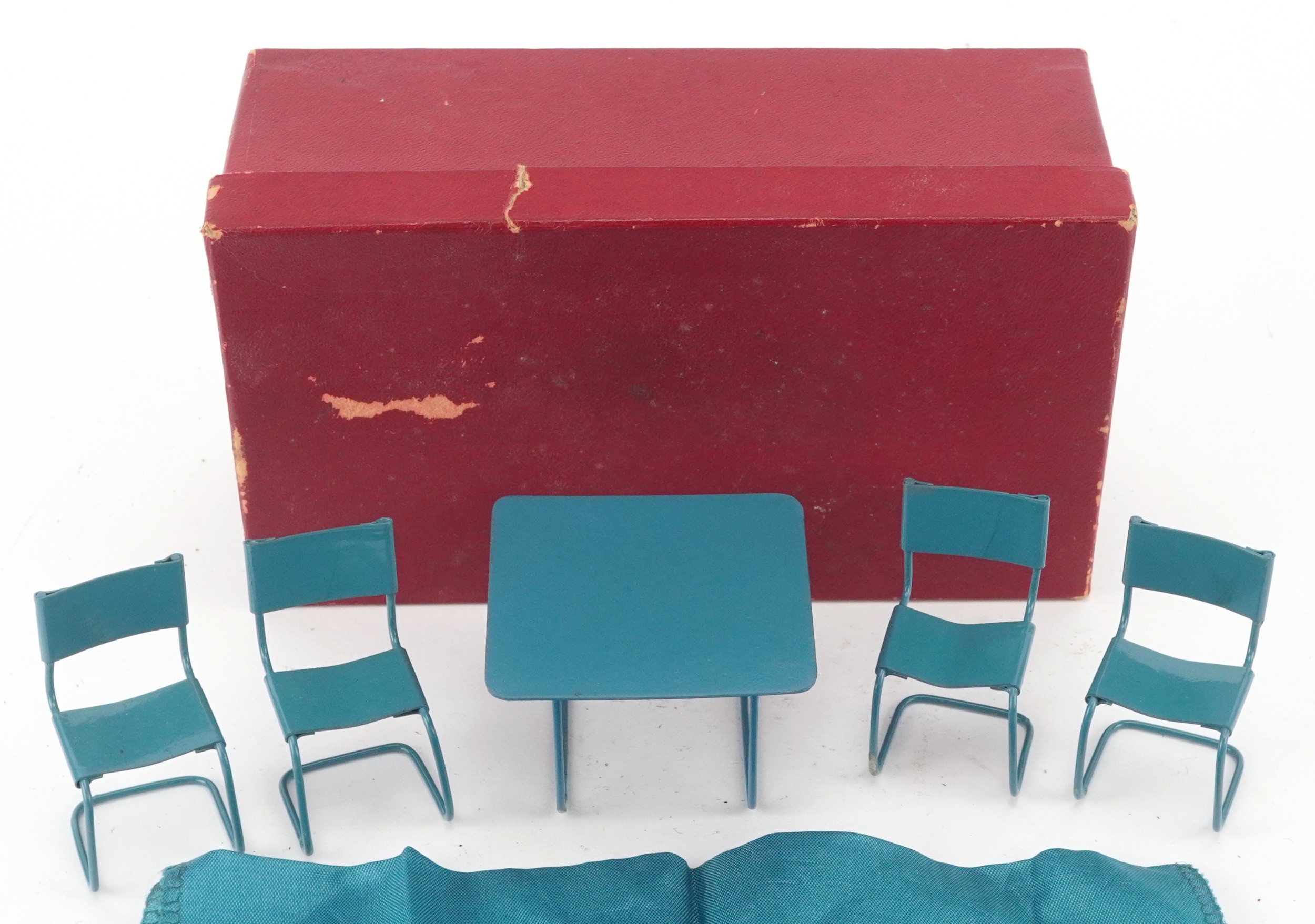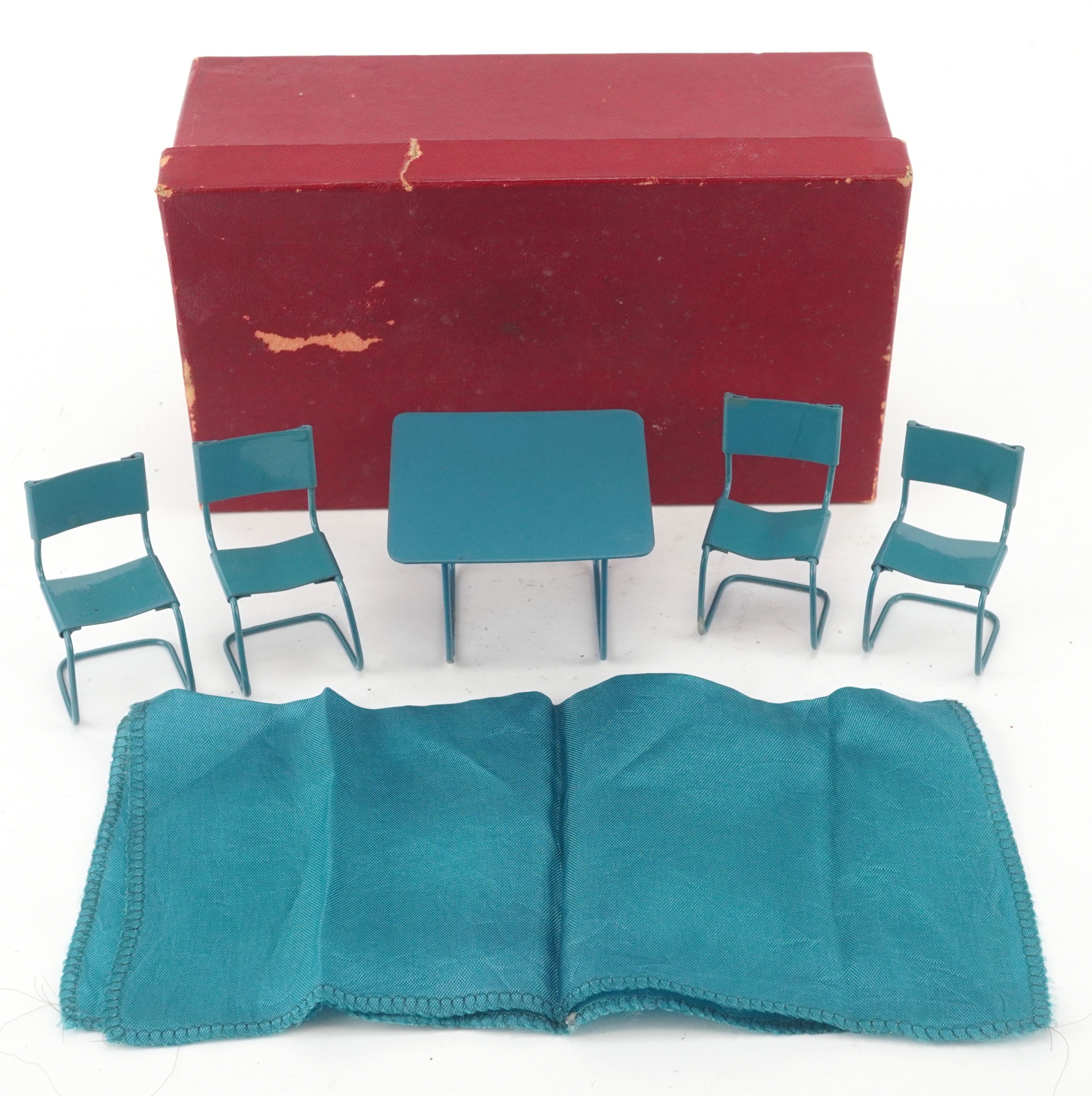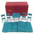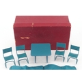 Metal doll's house furniture comprising a table and four chairs, the table 4.5cm high.