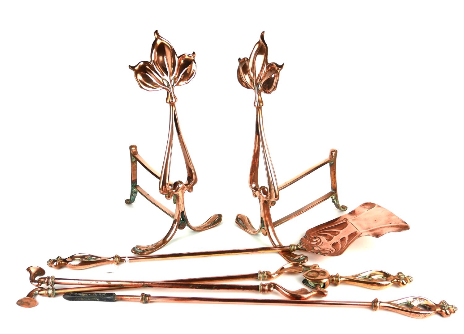A SET OF ART NOUVEAU COPPER FIRE IRONS AND DOGS