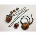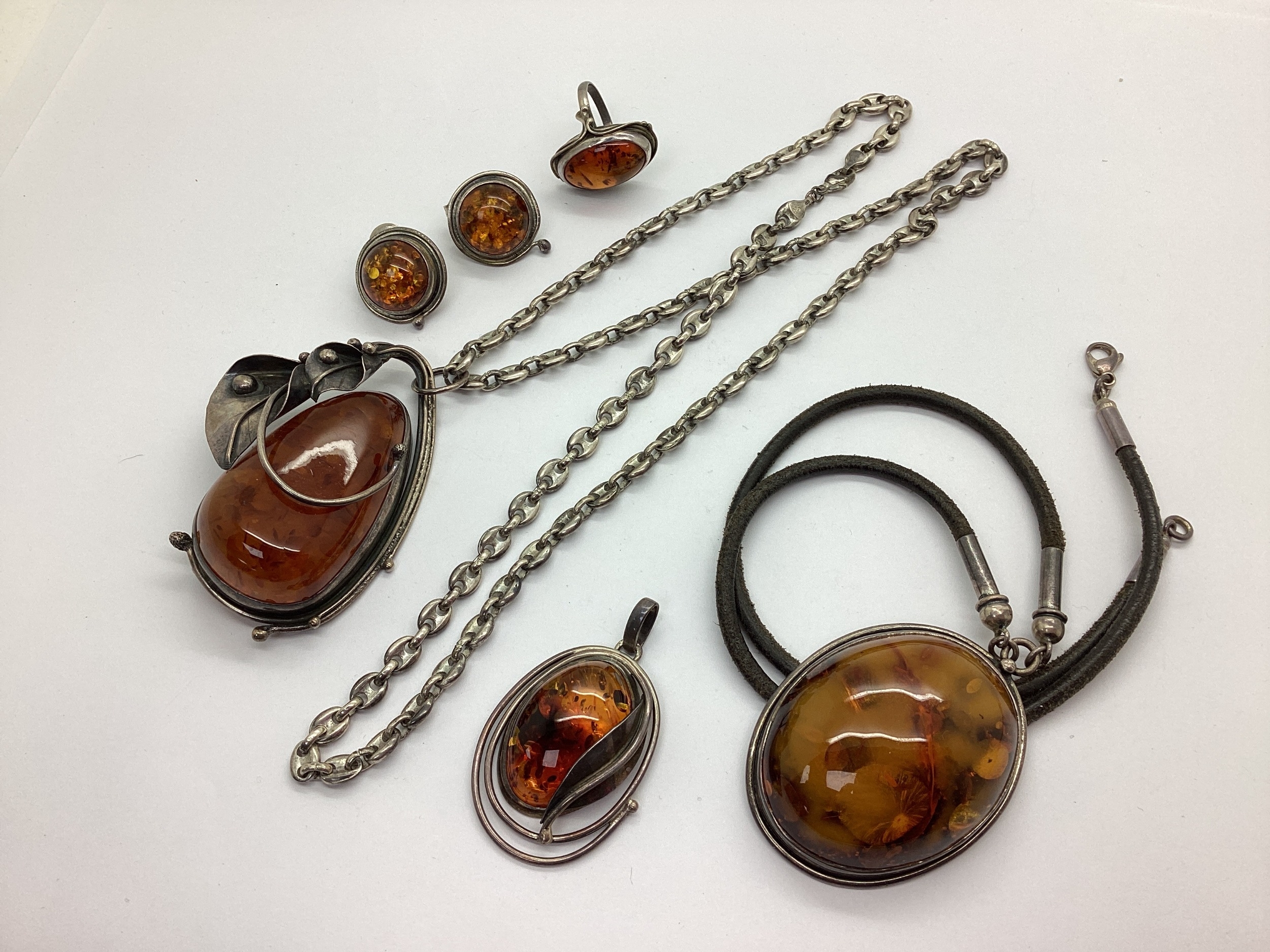 A Large Amber Pendant, (converted from a brooch / lacking pin) within stylised sinuous mount, suspended on modern hallmarked silver mariner link chain; together with further pendants, dress ring and a pair of earrings. [420004]