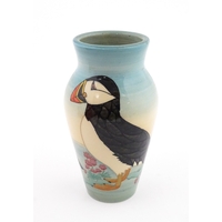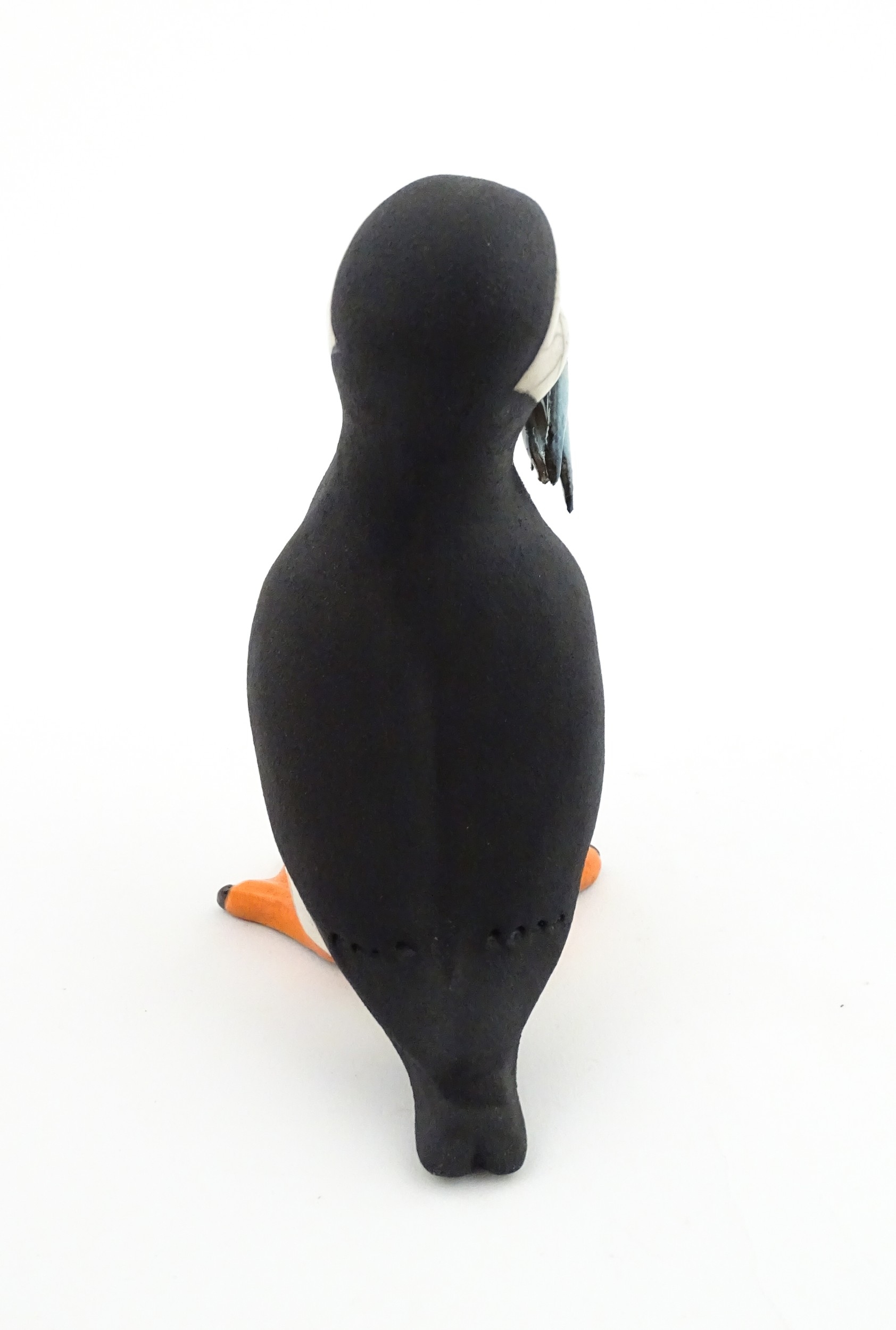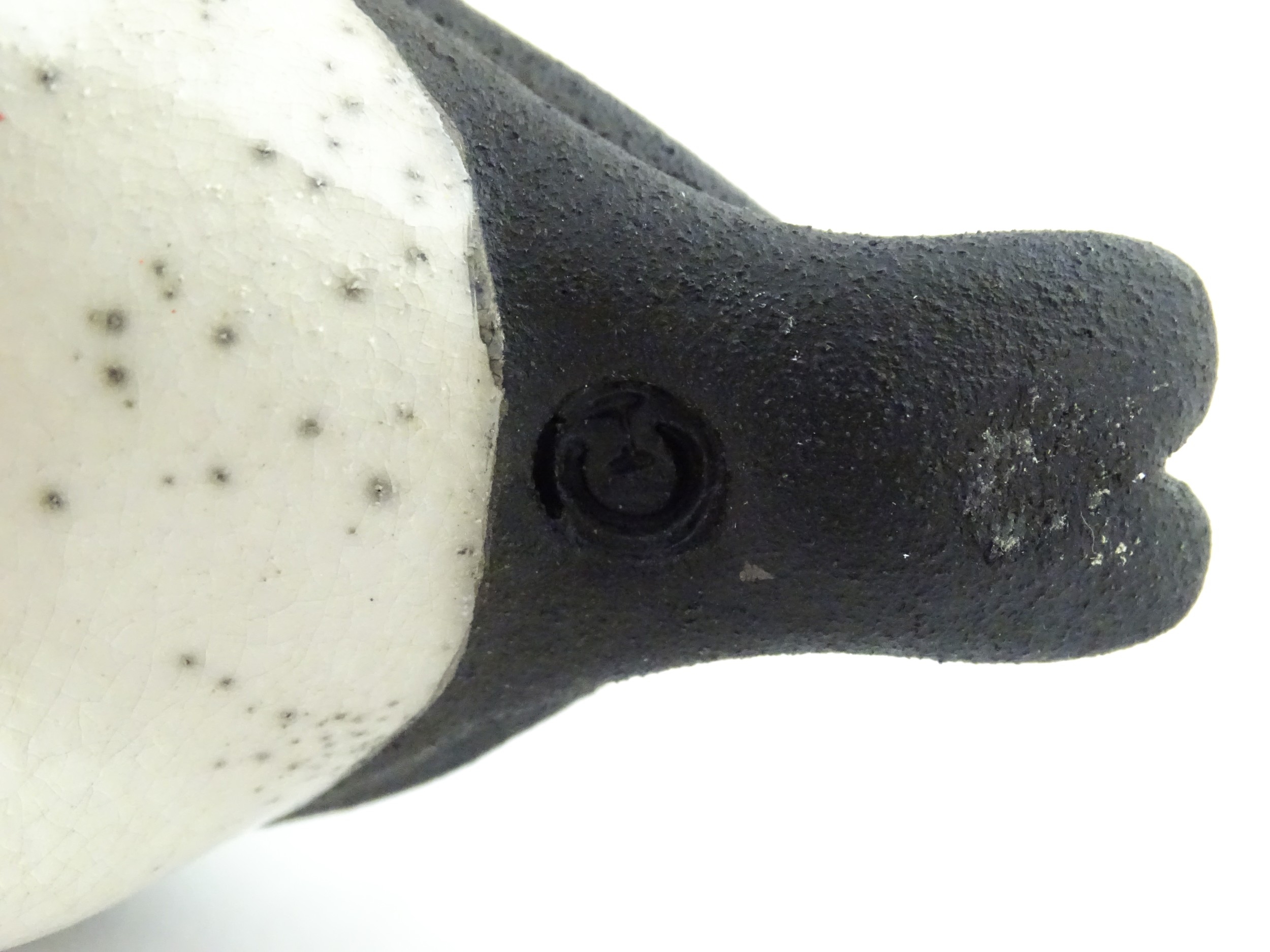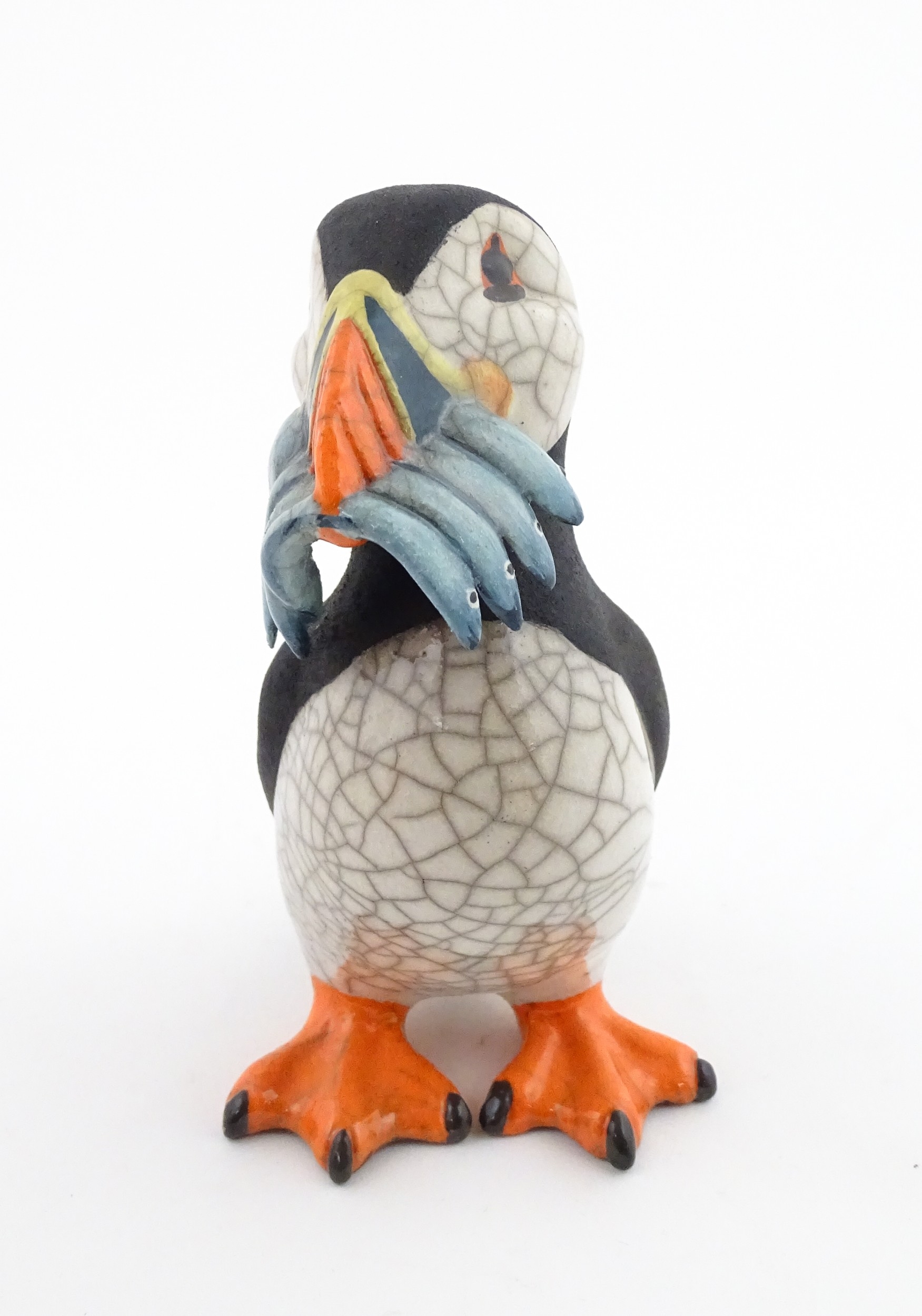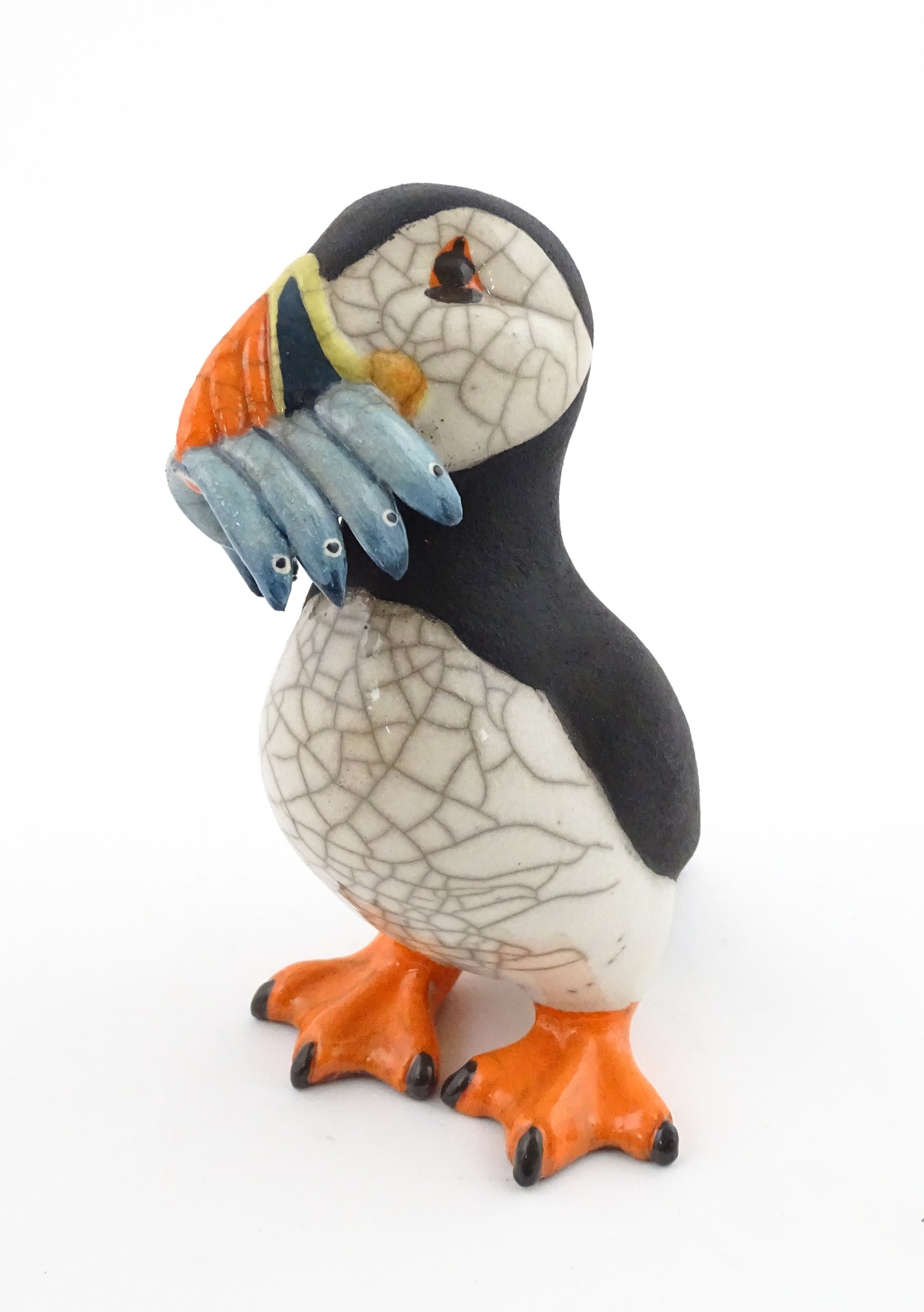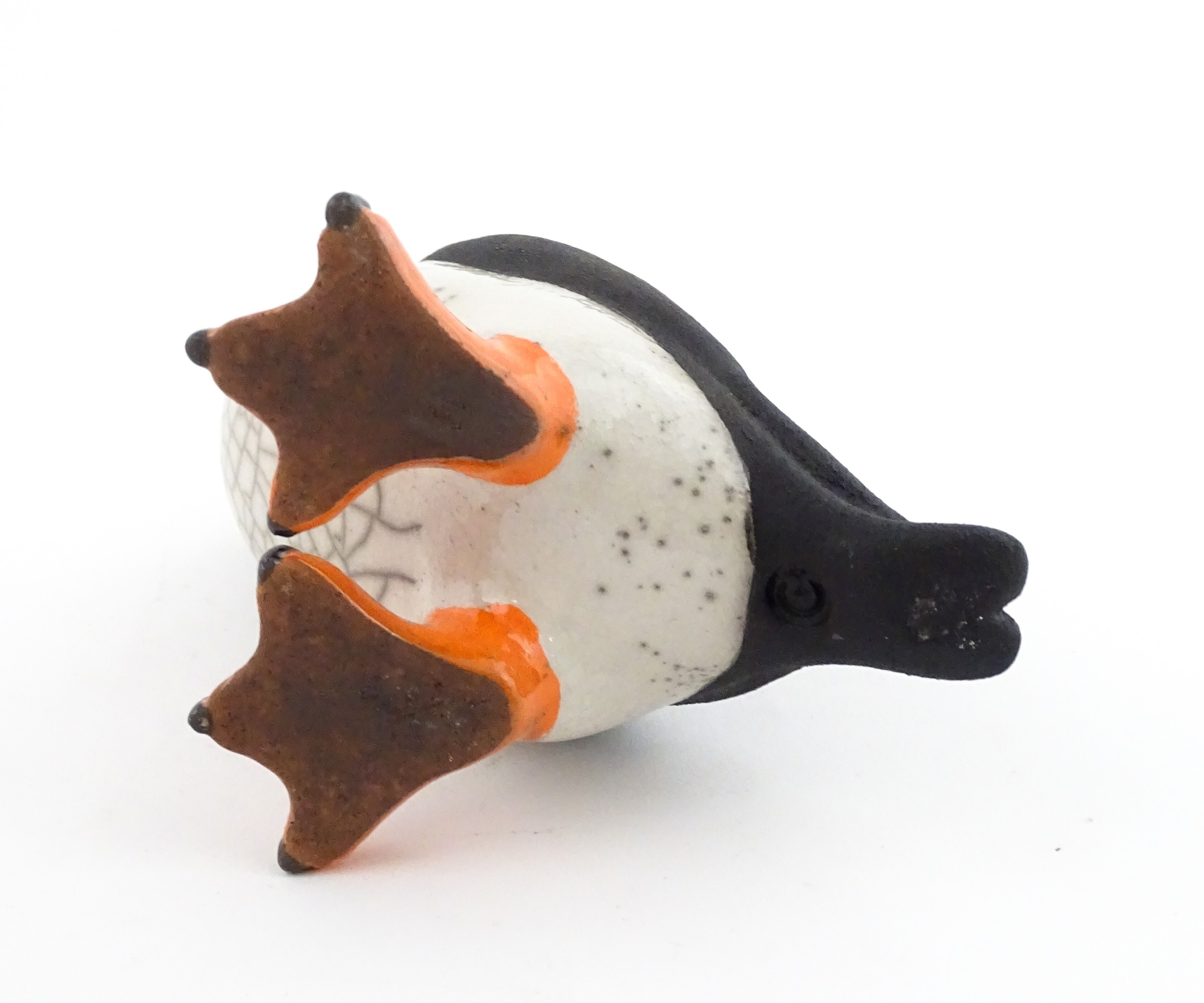 A studio pottery raku fired model of a puffin by Chloe Harford. Marked under. Approx. 6 3/4" high