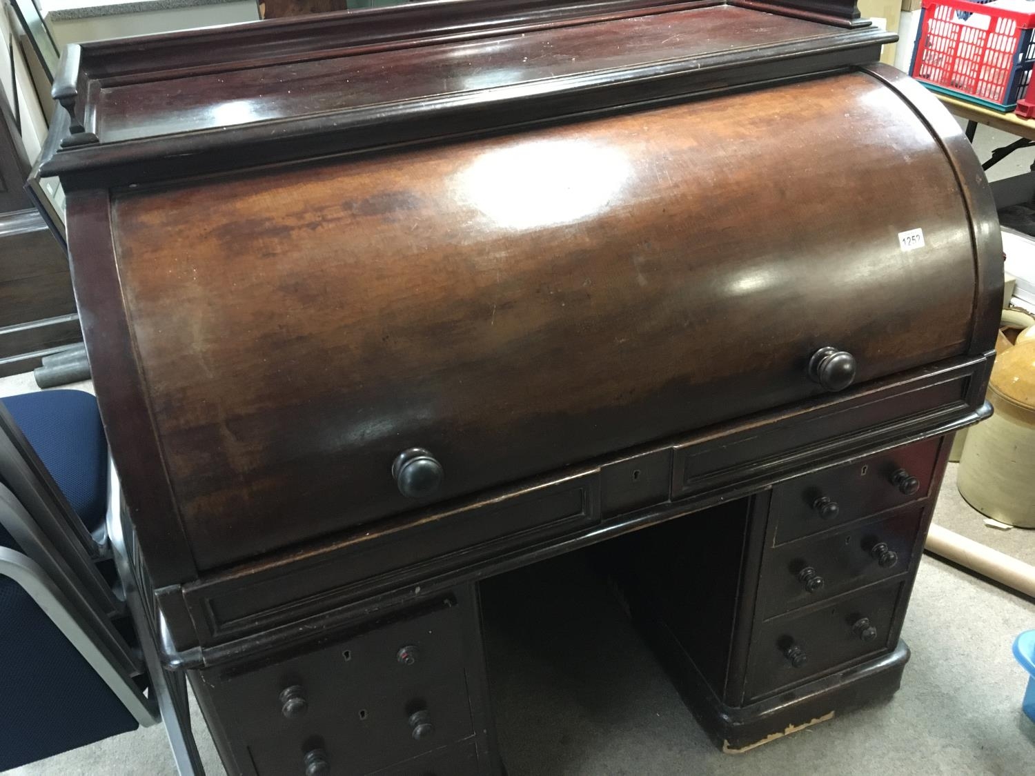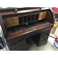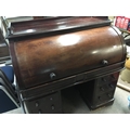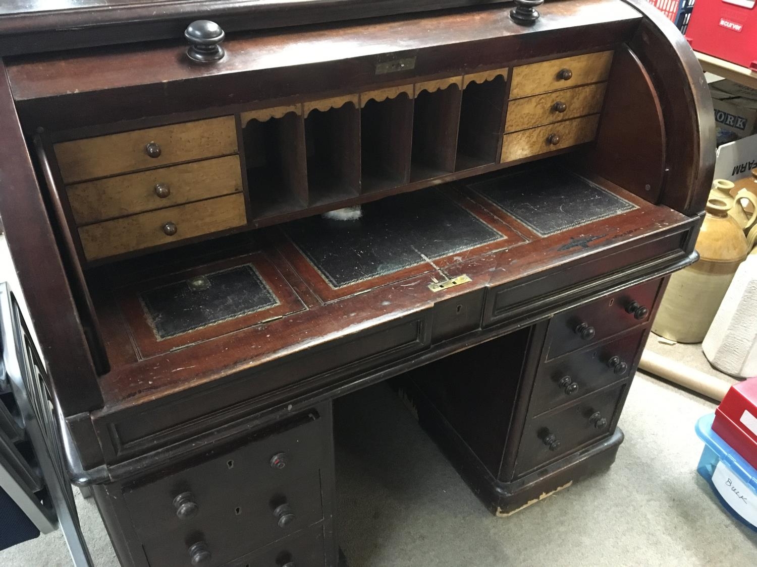A Victorian mahogany cylinder bureau with a well fitted interior with satin birch drawers. Above further pedestal drawers.