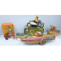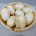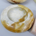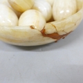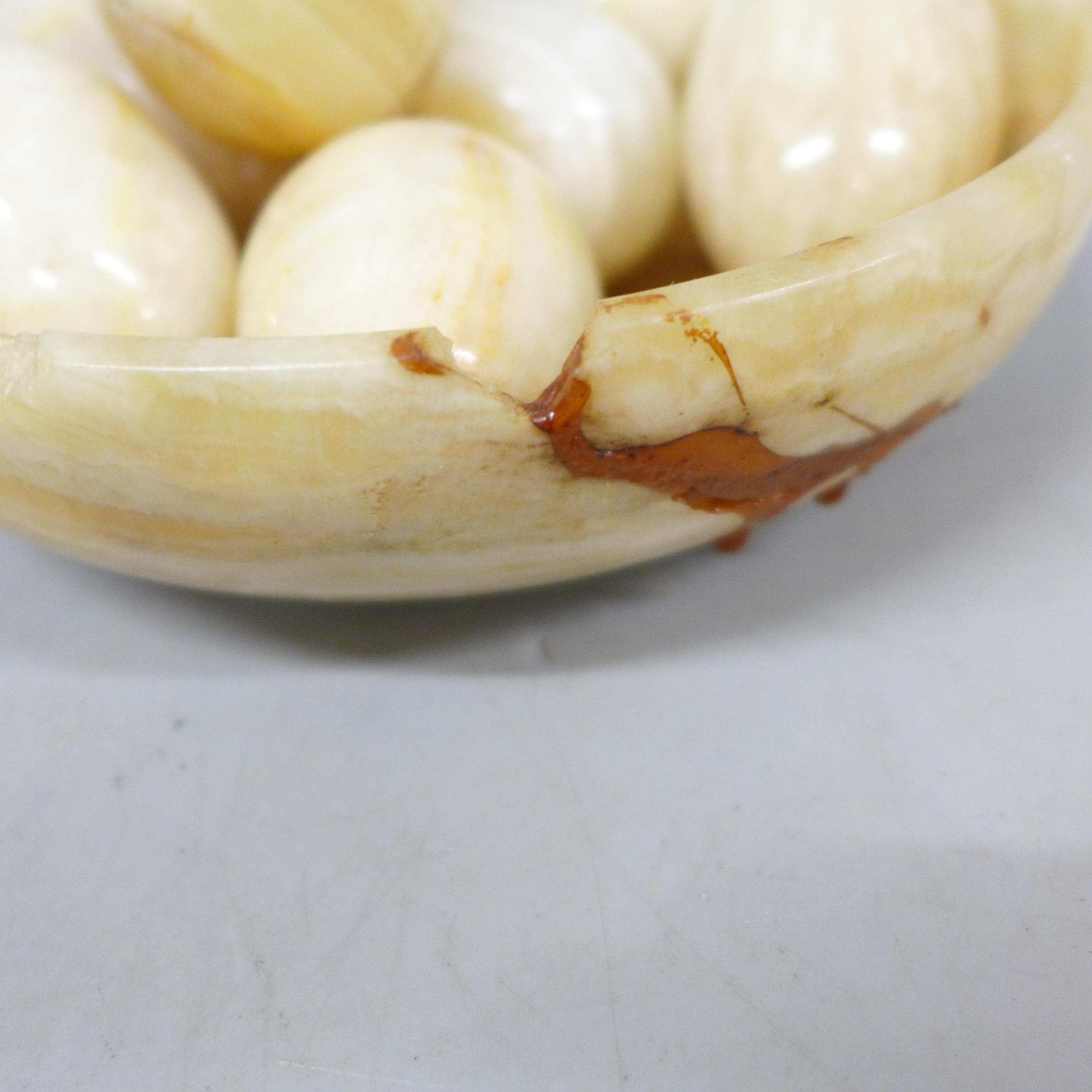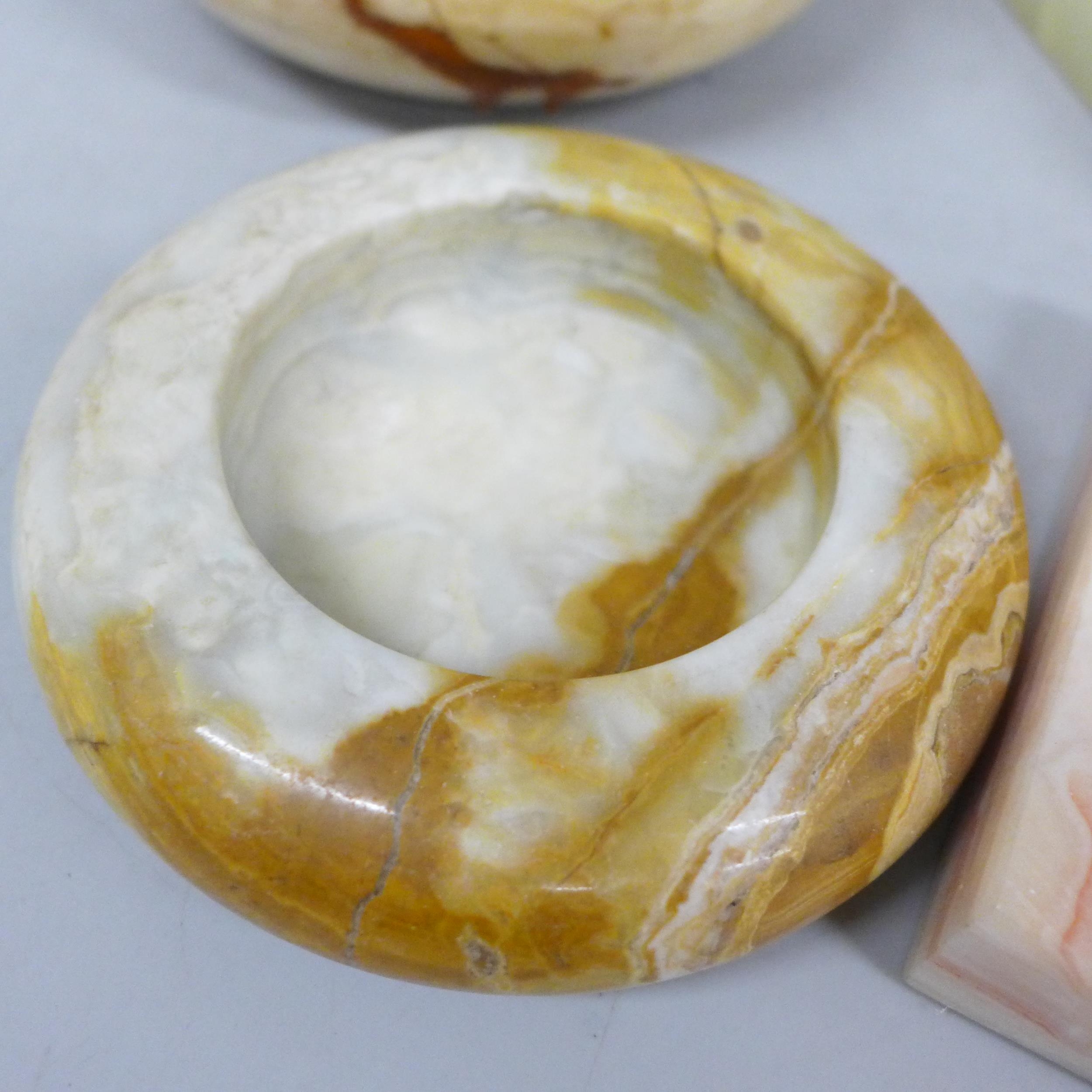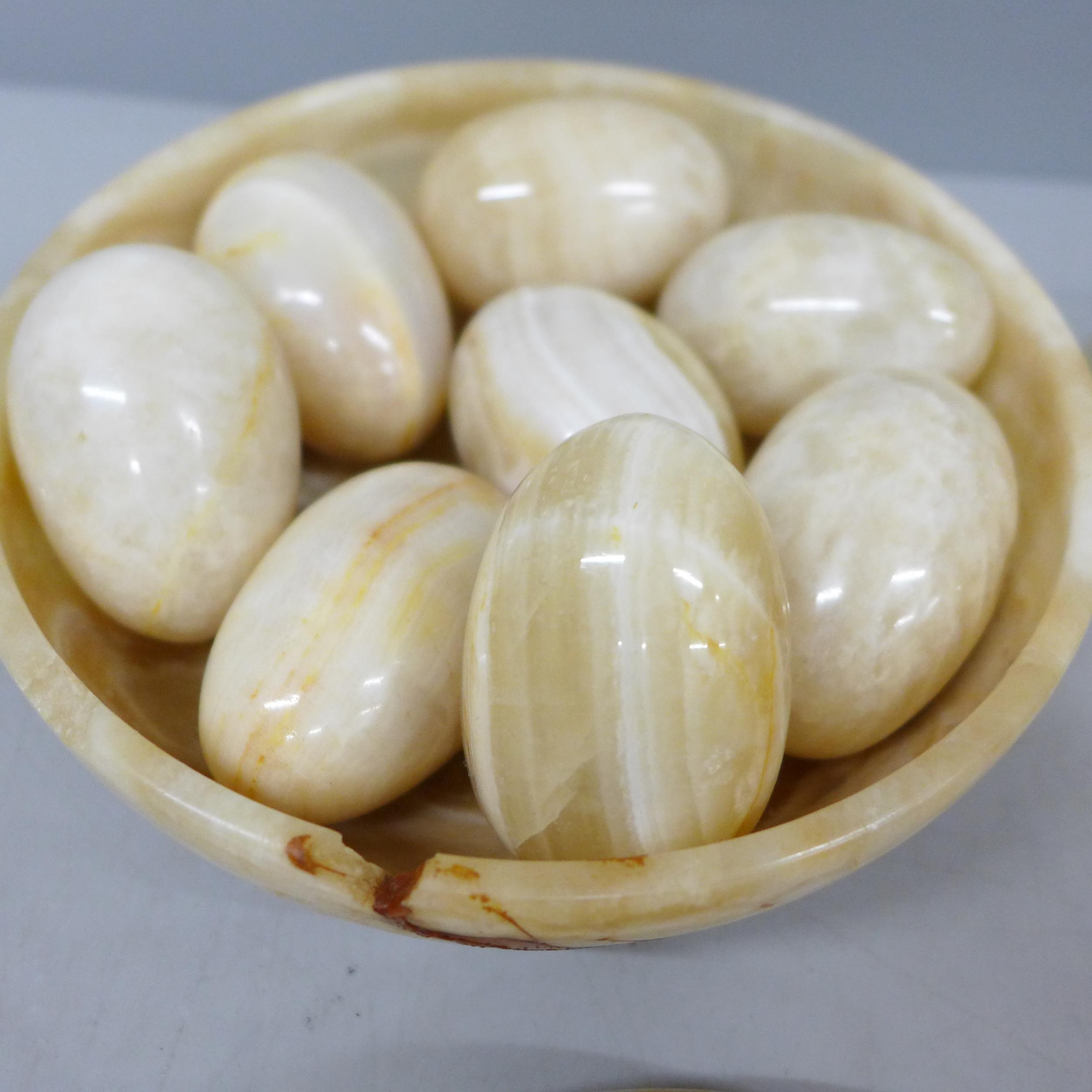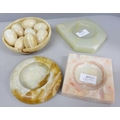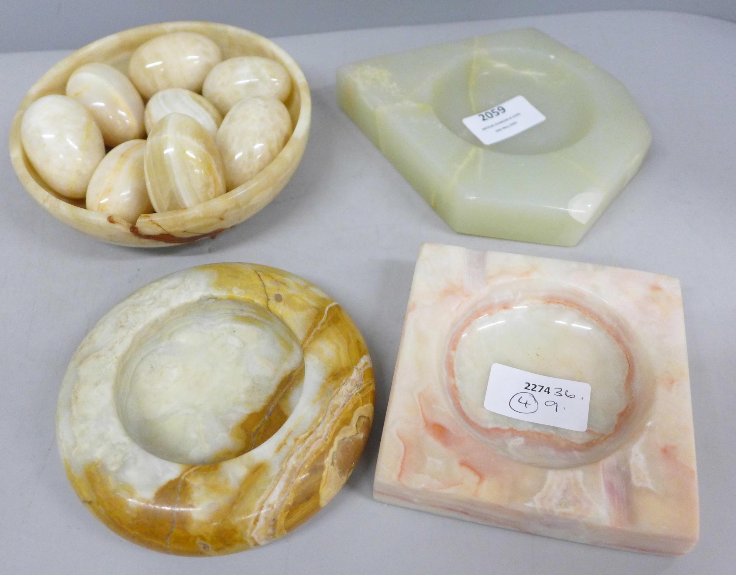 A collection of decorative onyx eggs in a bowl together with three ashtrays, two a/f