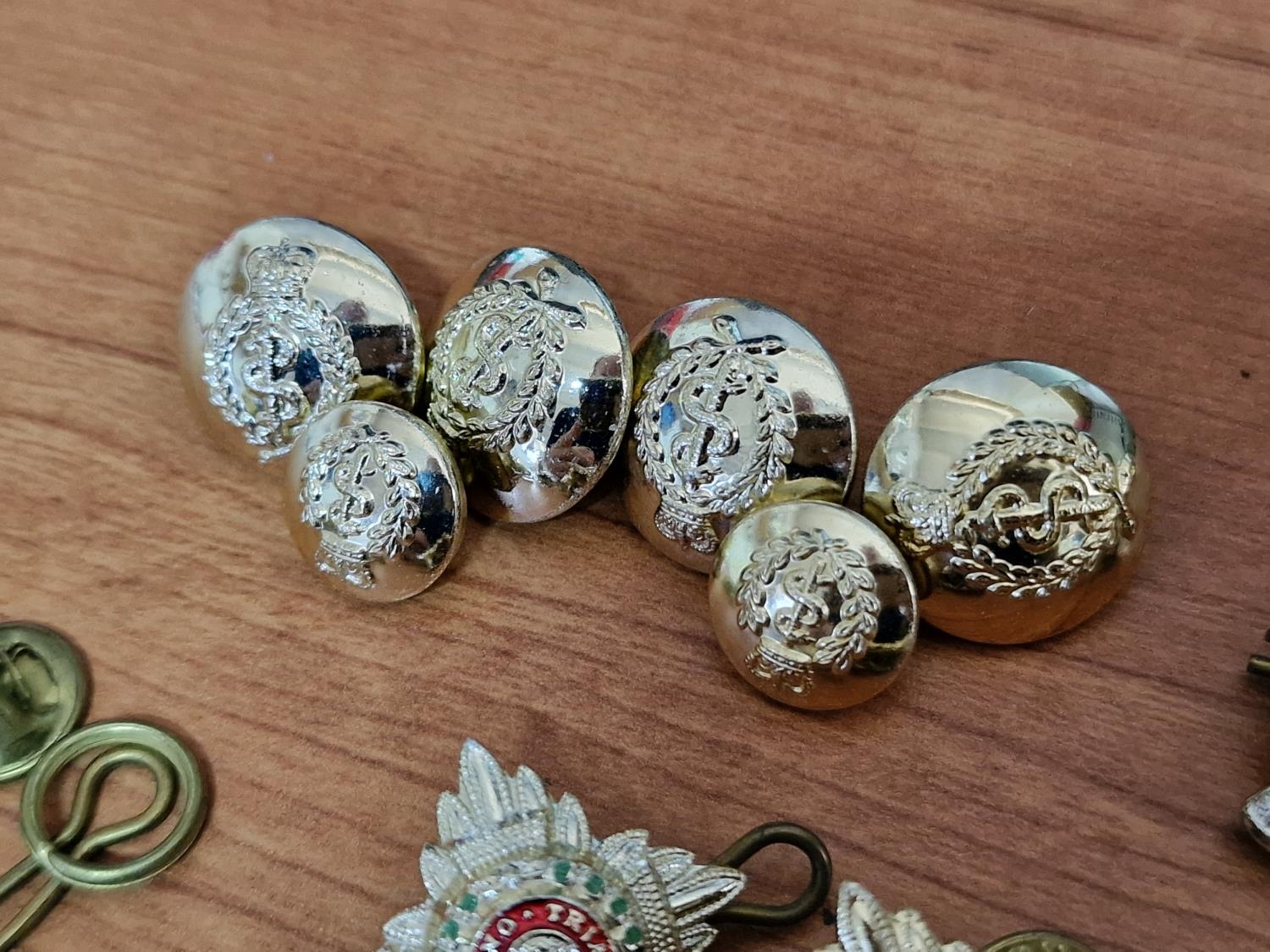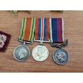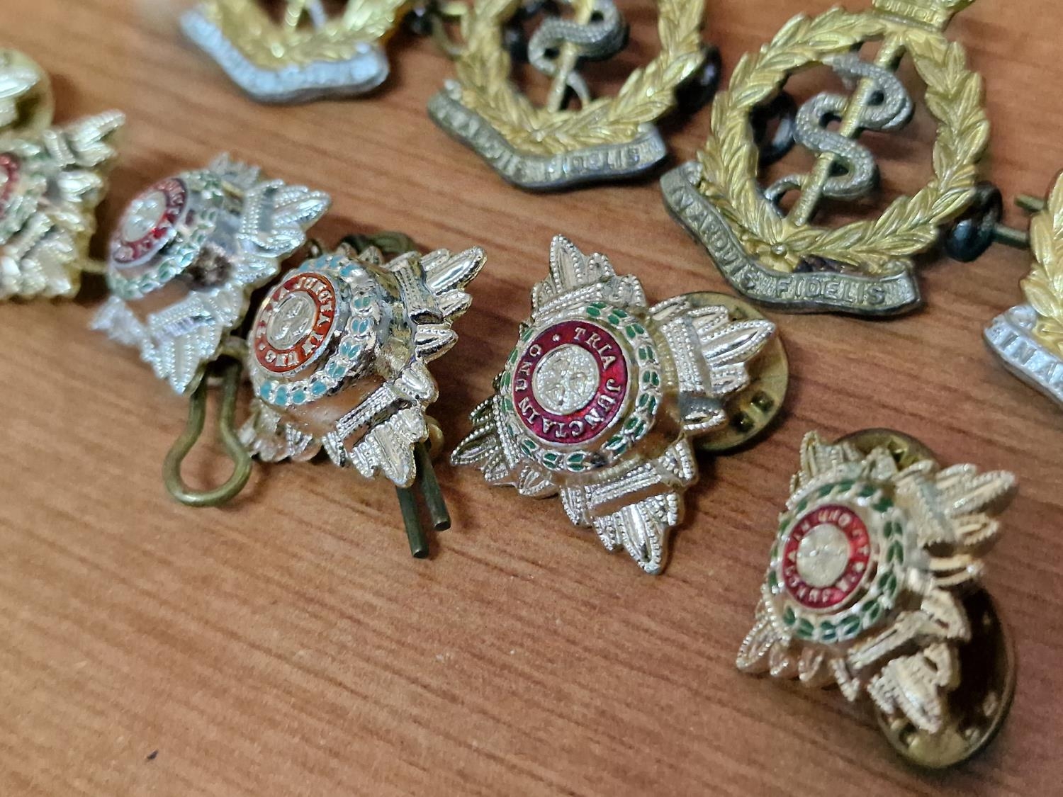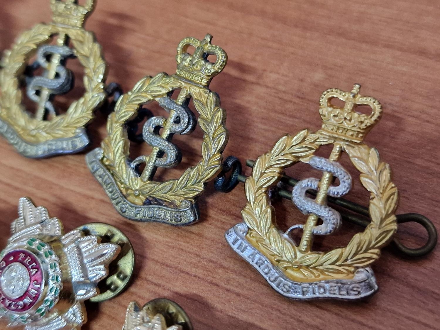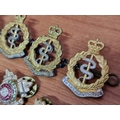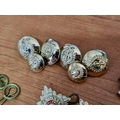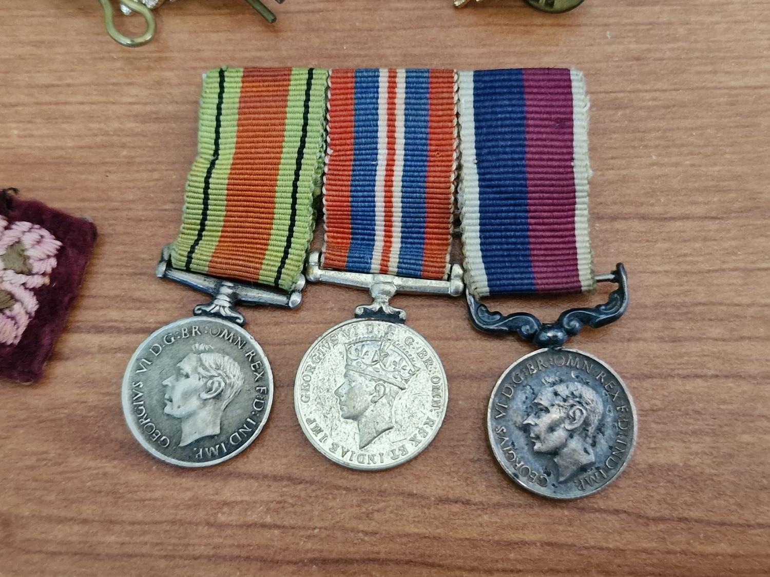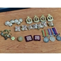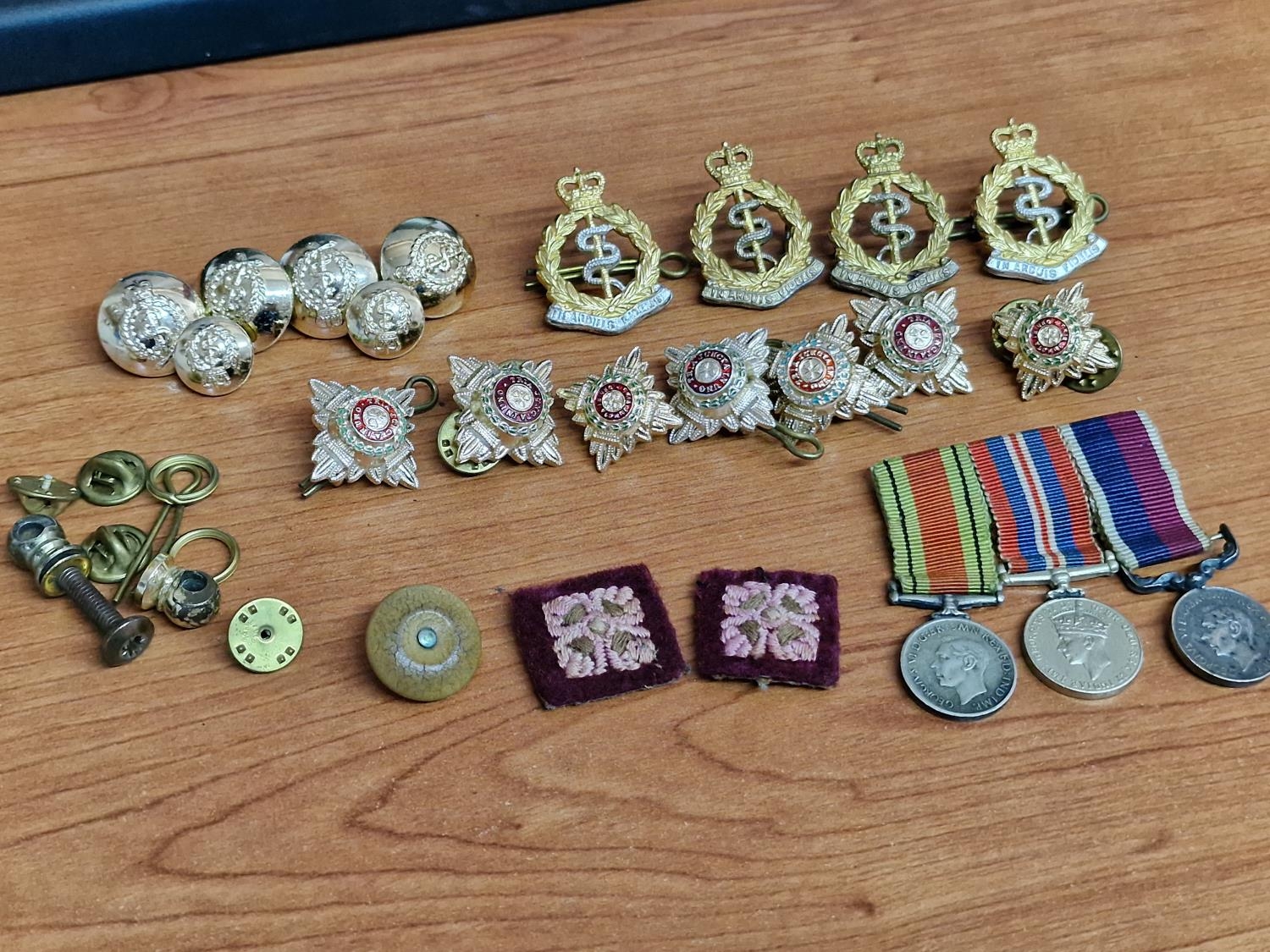 Collection of Military Badges, Pins & Medals, etc, Incl. WWII Set of Medals on Triple Ribbon; Long Service & Good Conduct, Defence Medal and King George VI Service Medal, Together with Royal Army Crops Cap Badges, Buttons and Military Officers Soldier Star Pips, Badges, etc