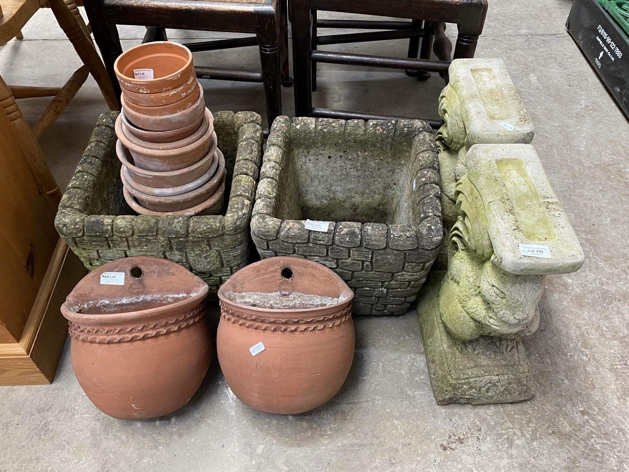 2 stone effect planters, terracotta plant pots, 2 terracotta wall planters etc, in various sizes