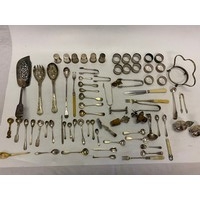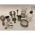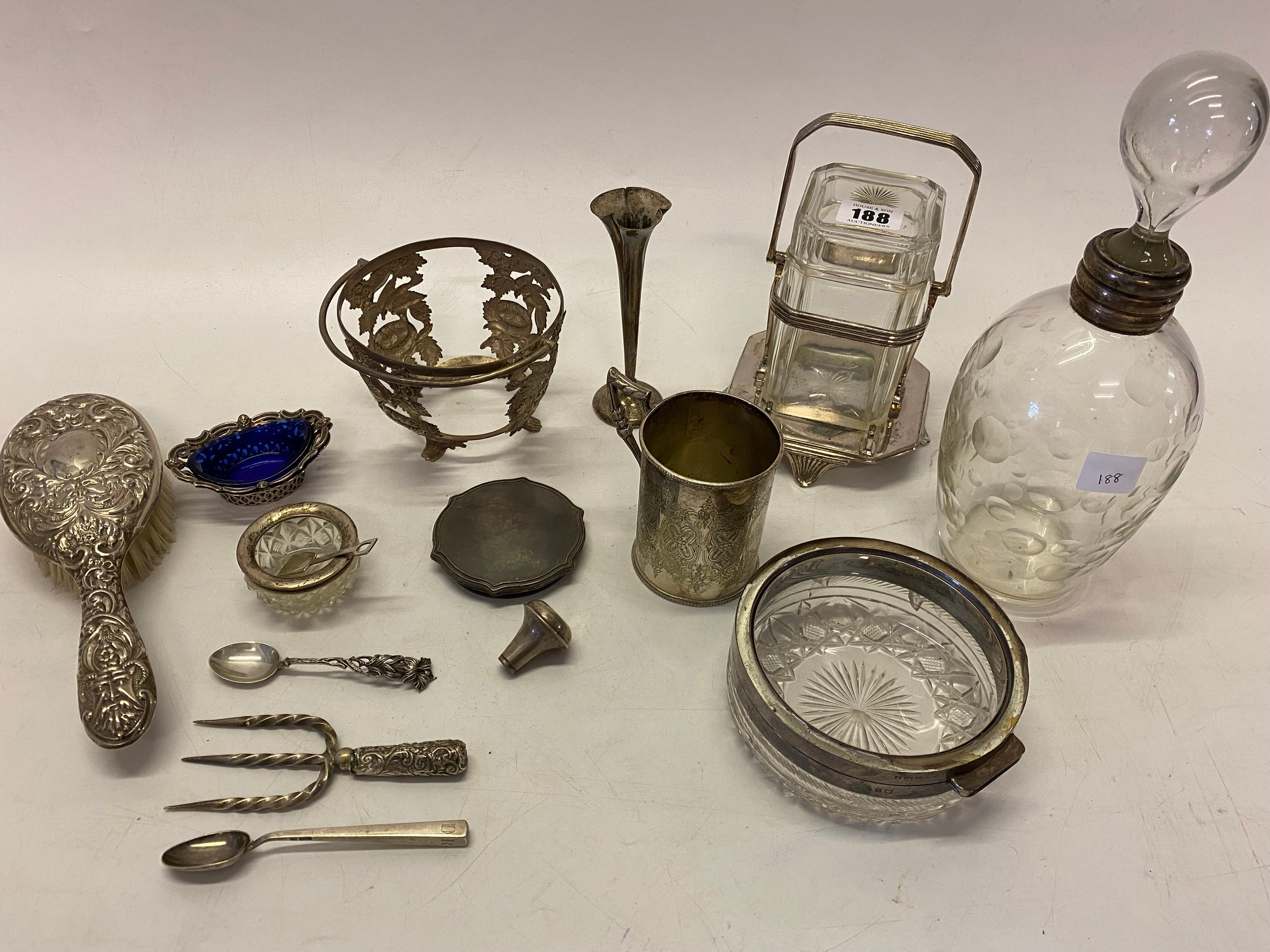 A glass pickle jar of square form on a Walker and Hall silver plated frame, a silver plated christening mug, a glass decanter with silver coloured metal triple ring and a hob nail cut glass powder bowl base with silver rims, plated sugar basket frame, pair of silver plated bon bon dishes, hand mirror in a repousse silver frame, Continental silver spoon, lid, bread fork with repousse decorated handle etc..