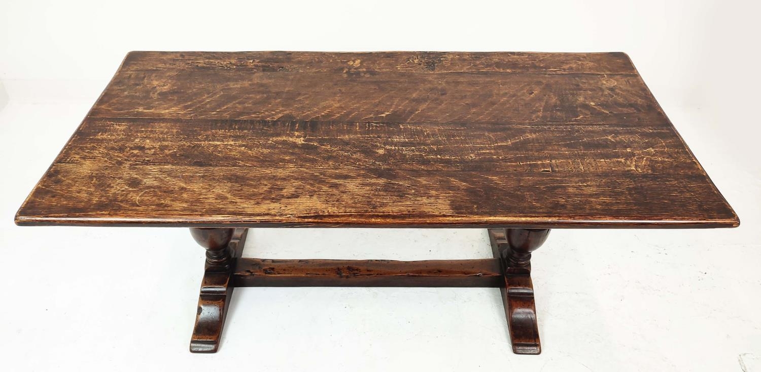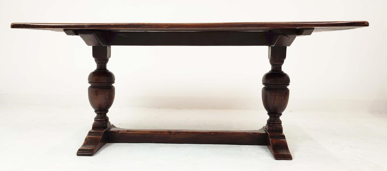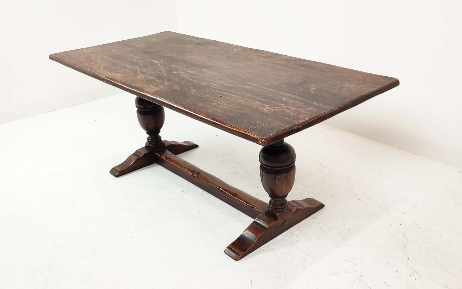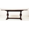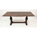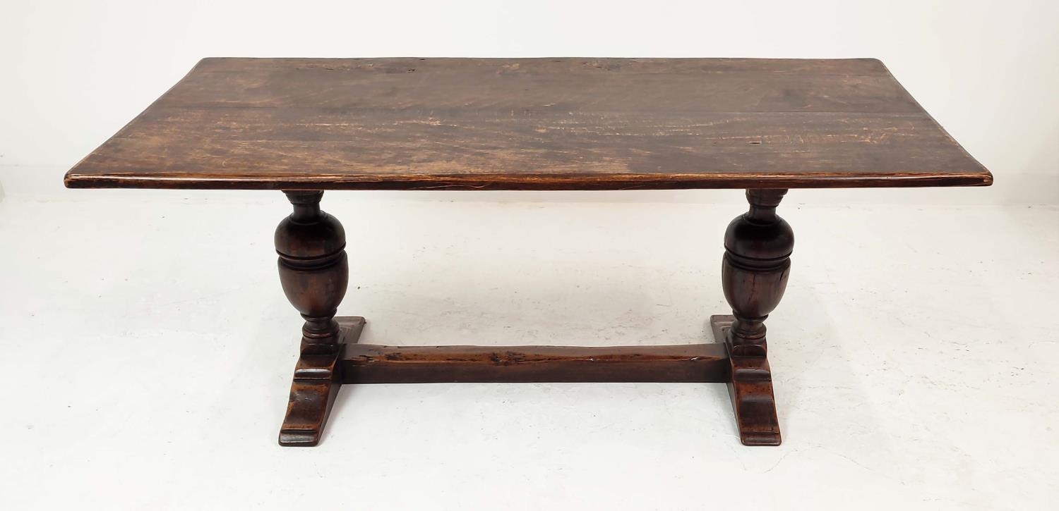 REFECTORY TABLE, Jacobean style oak, the rectangular top on carved balaster bases, 185cm W x 83cm D x 81cm H.