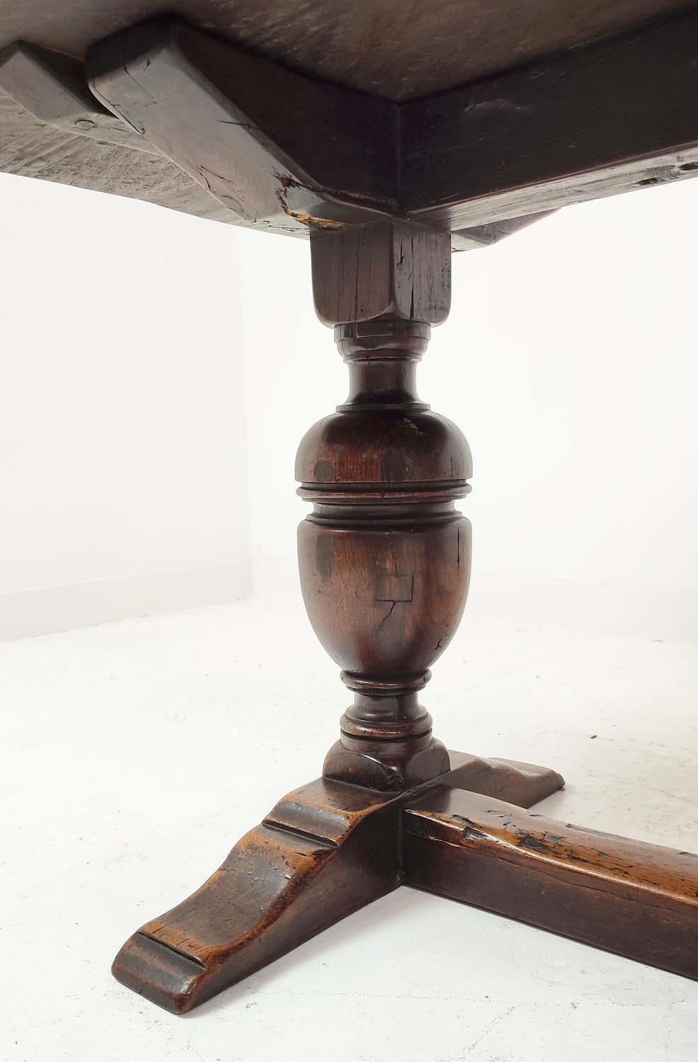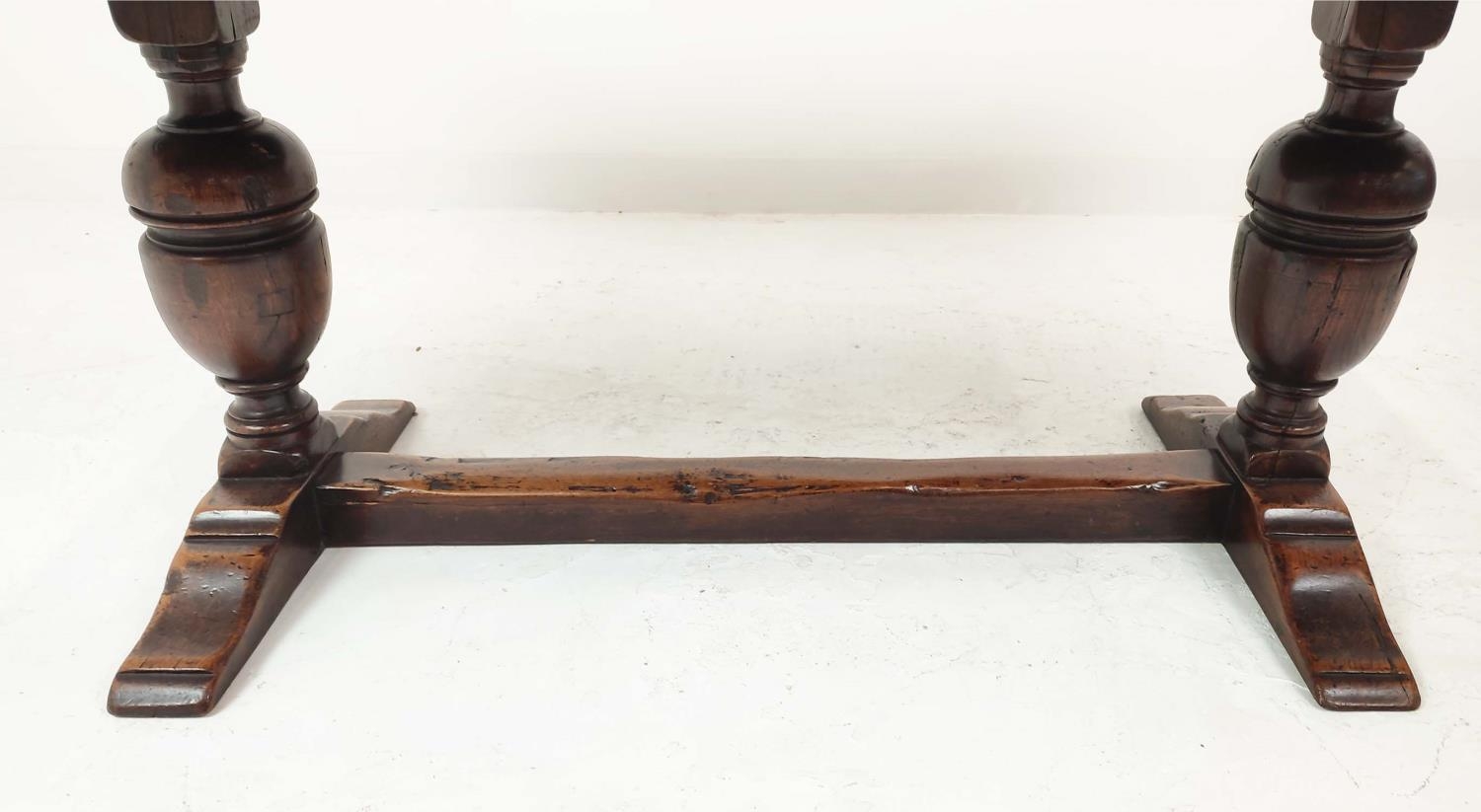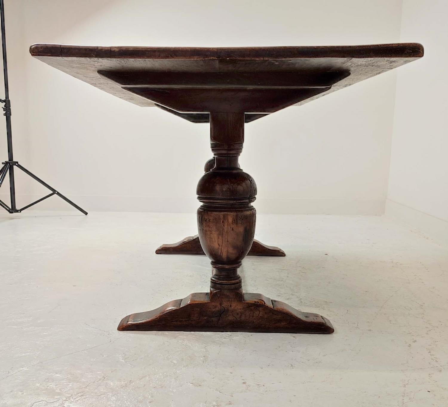 REFECTORY TABLE, Jacobean style oak, the rectangular top on carved balaster bases, 185cm W x 83cm D x 81cm H.