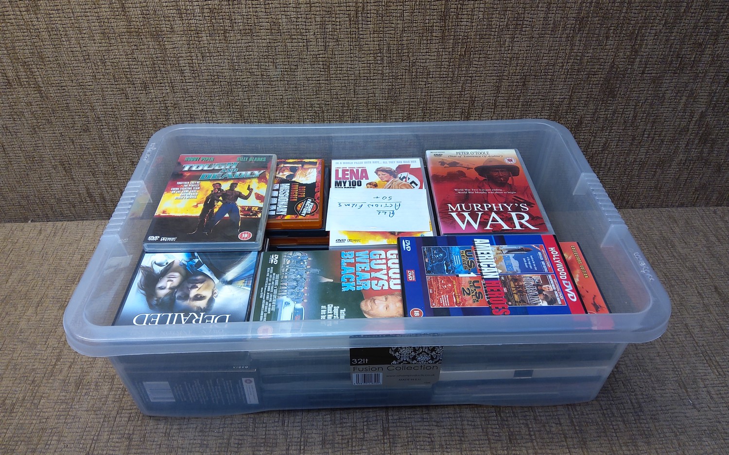 Box of action film DVD's