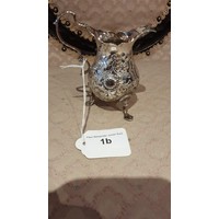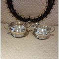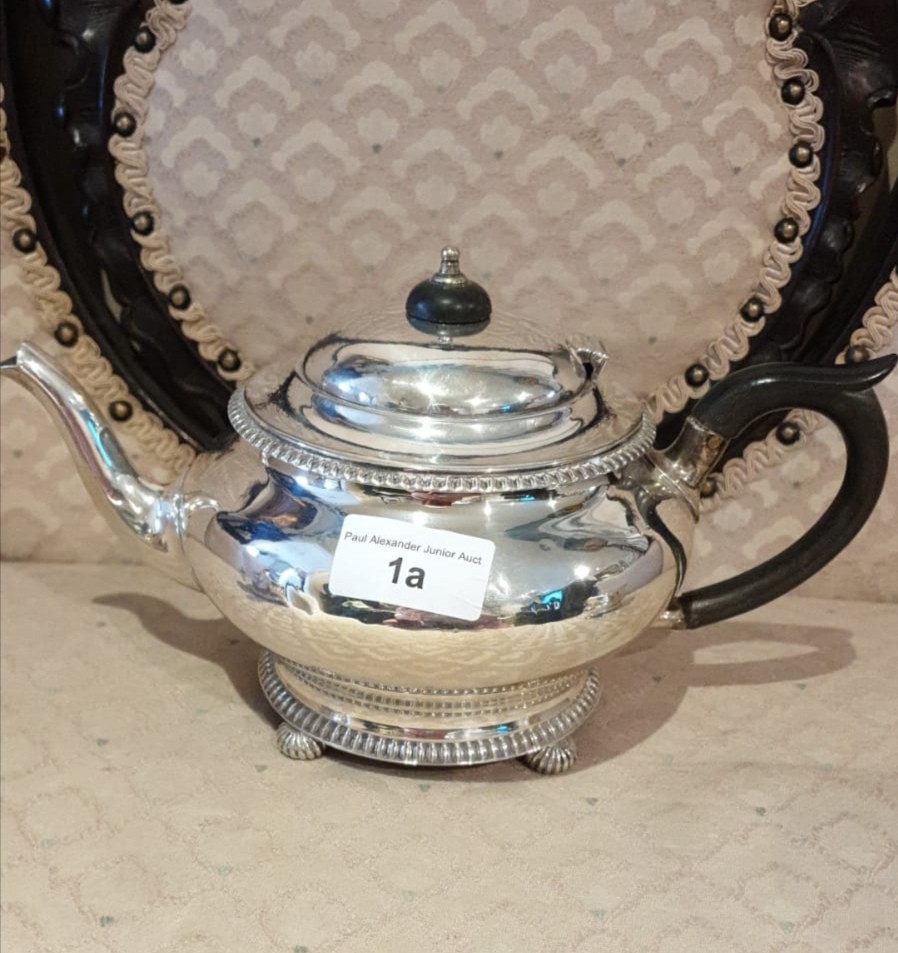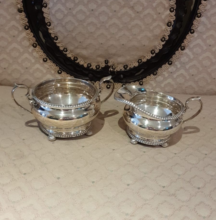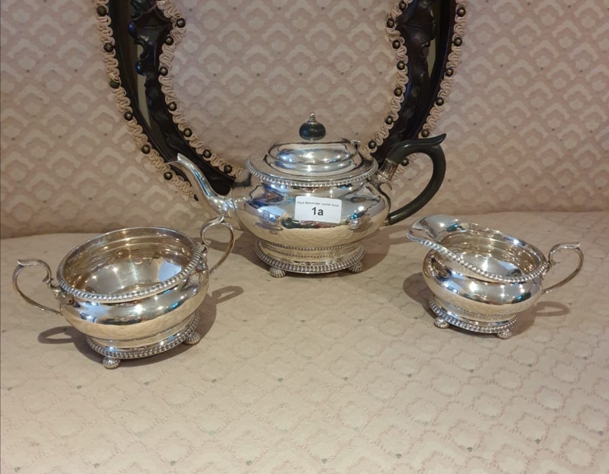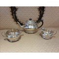 3 piece silver Hall marked tea service on pad feet serrated edges to top and bottom. 900 grams.