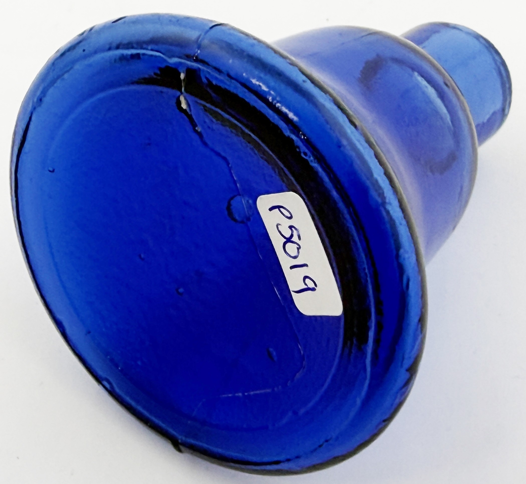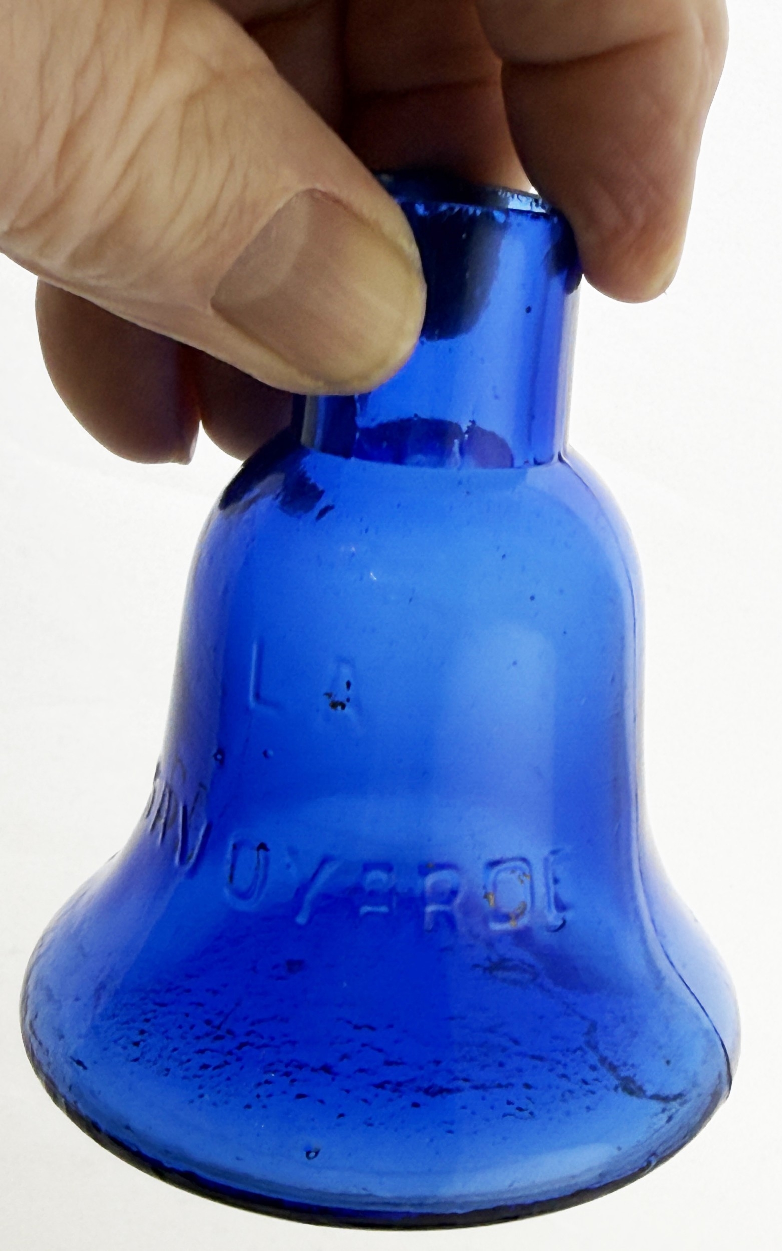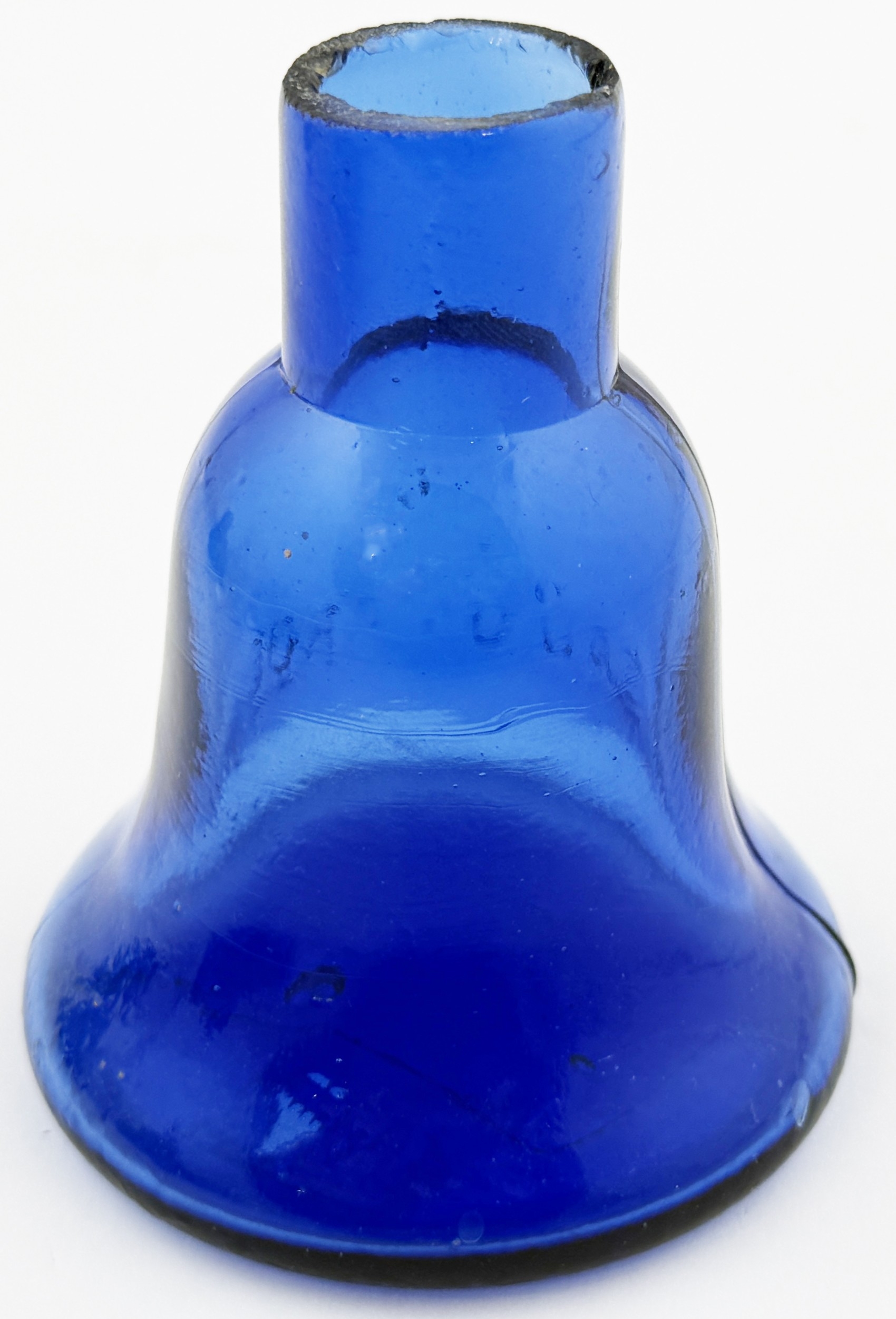 COBALT BLUE BELL INK/ GUM BOTTLE. 3.25ins tall. Large blue glass bell shaped gum, ground lip, embossed LA/ SAVOYARDE to the front. Minor inside of ground lip nibble (probably in-manufacture) otherwise excellent. Not seen one before? NR