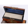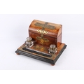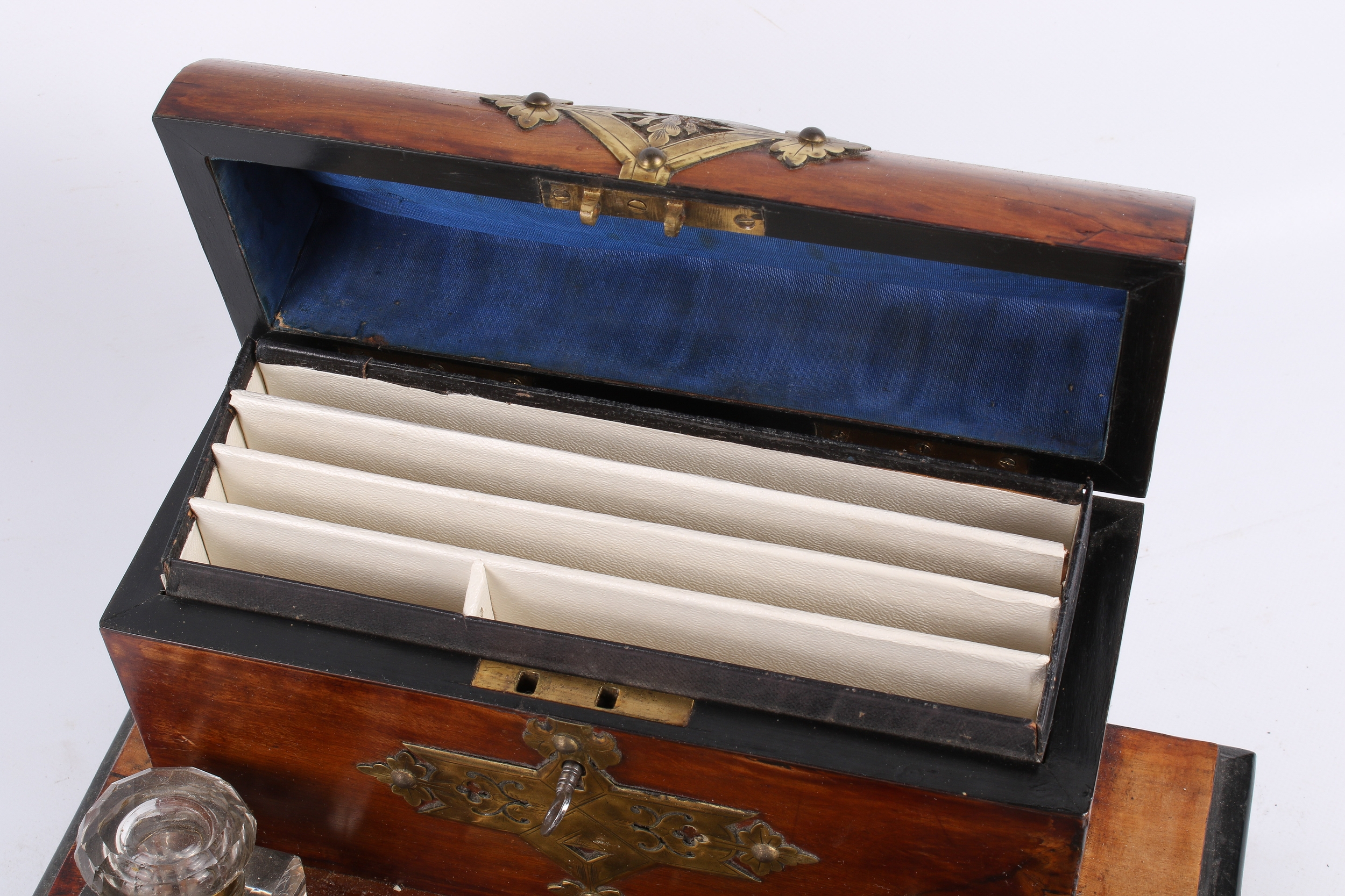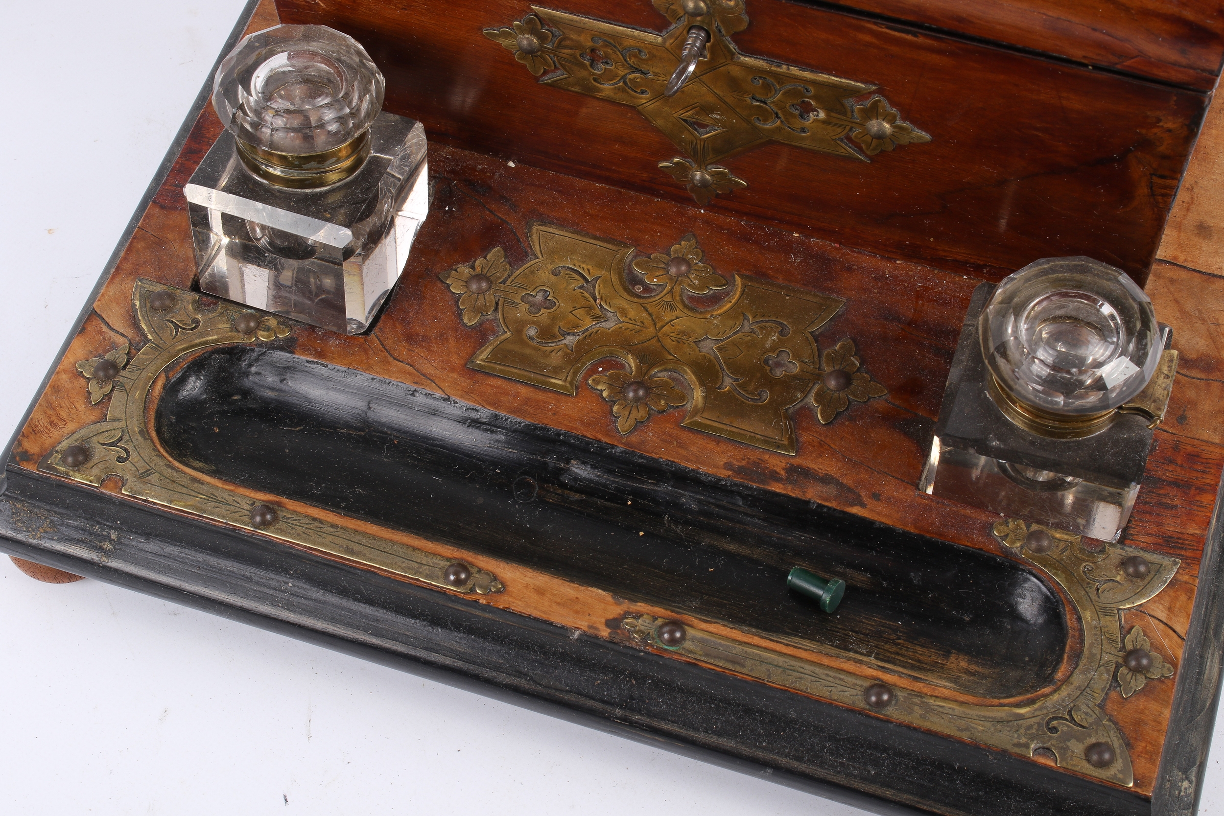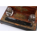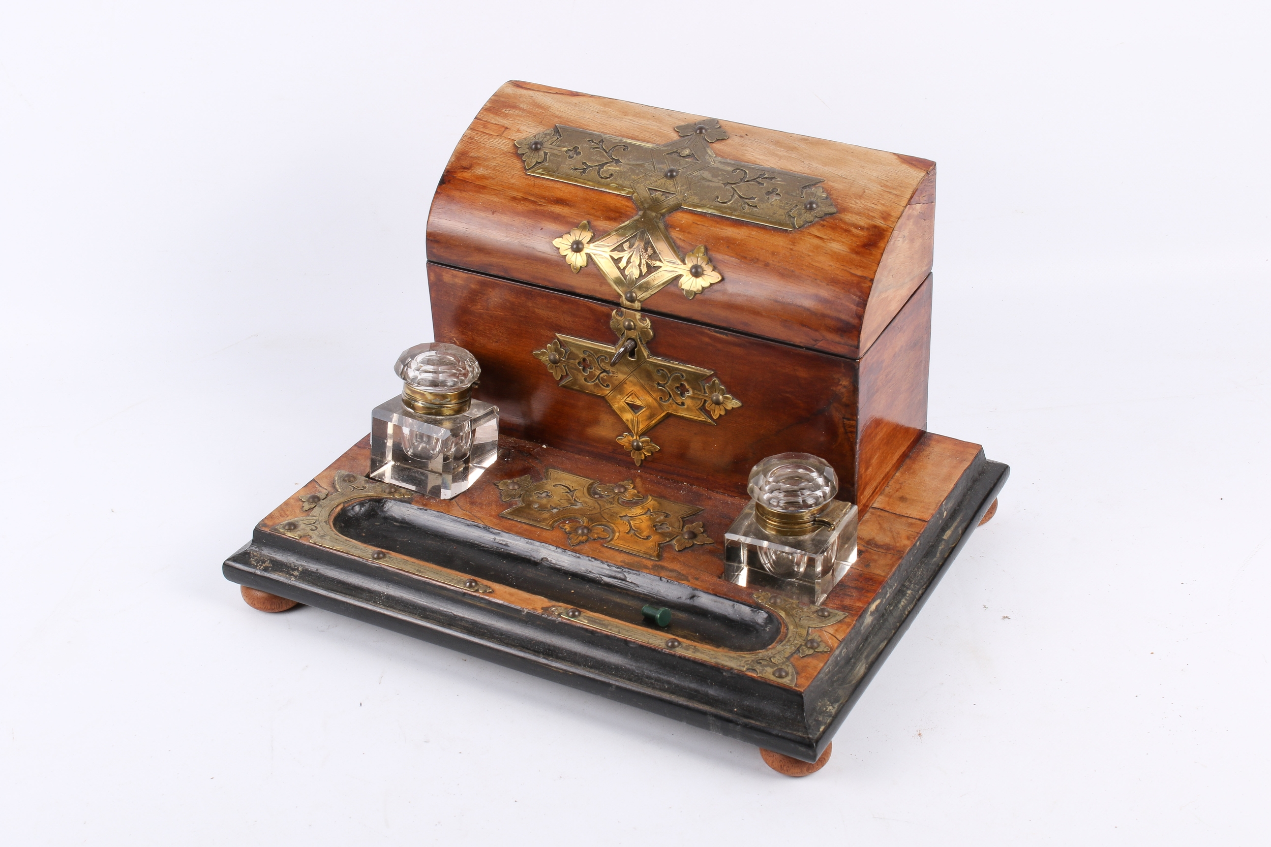 A Victorian brass mounted walnut desktop inkstand. Fitted with a stationary box lined in fabric and containing a fitted interior, two glass inkwells and a pen rest trough, mounted on bun feet, L30.5cm.