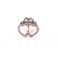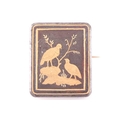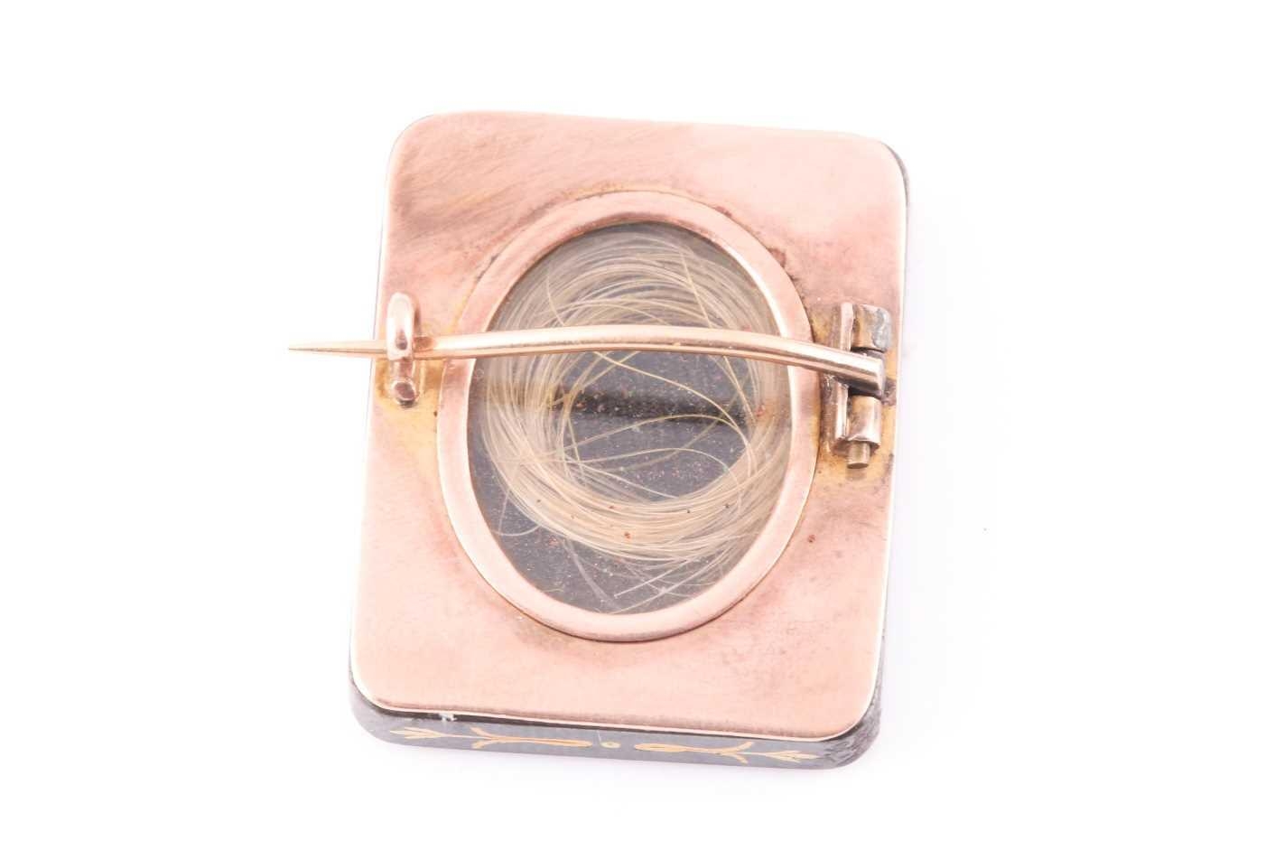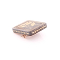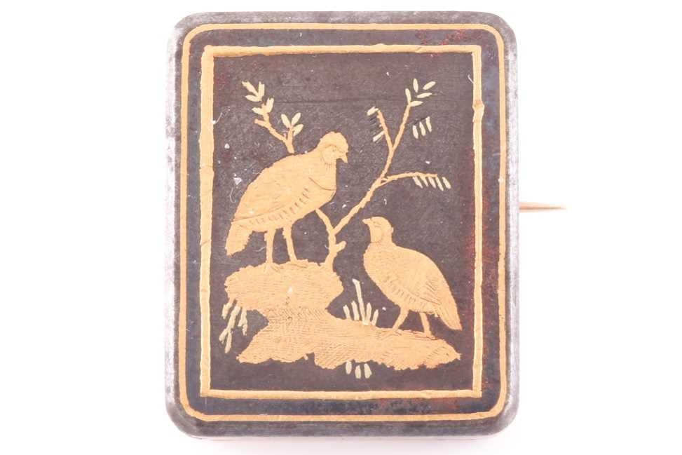 A Victorian damascene brooch, in the Japanese style, depicting a gilt inlaid image of two birds in a naturalistic landscape, with glass aperture to verso containing a lock of hair, 2.4 x 2 cm.