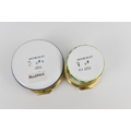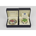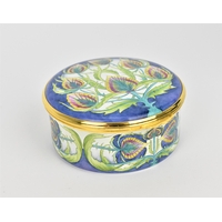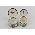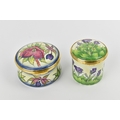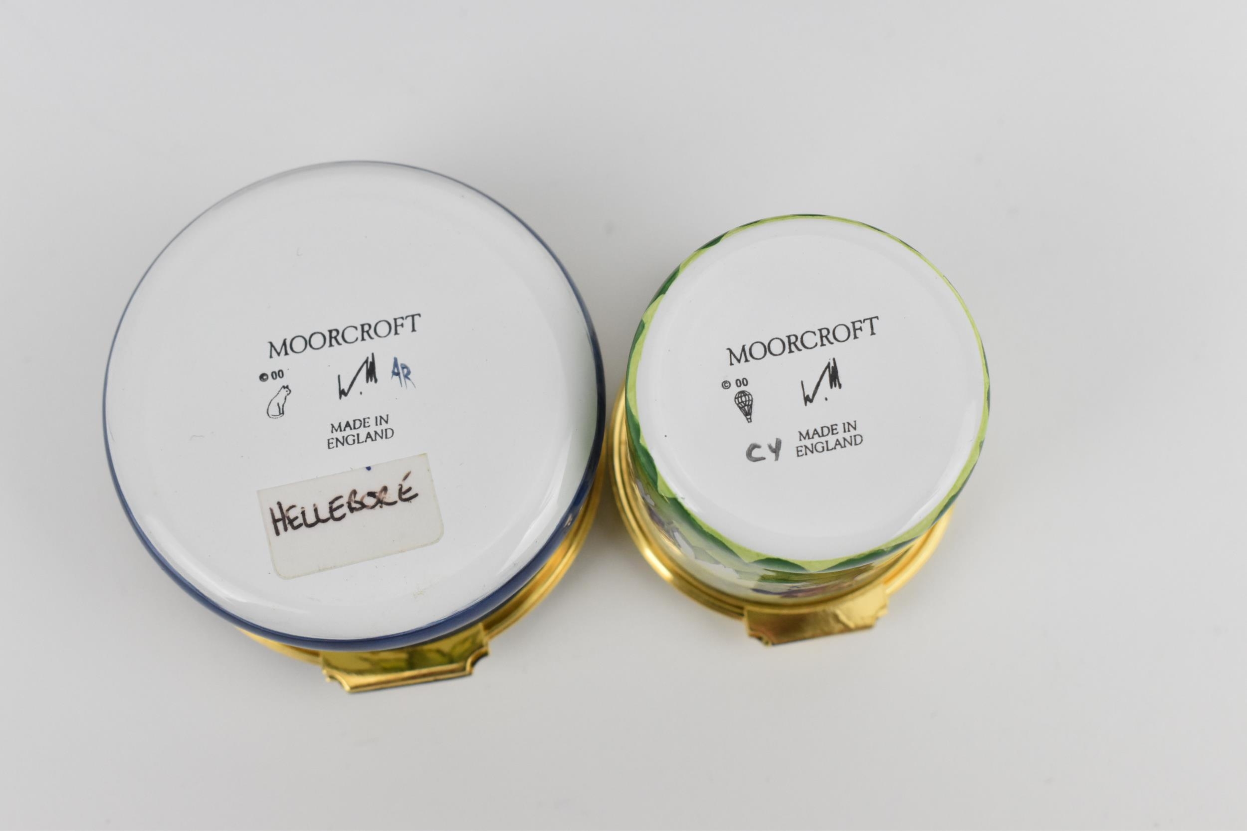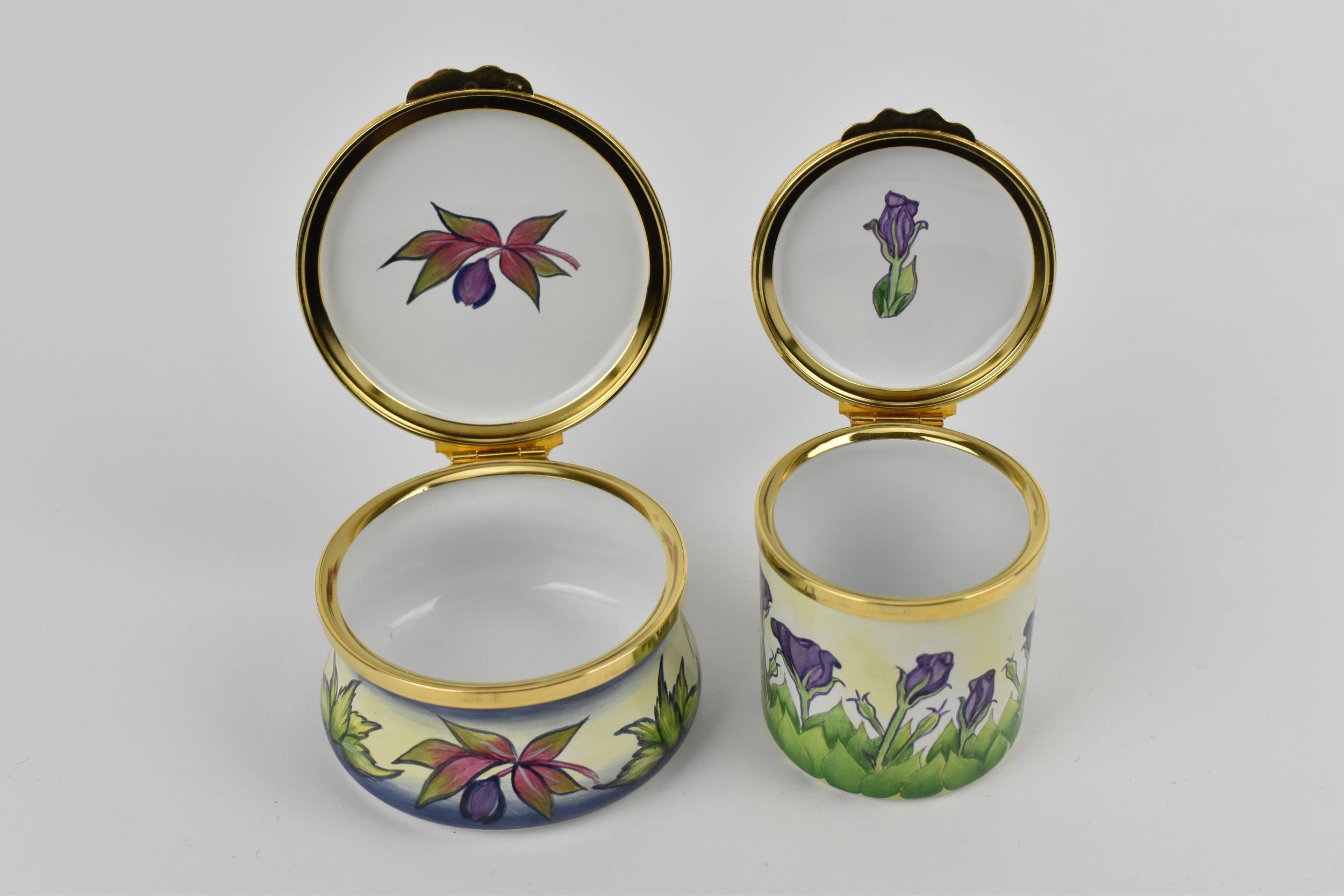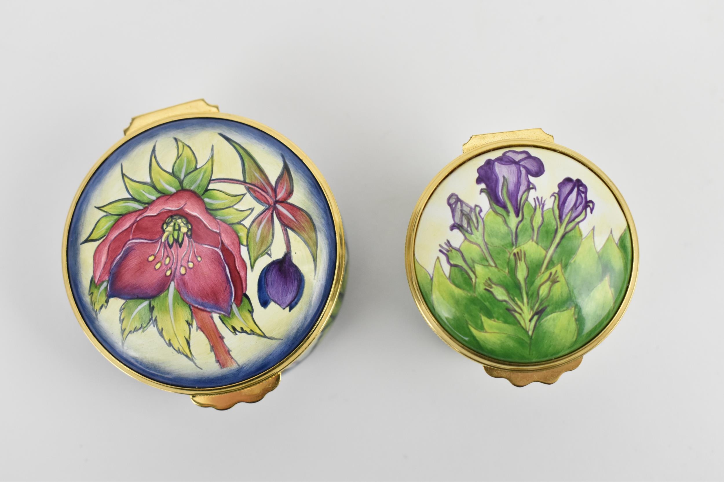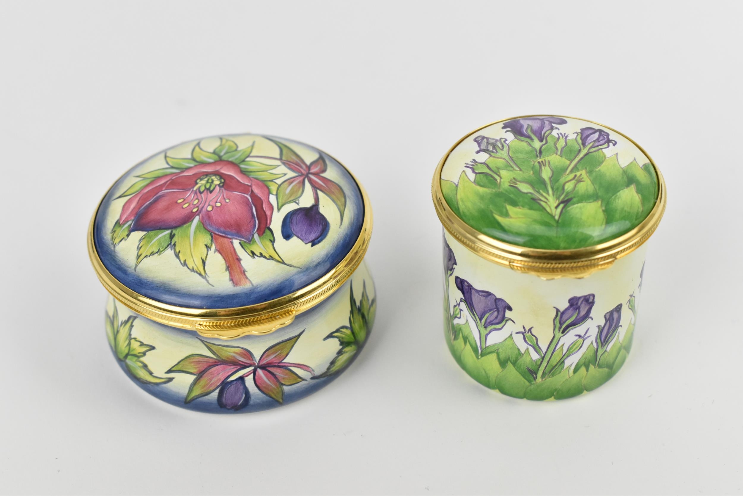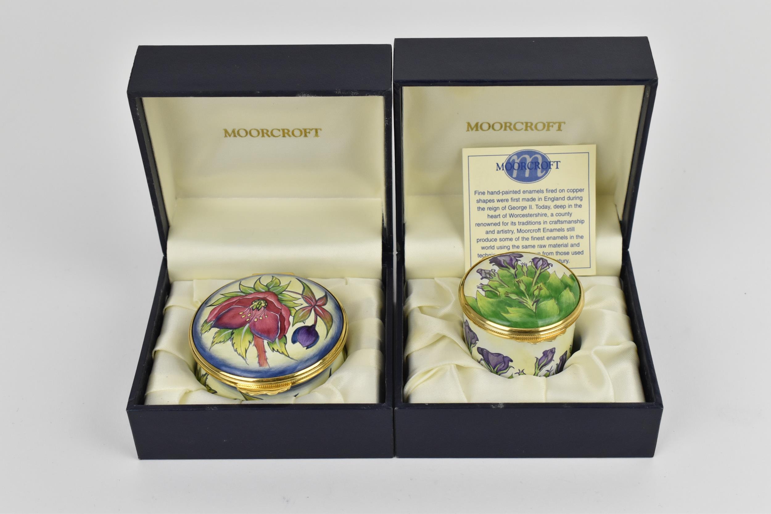 Two Moorcroft Enamels Ltd boxes with hinged lids, both with floral design, the larger one in the 'hellebore' pattern, the other with purple flowers, with artists signatures and marks to underside, in original fitted boxes, the largest 5.8 cm diameter