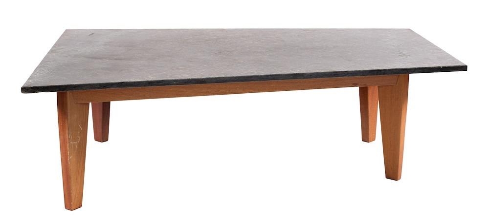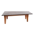 A Continental marble topped teak coffee table, circa 1970s; the trapezoidal Italian green serpentine top on straight tapered legs; 42cm high, 130cm long, 94cm wide