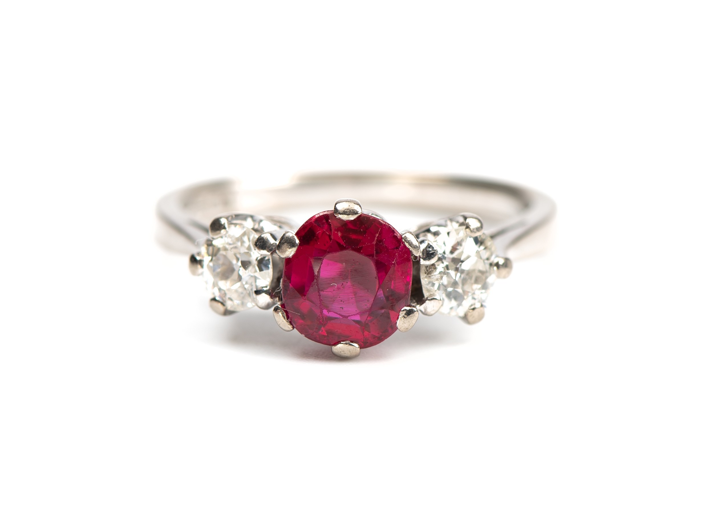 Claw set to the centre the round brilliant cut ruby weighing approximately 1.00 carats, flanked to the sides by a pair of round brilliant cut diamonds, weight approximately 0.50 carats, colour G, clarity VS, in platinum, size K, 4,3g all in