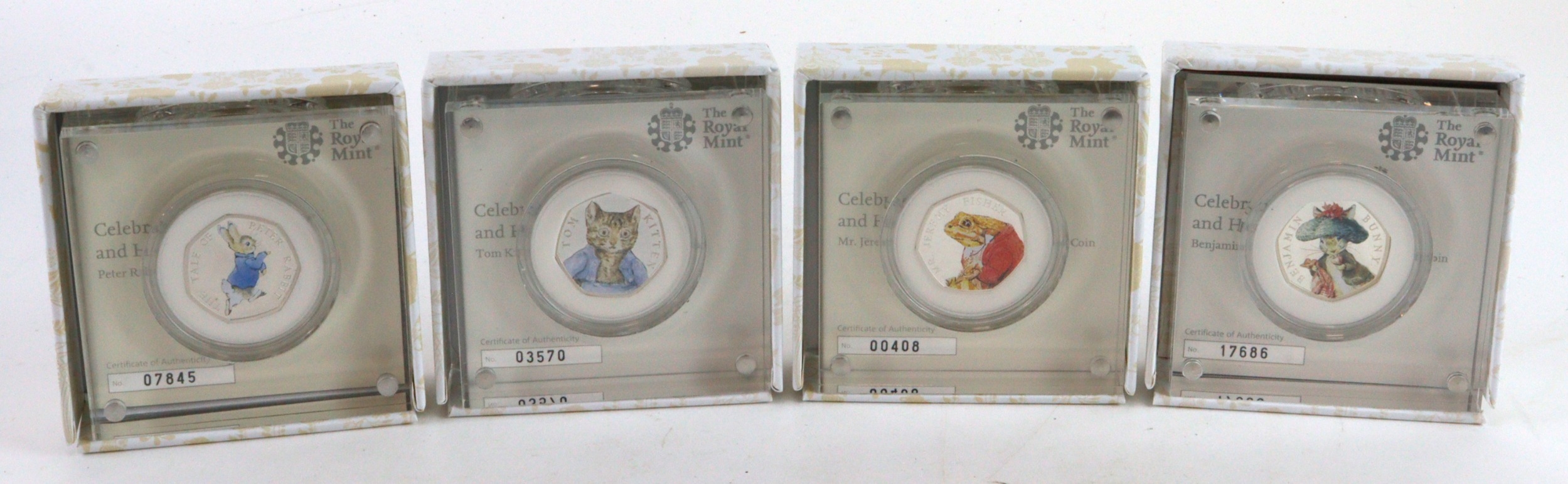 GB Royal Mint (4): Beatrix Potter colourised silver proof 50p's 2017: Peter Rabbit, Benjamin Bunny, Tom Kitten, and Jeremy Fisher, FDC cased with certs and sleeves.