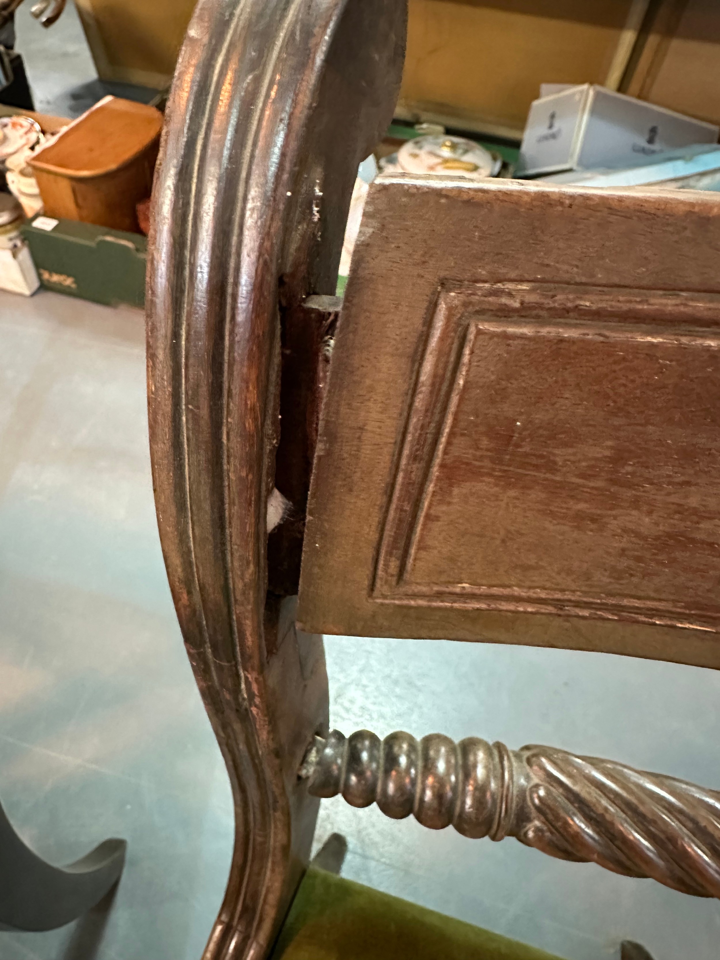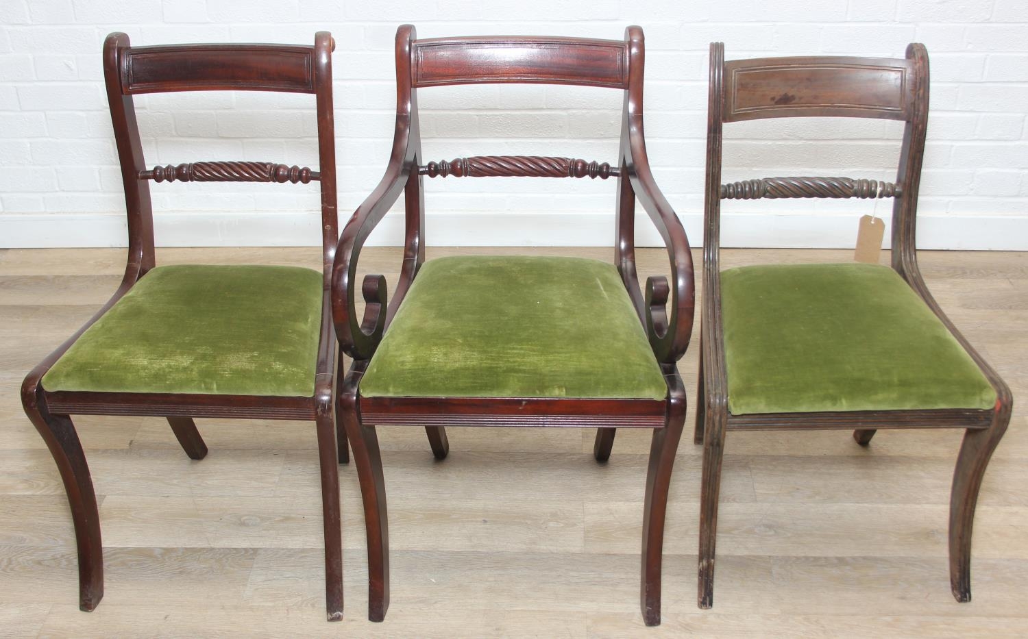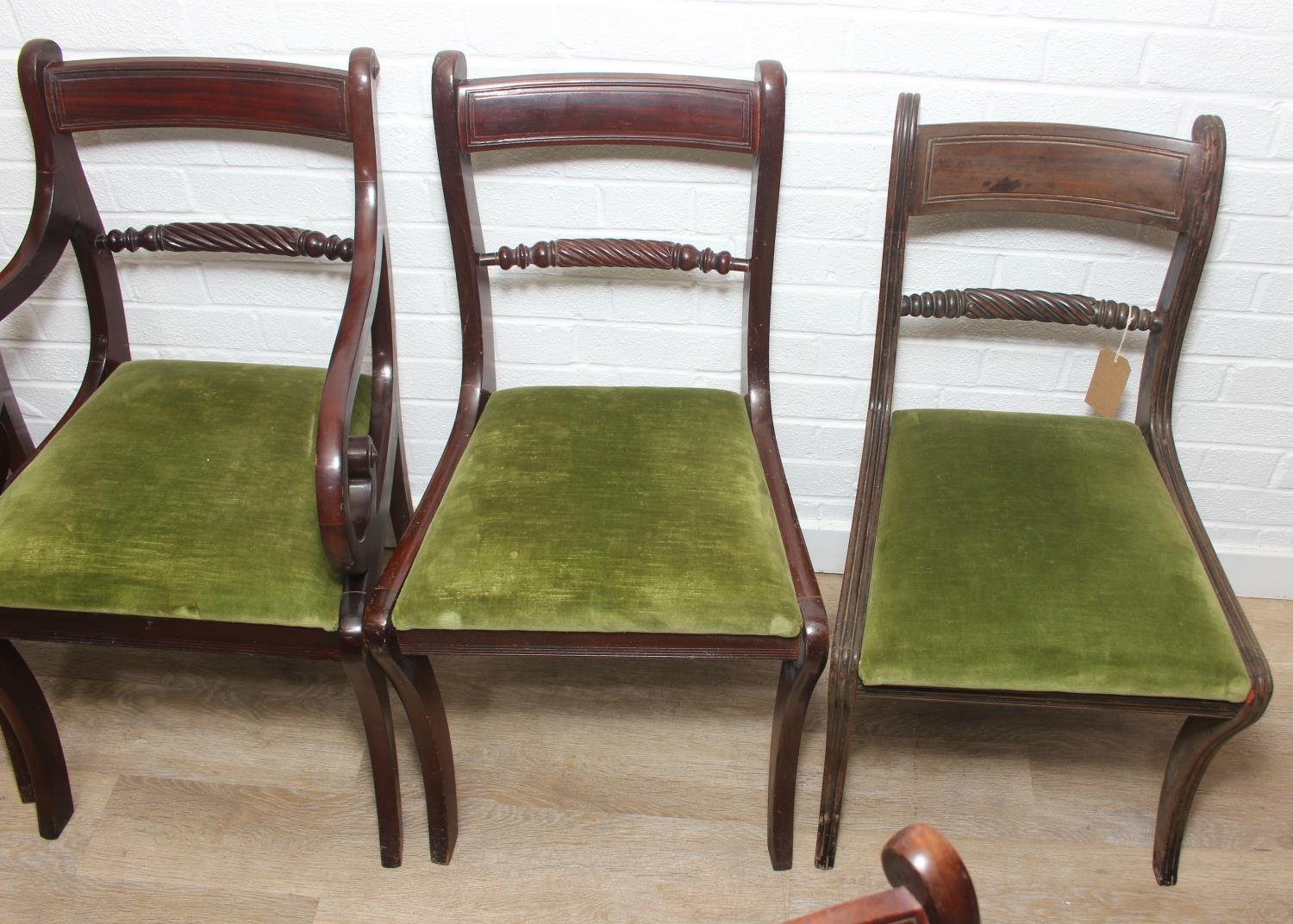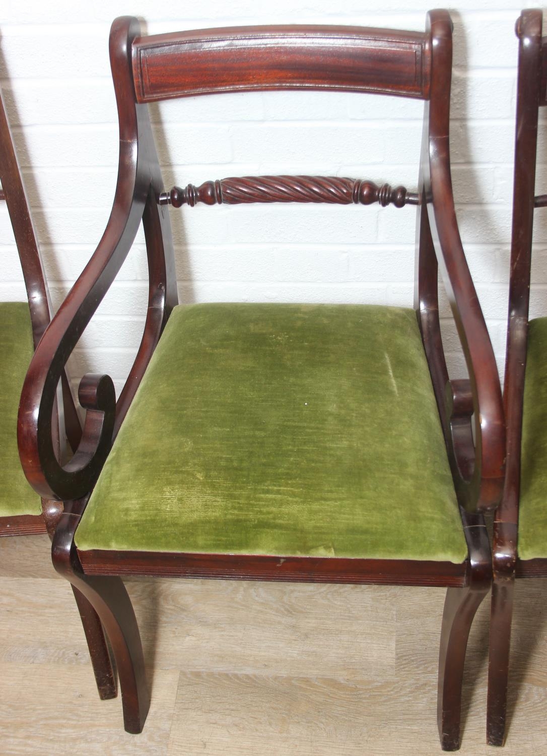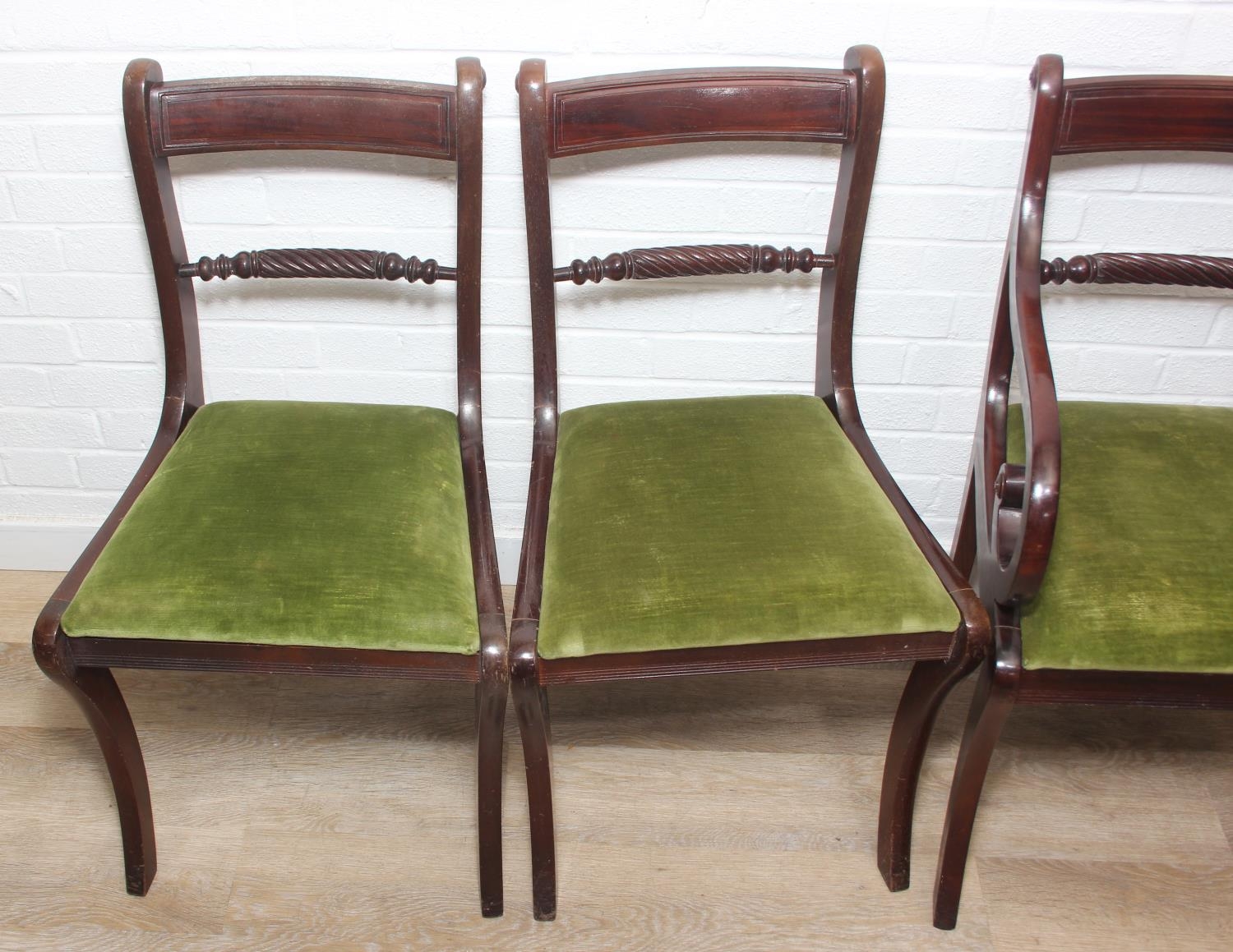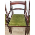 Set of Regency period mahogany dining chairs comprising a set of six plus matching carver, rope twist to centre rail, scroll ends to carver, moss green upholstery, the carver 53cm wide x 85cm tall [7]